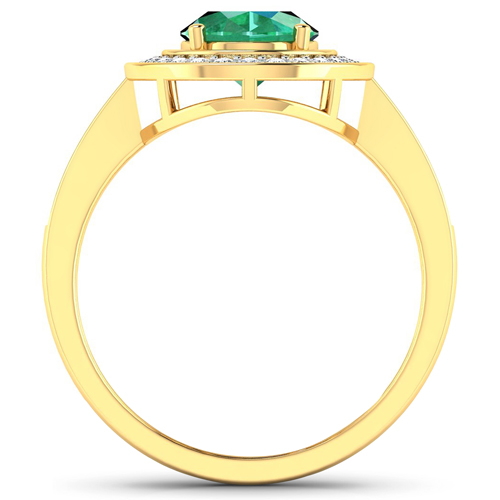 This 14 karat yellow gold ring features a 1.65 carat oval-cut, earth-mined Zambian emerald with approximately .22 carats of round, brilliant-cut, H-I color, I1 clarity diamonds in the floating halo and raised shoulders. The emerald measures approximately 9x7mm and the ring is approximately 1/2" between the knuckles of the finger. The ring is US size 7 and can be sized for an additional charge. It is also eligible for appraisal at a discounted rate, by an independent appraiser (with qualifying credentials from GIA) with no affiliation to Bidfair Fine Jewelry. Please contact Bidfair Fine Jewelry for more information on appraisals and sizing.. This is a brand new item, approved by the manufacturer for sale to the public, by auction. It is in excellent condition, but may have fine scratches from shipping or storage. Admin:Q741/1ghe