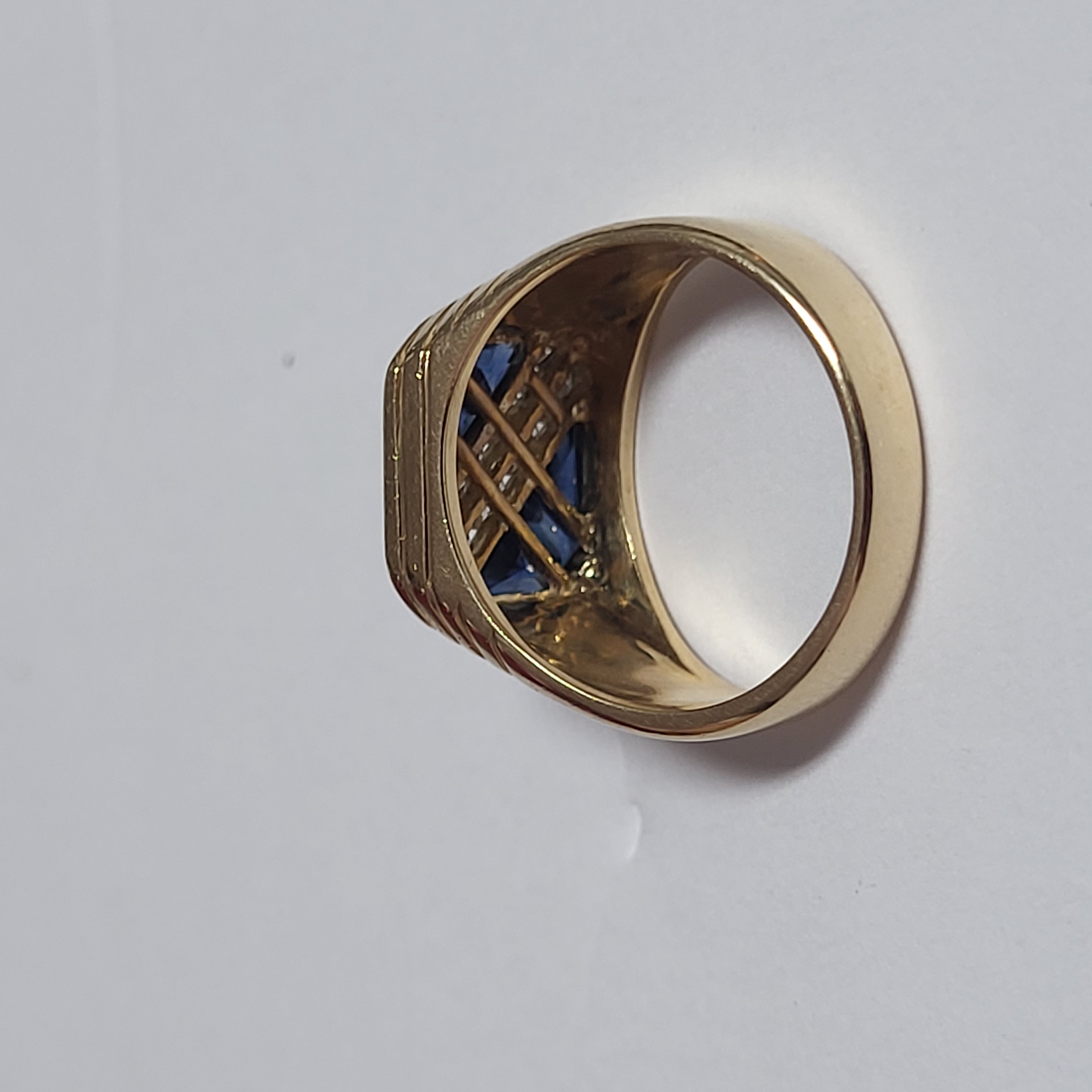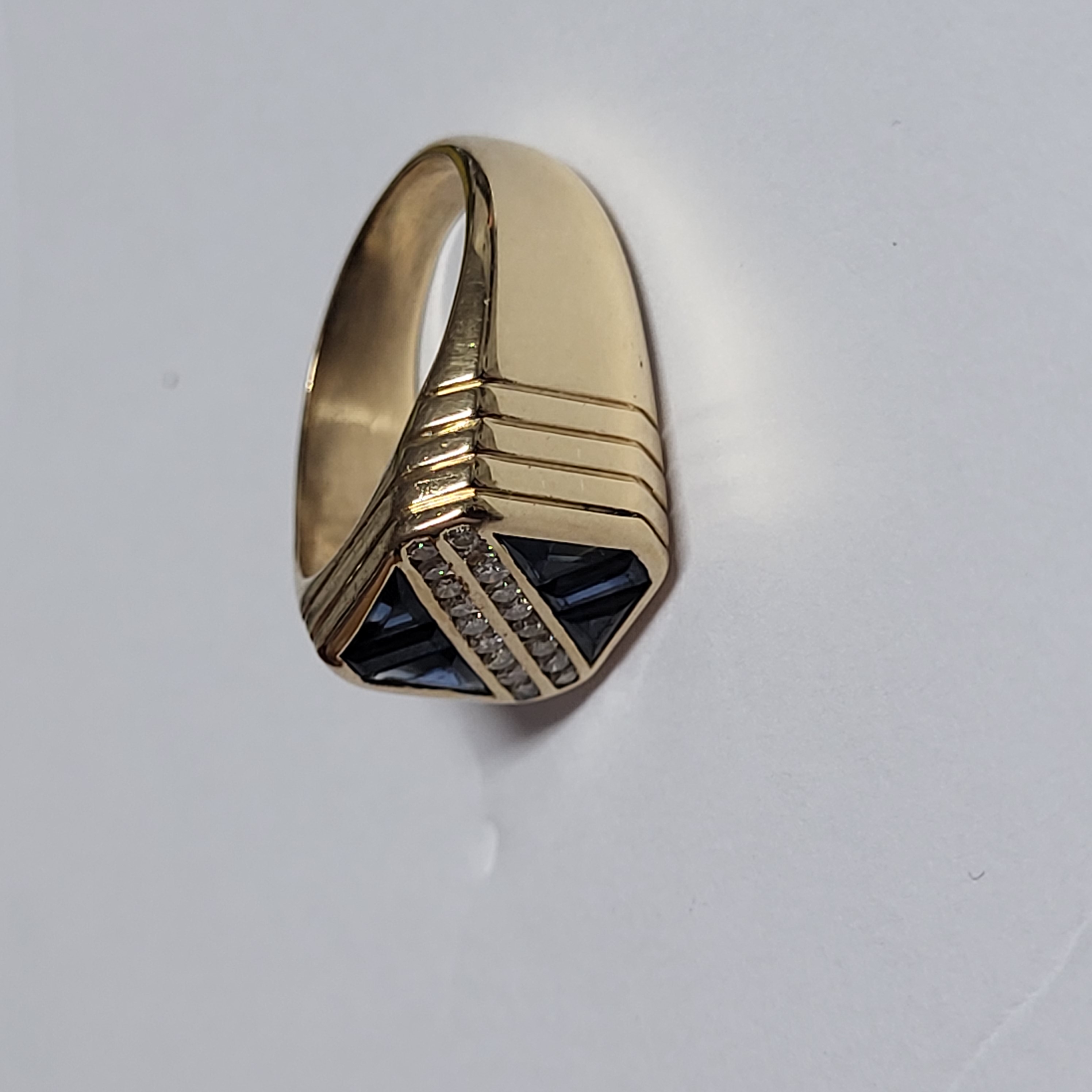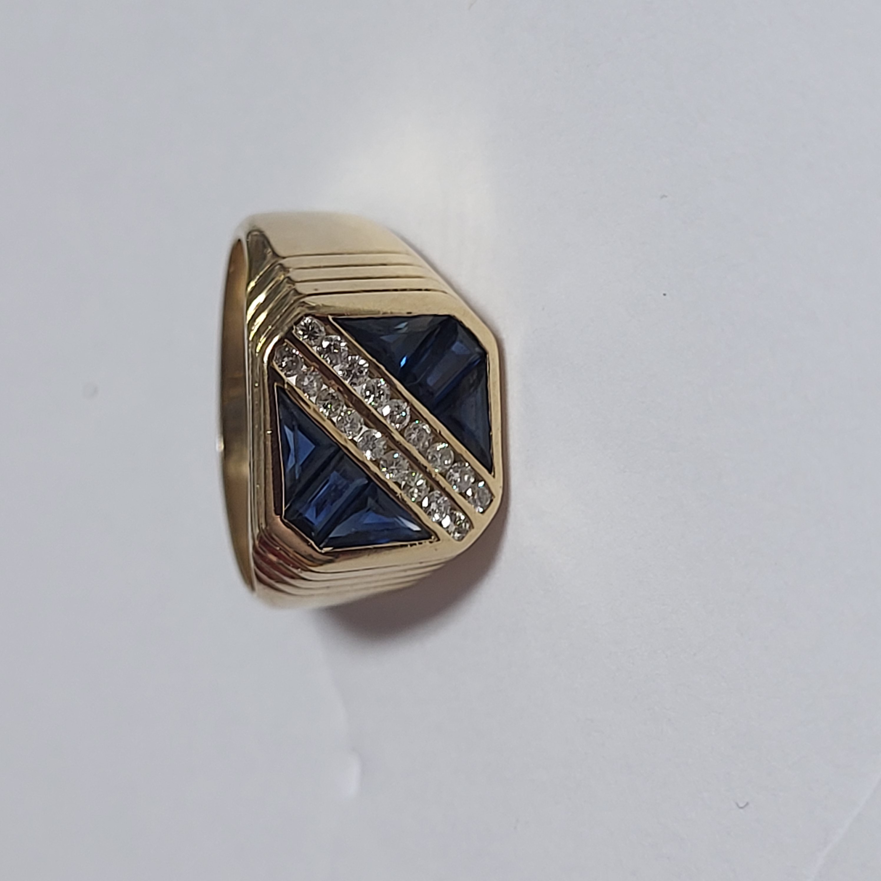 14 karat yellow gold approximately 1.00 carat total weight of trilliant- and baguette-cut invisible-set genuine blue sapphires and approximately .25 carats total weight round, brilliant-cut, approximate H color, SI2 clarity channel-set diamonds arranged diagonally across the center of the ring. a supportive lattice under gallery Top of the ring is approximately 12mm that tapers to an approximate 4mm shank Ribbed shoulders US size 8 and can be sized for an additional charge. Please contact Bidfair Fine Jewelry for sizing details. This item is eligible for appraisal by an independent appraiser (with qualifying credentials from GIA) without affiliation to Bidfair Fine Jewelry, at a discounted rate. Please contact Bidfair Fine Jewelry for more information on appraisals. This is a brand new item that has been held in back stock. It is in excellent condition, but may have minor signs of storage, such as fine scratches or patina. Admin: 33109/25irh