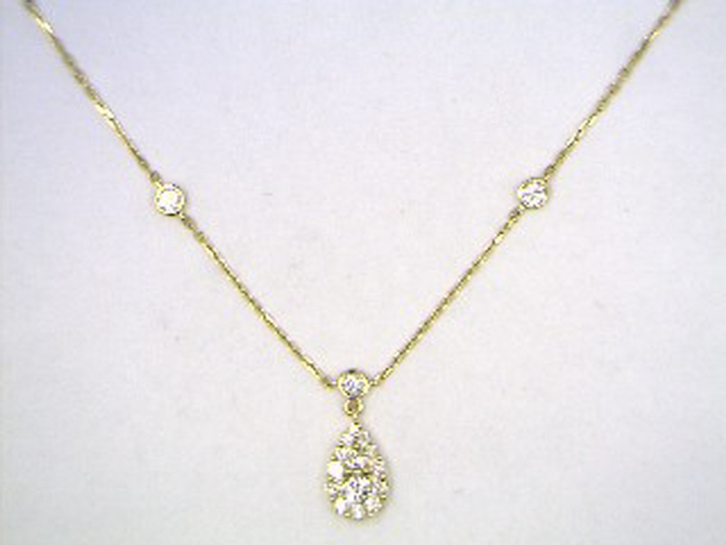 This is an 18 karat yellow gold lavalier type necklace that features .50 carats total weight of round, brilliant-cut, G-H color, SI1-SI2 clarity diamonds, of which some are bezel-set in stations along the fine link chain, and the others are bead-set in the pear-shaped, or teardrop, diamond cluster, which is static. Minimalists love this design for the petite size with a BOLD statement! The chain is approximately 18" long but can adjust to shorter. The closure is a lobster clasp. This item is eligible for appraisal at a discounted rate, from an independent appraiser (with qualifying credentials from GIA) with no affiliation to Bidfair Fine Jewelry. Please contact Bidfair Fine Jewelry for more information on appraisals, This is a brand new item with manufacturer’s approval to sale in a public auction. It is in excellent condition, but may have fine scratches from shipping or storage. Admin: G11241/47elt
