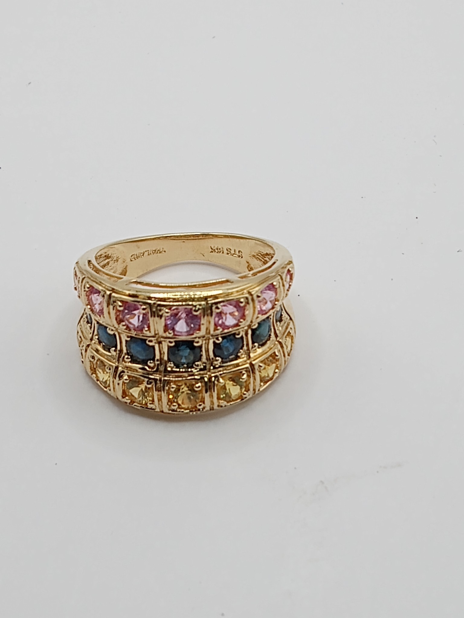 14 karat yellow gold and genuine yellow sapphire and genuine blue sapphire genuine pink sapphire graduating in size 4.00 carats total weight approximately tapered band from 14mm to 4mm US size 7 and can be sized for an additional charge. Please contact Bidfair Fine Jewelry for sizing details. This item is eligible for appraisal by an independent appraiser (with qualifying credentials from GIA) without affiliation to Bidfair Fine Jewelry, at a discounted rate. Please contact Bidfair Fine Jewelry for more information on appraisals.