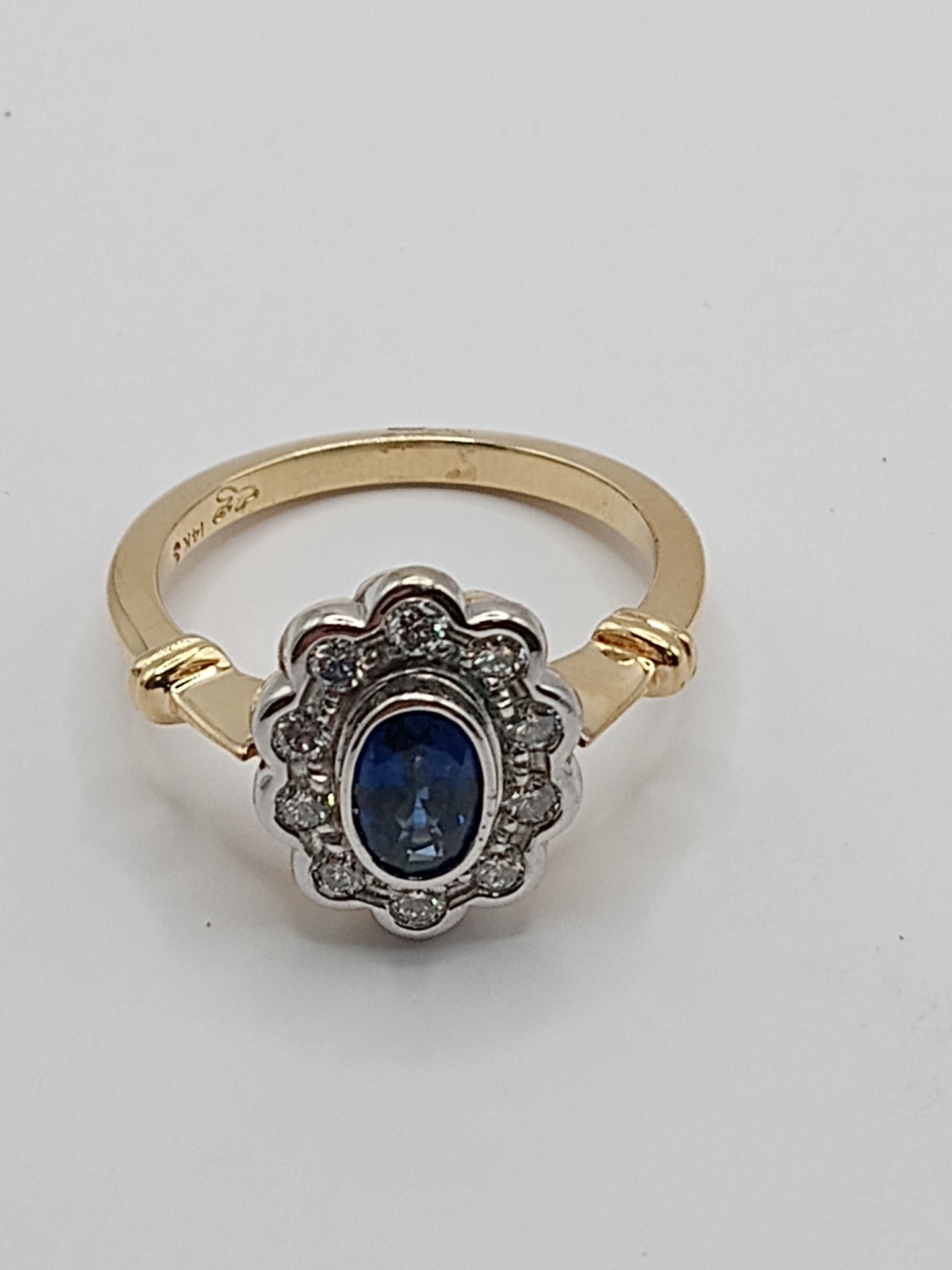 This is a 14 karat yellow and white gold ring that features an approximate .70 carat oval-cut, bezel-set, genuine midnight blue sapphire that is inside a scalloped halo of approximately .25 carats total weight round, brilliant-cut, approximate H color, SI2-I1 clarity diamonds. The setting and gallery are quite unique, in that the diamond halo is set in white gold above a separate unit of yellow gold and a petal-like gallery. The knife-edge shank and cathedral shoulders are adorned with a ribbed binding decor and taper to an approximate 2mm shank. The ring has a very solid feel and bears the "S" (Stuller) hallmark. It also bears the "GB" (Gordon Brothers) hallmark. This ring is US size 6 and can be sized for an additional charge. This item is eligible for appraisal by an independent appraiser (with qualifying credentials from GIA) without affiliation to Bidfair Fine Jewelry, at a discounted rate. Please contact Bidfair Fine Jewelry for more information on appraisals. This is a brand new item that has been held in back stock. It is in excellent condition, but may have minor signs of storage, such as fine scratches or patina. Admin:33109/18lhe