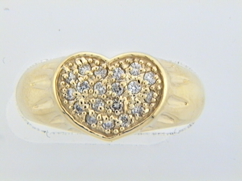 , This is a 14 karat yellow gold ring that features a heart-shaped, flat surface, lifted from the polished shank by Belcher-like textured ridges, and covered with .25 carats total weight round, brilliant-cut, H color, SI2-I1 clarity pave’ set diamonds. The ring is US size 6.75 and can be sized for an additional charge. Please contact Bidfair Fine Jewelry for sizing details. This is a brand new item with manufacturer’s approval to sale in a public auction. It is in excellent condition, but may have fine scratches from shipping or storage. Admin: G11241/24net