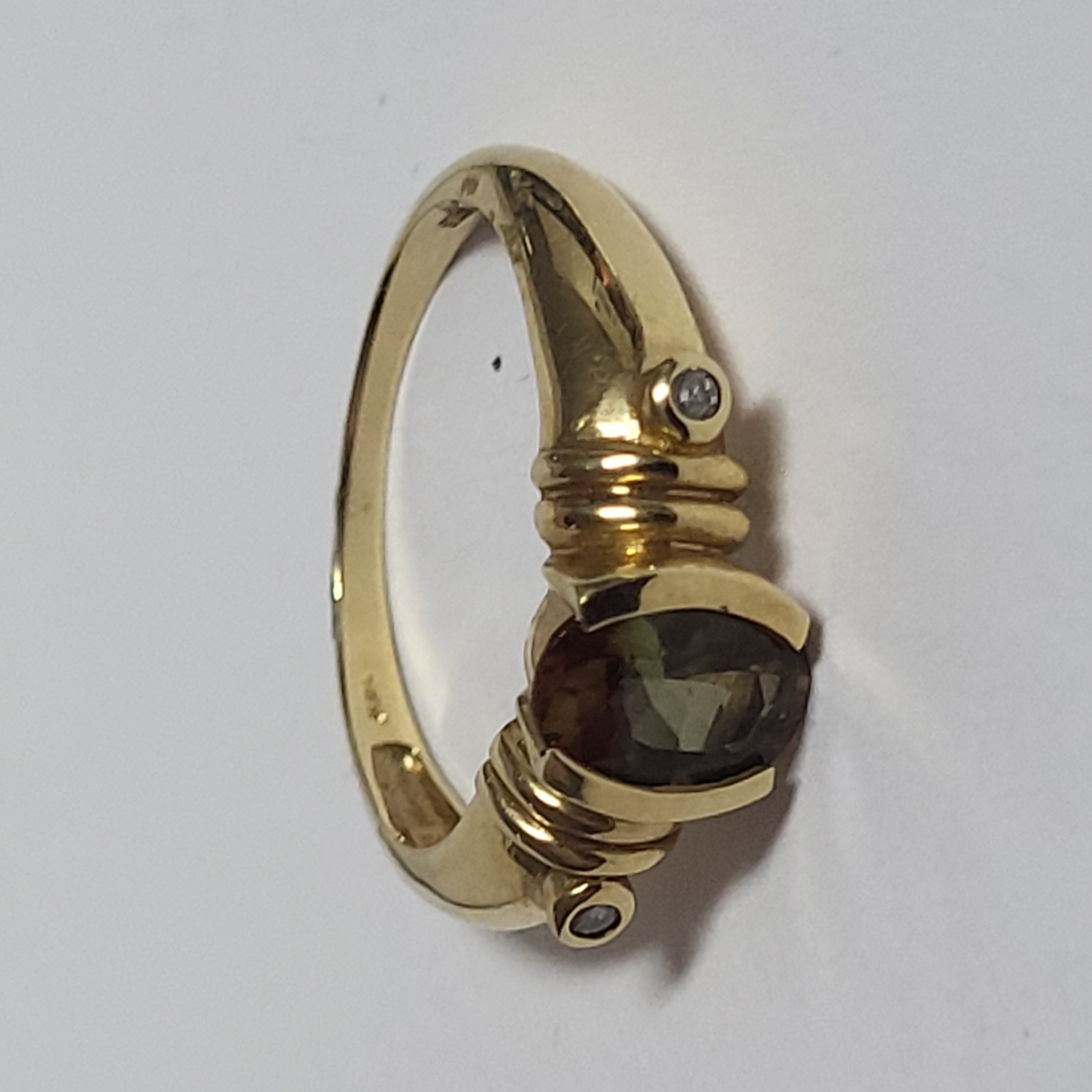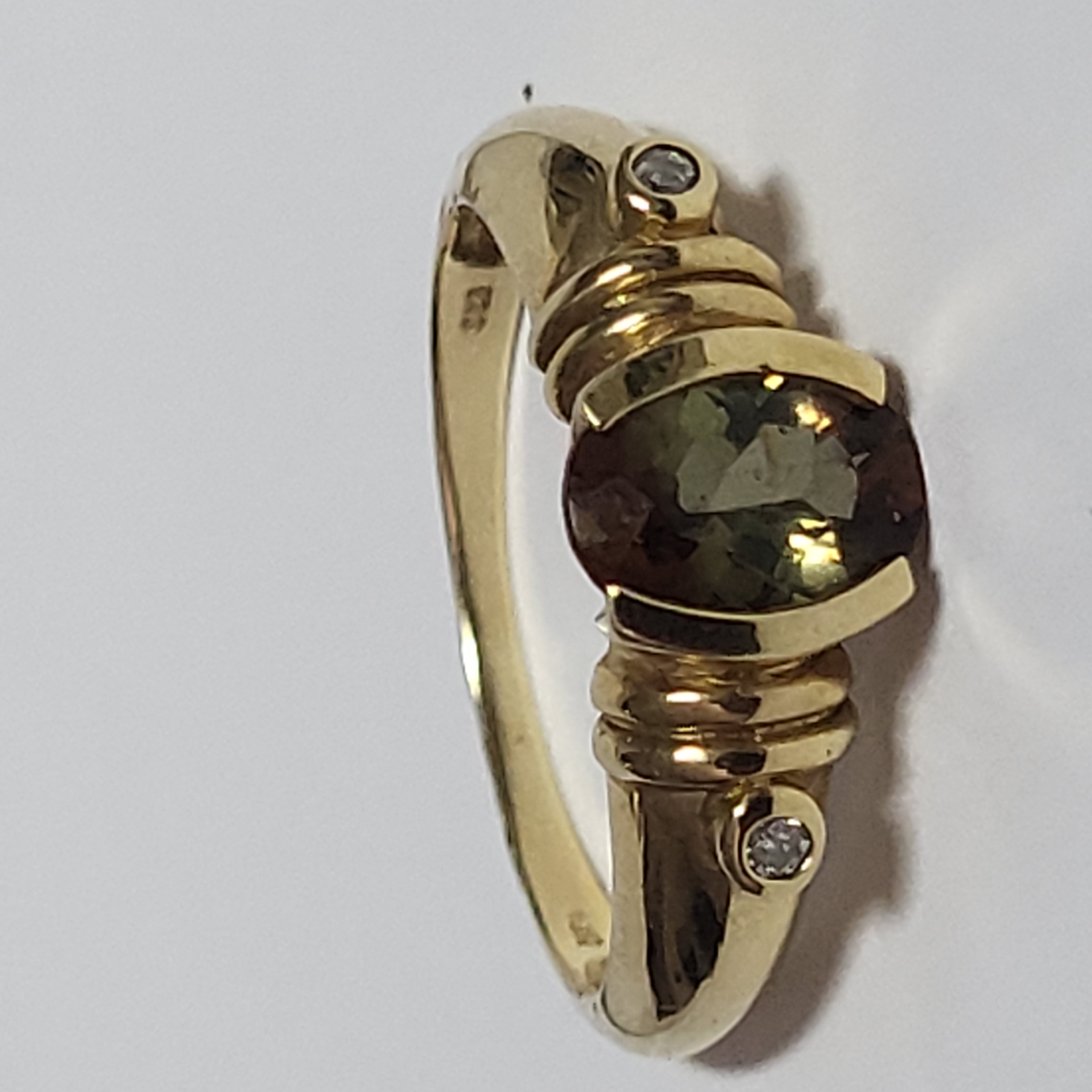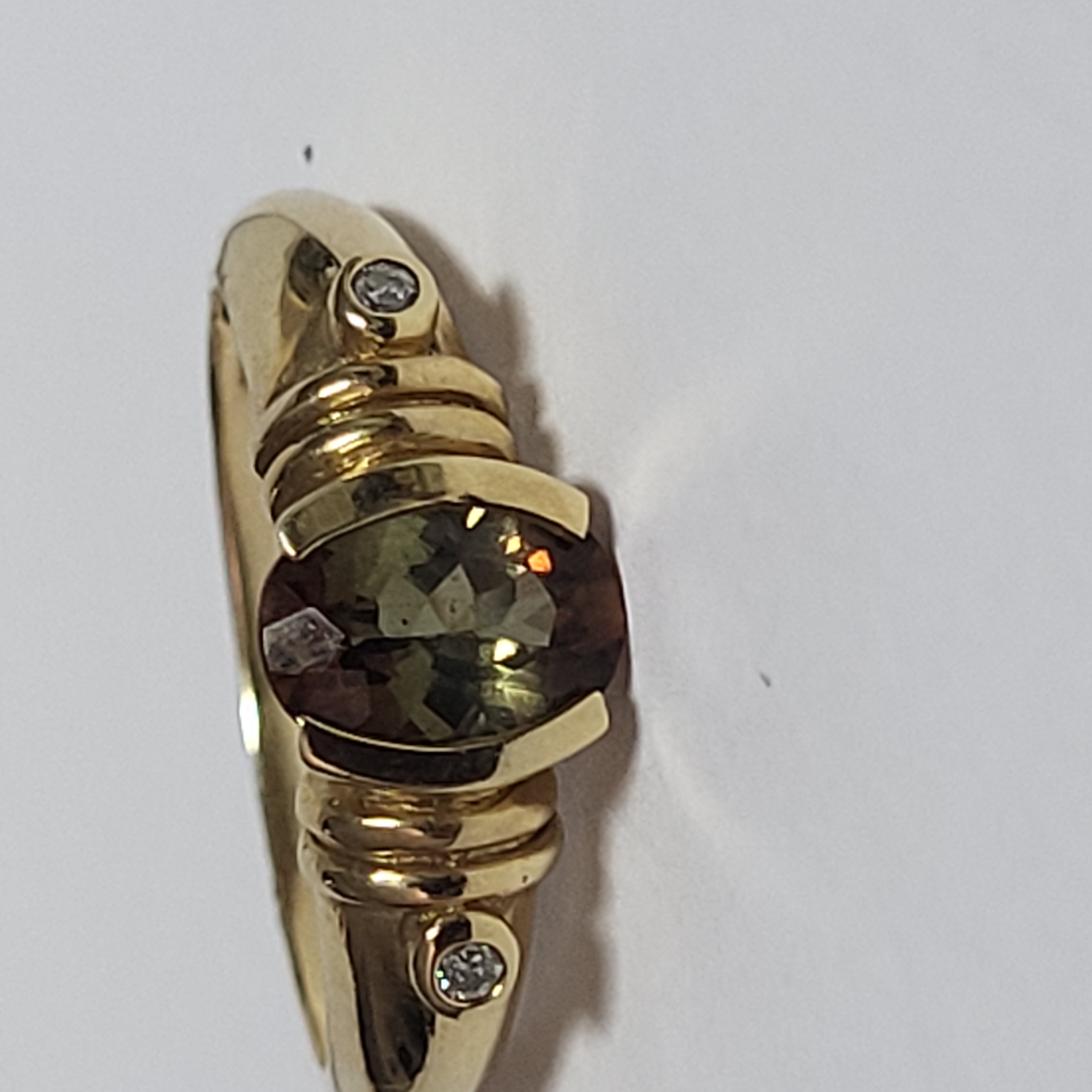 14KY ring with an approx 8x6mm oval-cut, semi-bezel set, genuine Andalusite and approx .04ctw round, brilliant-cut, approx H, SI2 diamonds on ribbed, knife-edge shoulders. Size 9.