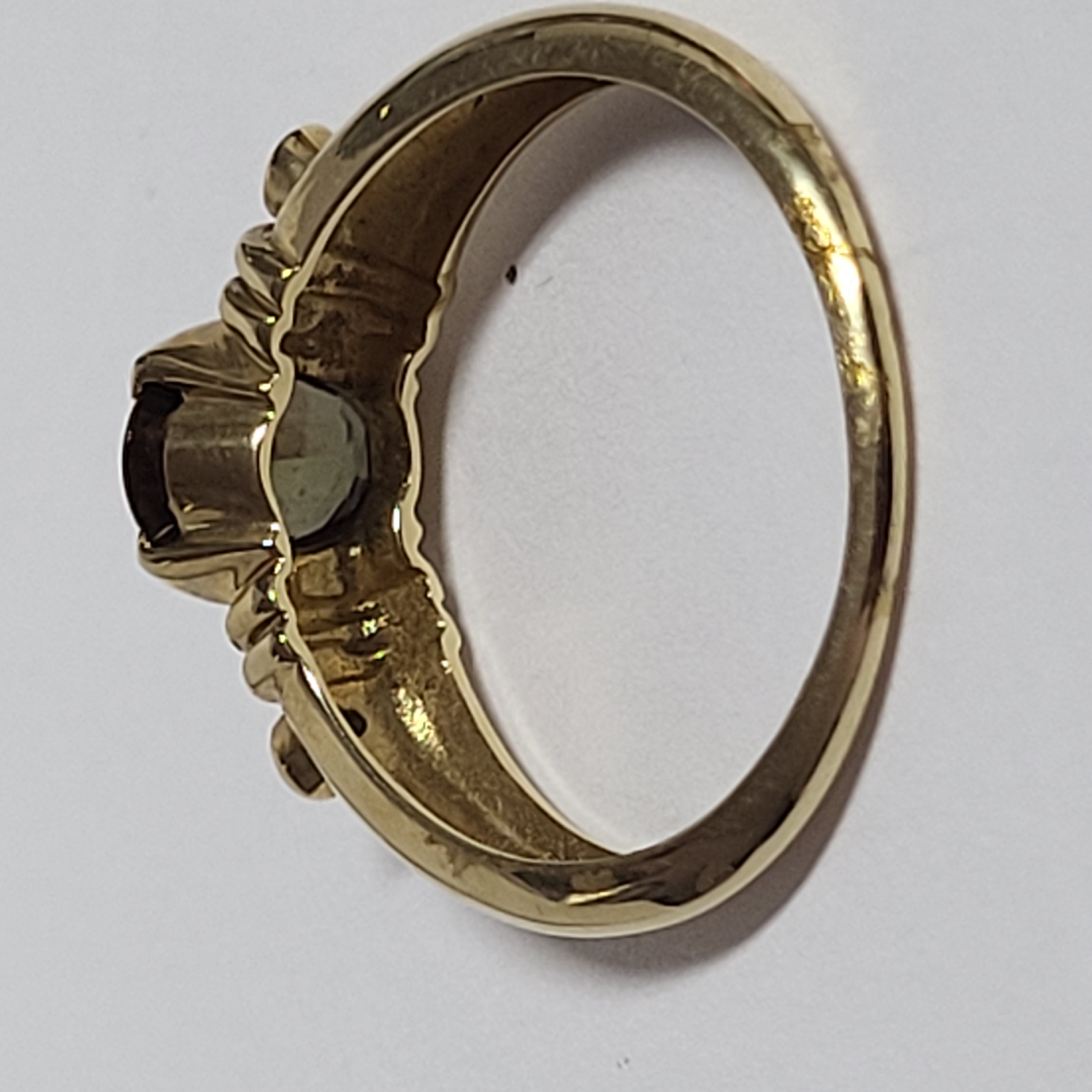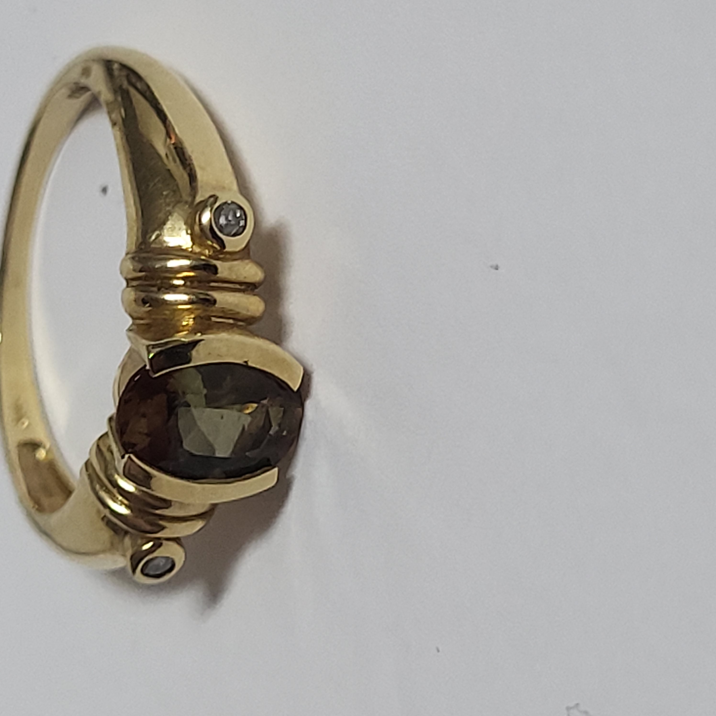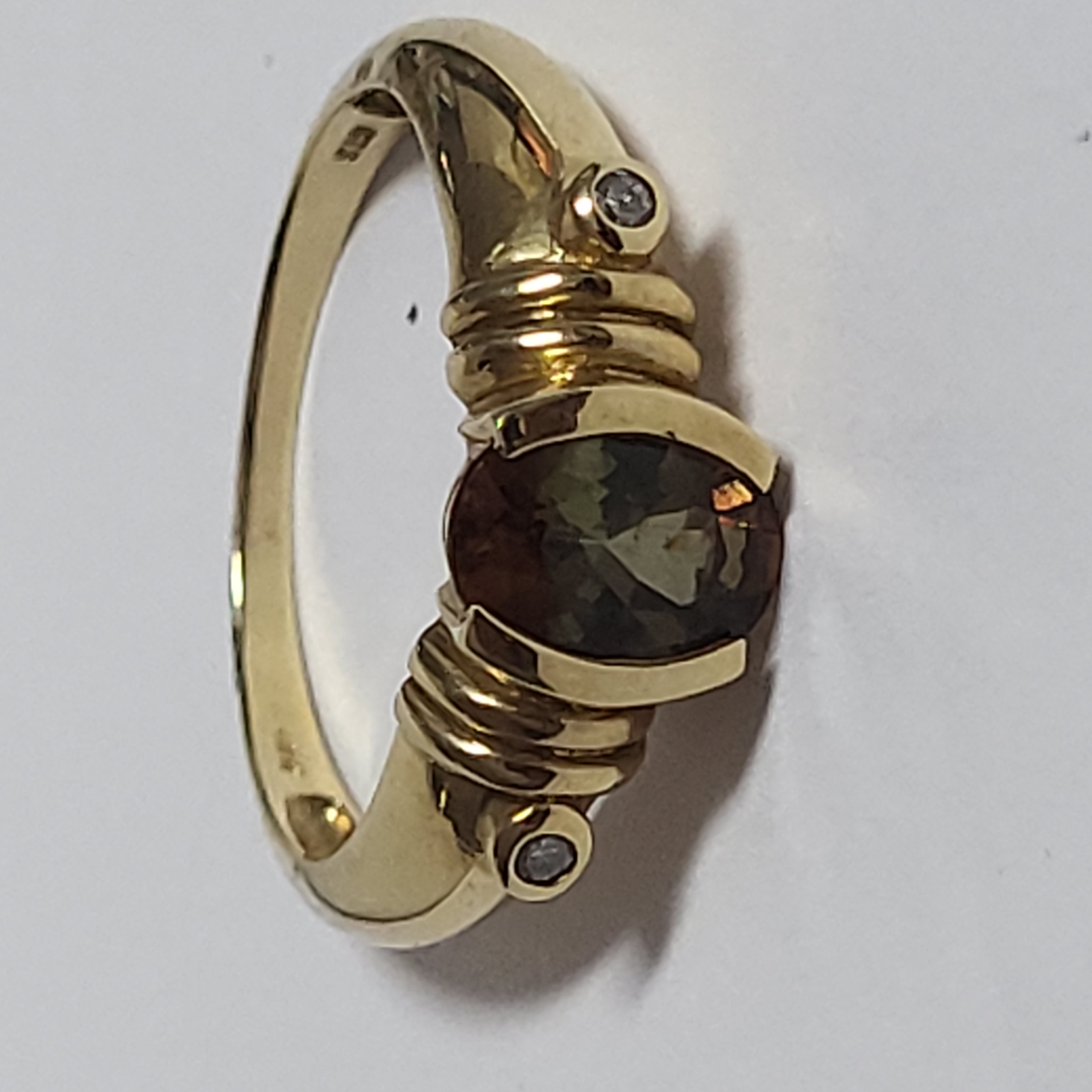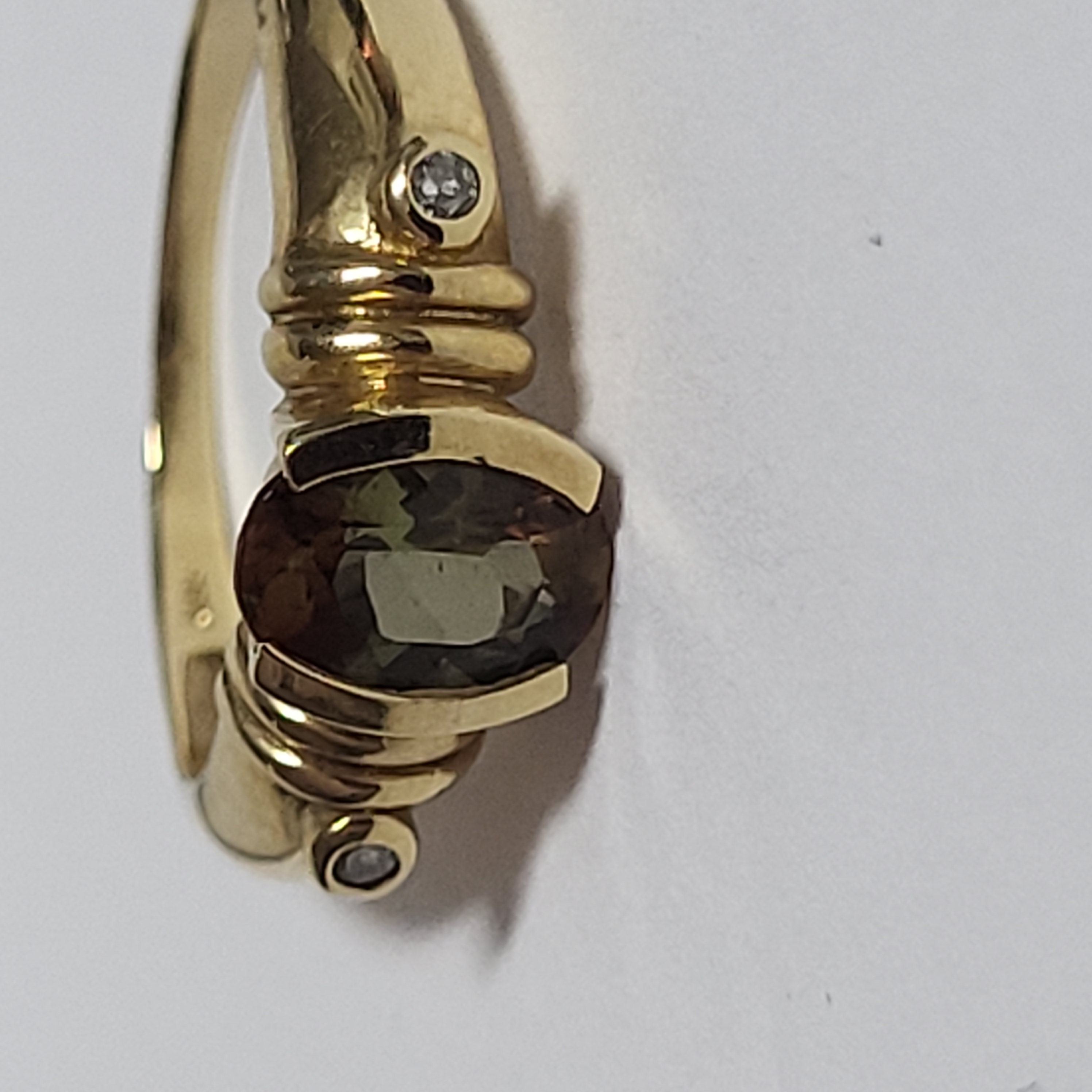 14KY ring with an approx 8x6mm oval-cut, semi-bezel set, genuine Andalusite and approx .04ctw round, brilliant-cut, approx H, SI2 diamonds on ribbed, knife-edge shoulders. Size 9.