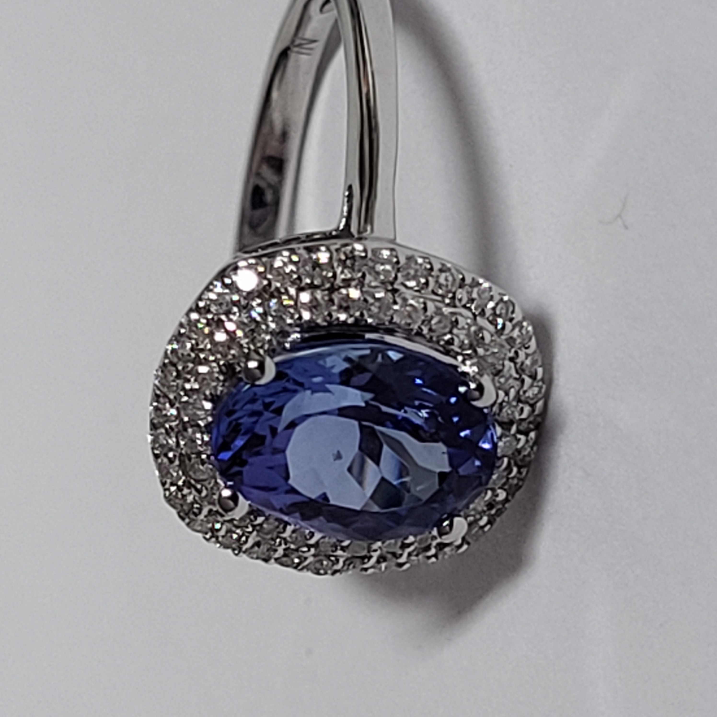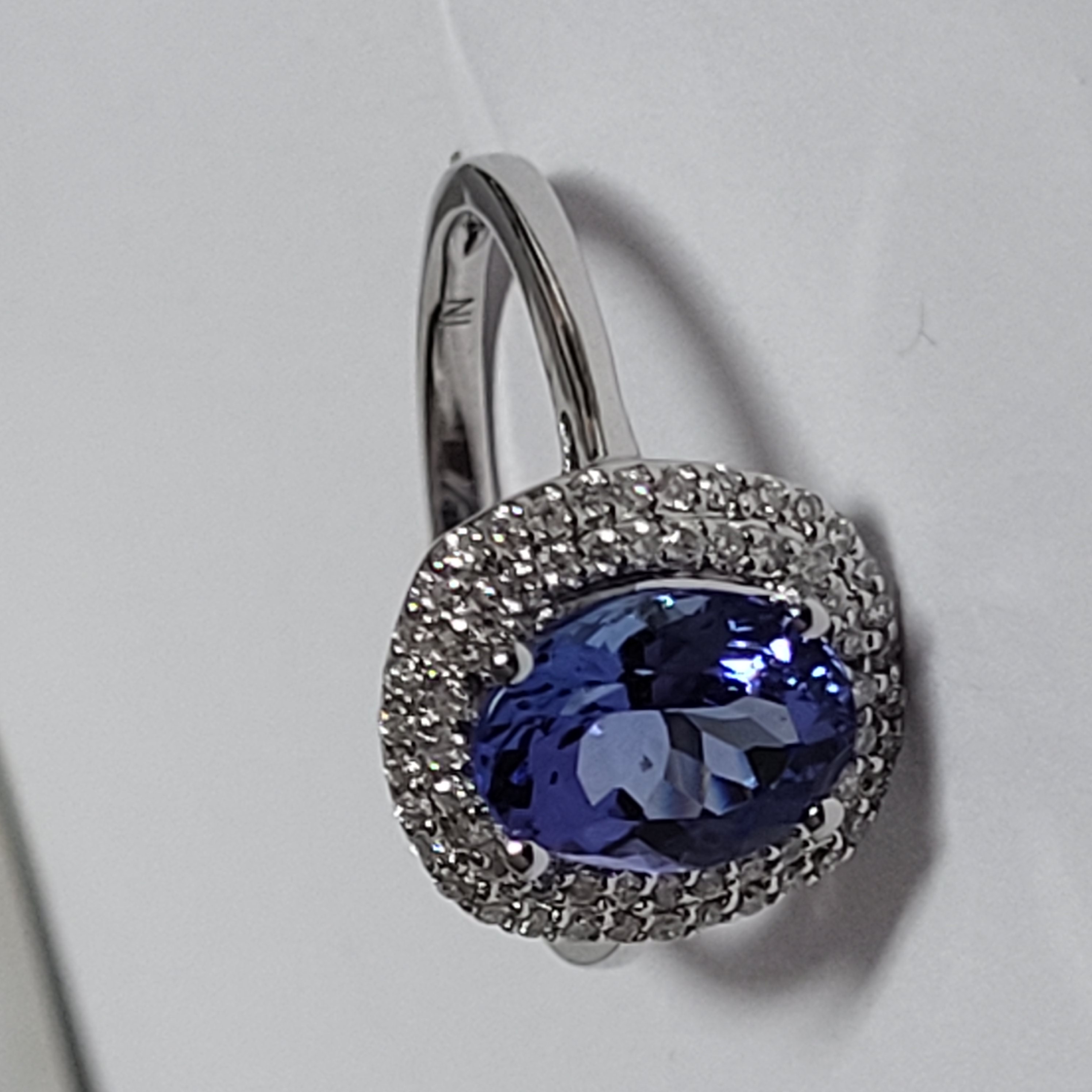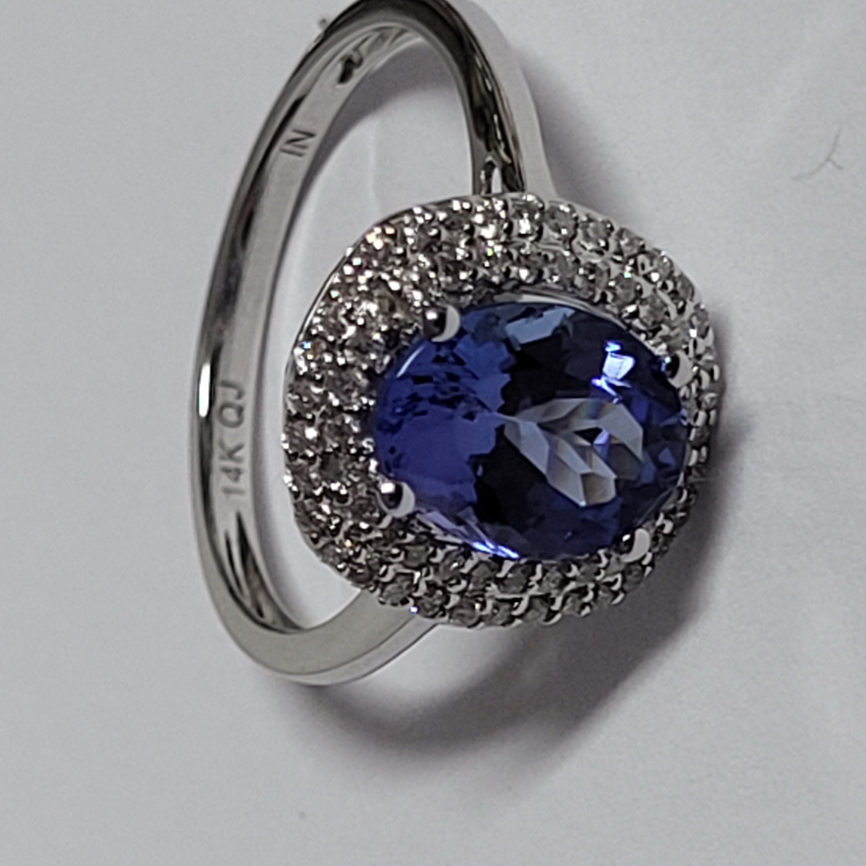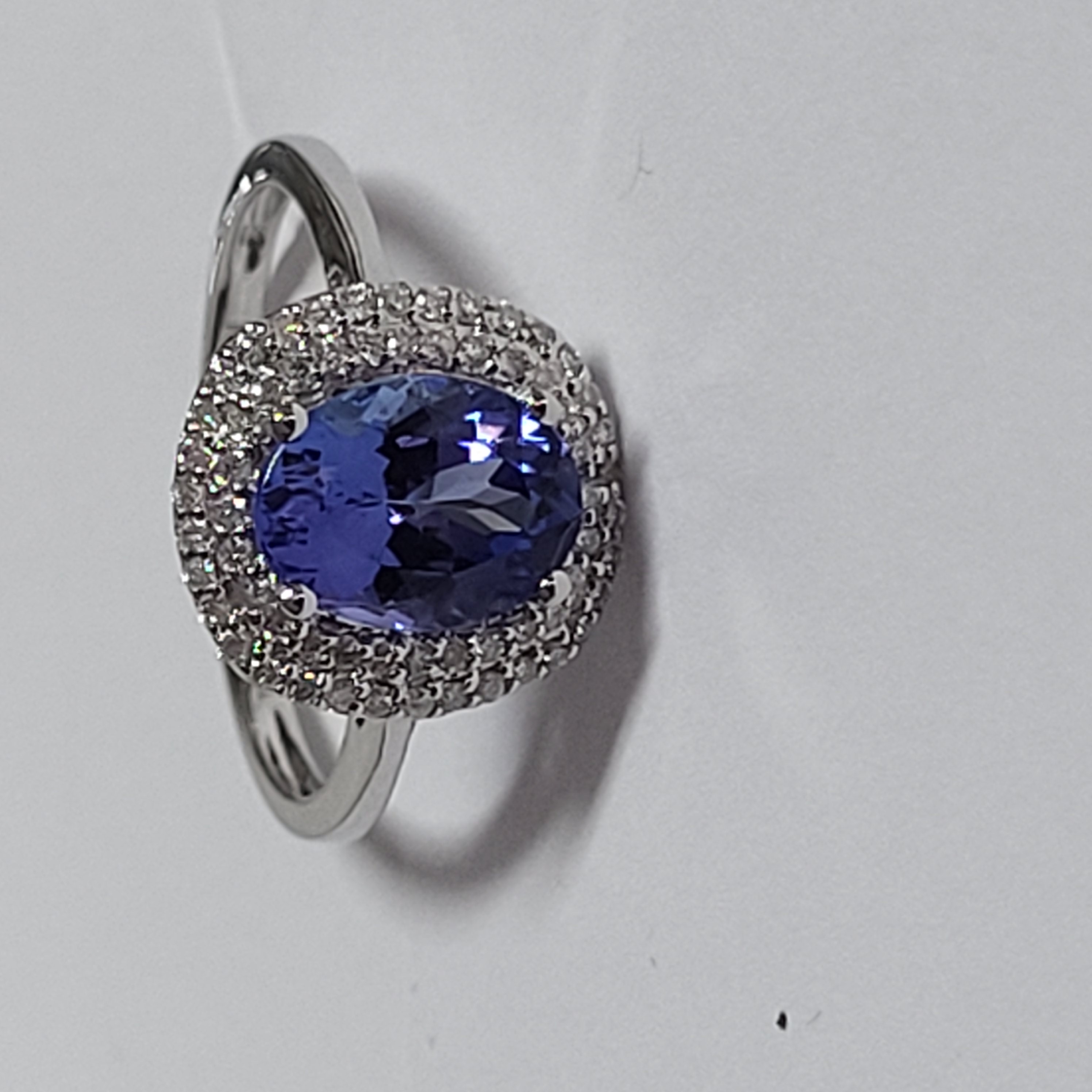 14 karat white gold approximate 1.60 carat oval-cut, violet-blue colored, genuine tanzanite is prong-set with approximately .28 carats total weight round, brilliant-cut, H-I color, I1 clarity diamonds in the double halo. The raised shoulders are smooth, polished and taper to an approximate 2mm shank. This ring is US size 7 and can be sized for an additional charge. Please contact Bidfair Fine Jewelry for sizing details. and can be sized for an additional charge. Please contact Bidfair Fine Jewelry for sizing details. This is a brand new item, with approved from the manufacturer for sale to the public, by auction. It is in excellent condition, but may have fine scratches from shipping or transportation. Admin: Q741/45nte