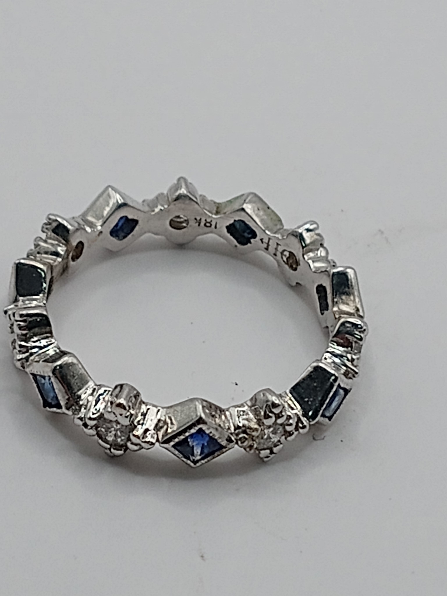 18 karat white gold Art-Deco appeal approximately 1.00 carat total weight of diamonds and sapphires G-H, SI2 approximately 4mm wide. There are no sizing options offered with this ring. This item is eligible for appraisal by an independent appraiser (with qualifying credentials from GIA) without affiliation to Bidfair Fine Jewelry, at a discounted rate. Please contact Bidfair Fine Jewelry for more information on appraisals.