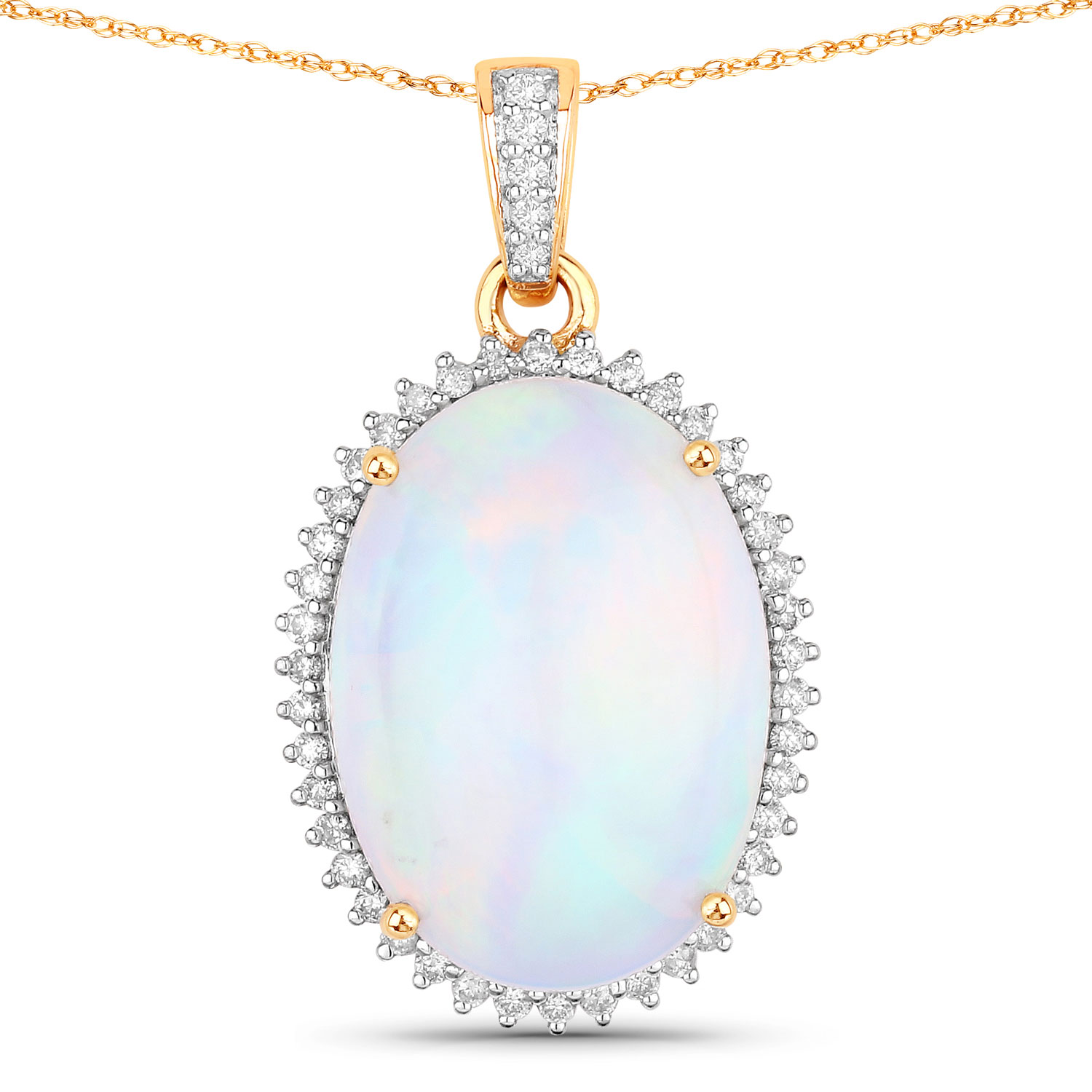 14 karat yellow gold 6.84 carat oval, cabochon polished Ethiopian Opal with sensational fire and .21 carats total weight round, brilliant-cut, H-I color, I1 clarity diamonds in the solid ribbon bail and halo. The pendant is approximately 1" long and has a supportive, designer gallery and ribbed raised gallery. This item is eligible for appraisal by an independent appraiser (with qualifying credentials from GIA) without affiliation to Bidfair Fine Jewelry, at a discounted rate. Please contact Bidfair Fine Jewelry for more information on appraisals. This is a brand new item, with approved from the manufacturer for sale to the public, by auction. It is in excellent condition, but may have fine scratches from shipping or transportation. Admin:Q741/21geh