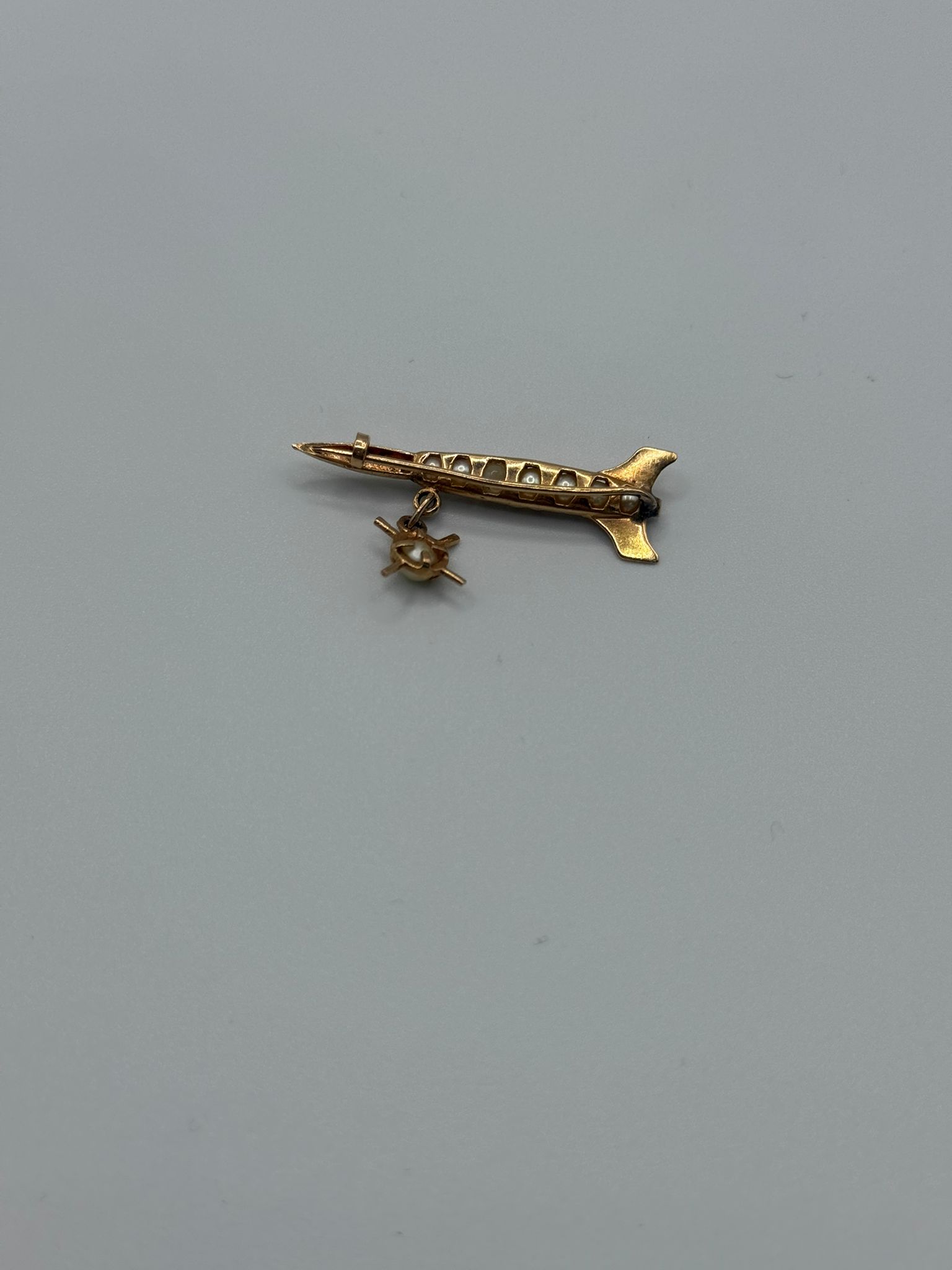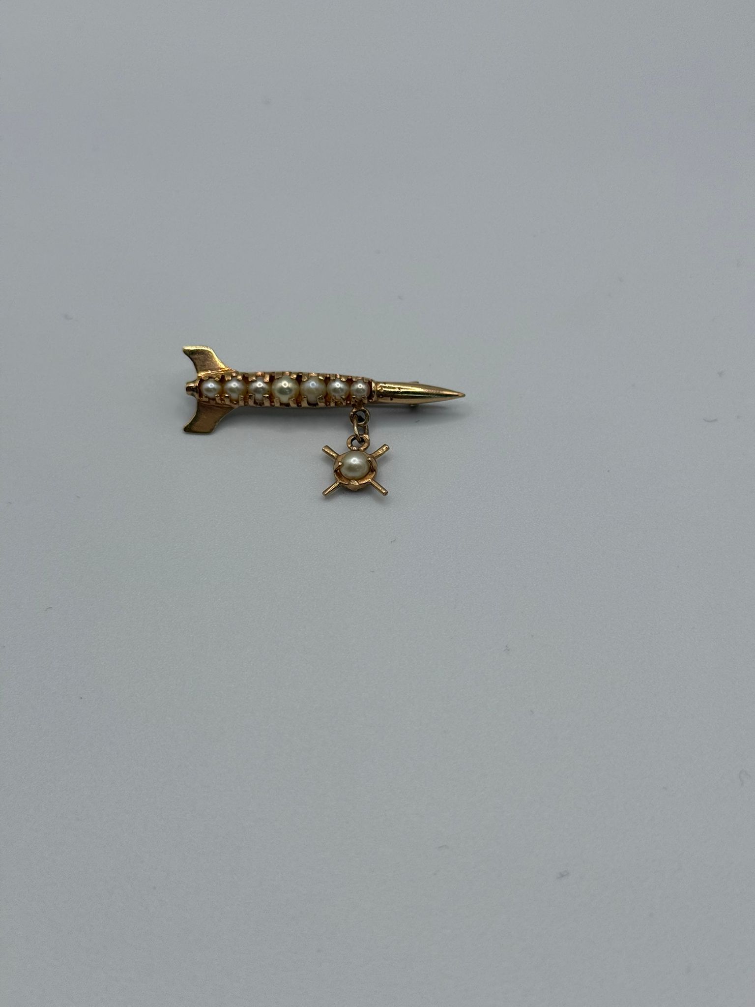 This is a 14 karat yellow gold brooch/pin depicting a spaceship or rocket, such as Explorer 1 or Mercury Freedom 7. This 1" pin features 8 round, white, cultured pearls that range in size from 2mm to 4mm. The details are superb! The pin is fitted with an adorned accessory of the 8th pearl in a starlike frame. The pin has a locking "C" clasp closure and is believed to have been crafted in the late 1940’s to mid-1950’s. This is an estate item that is in very good condition, with only signs of wear typical of jewelry from its era. Admin: C31995/21lhh