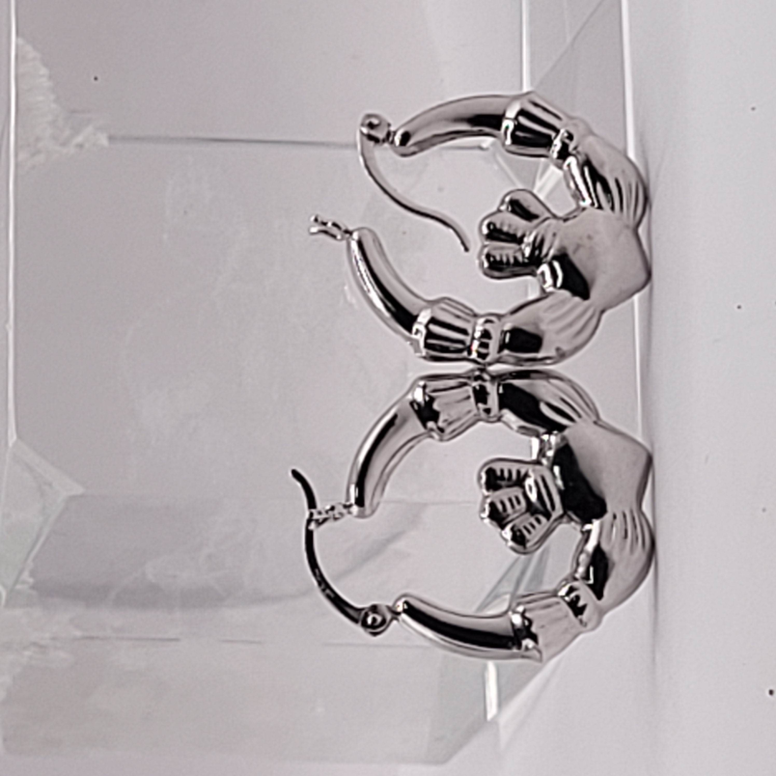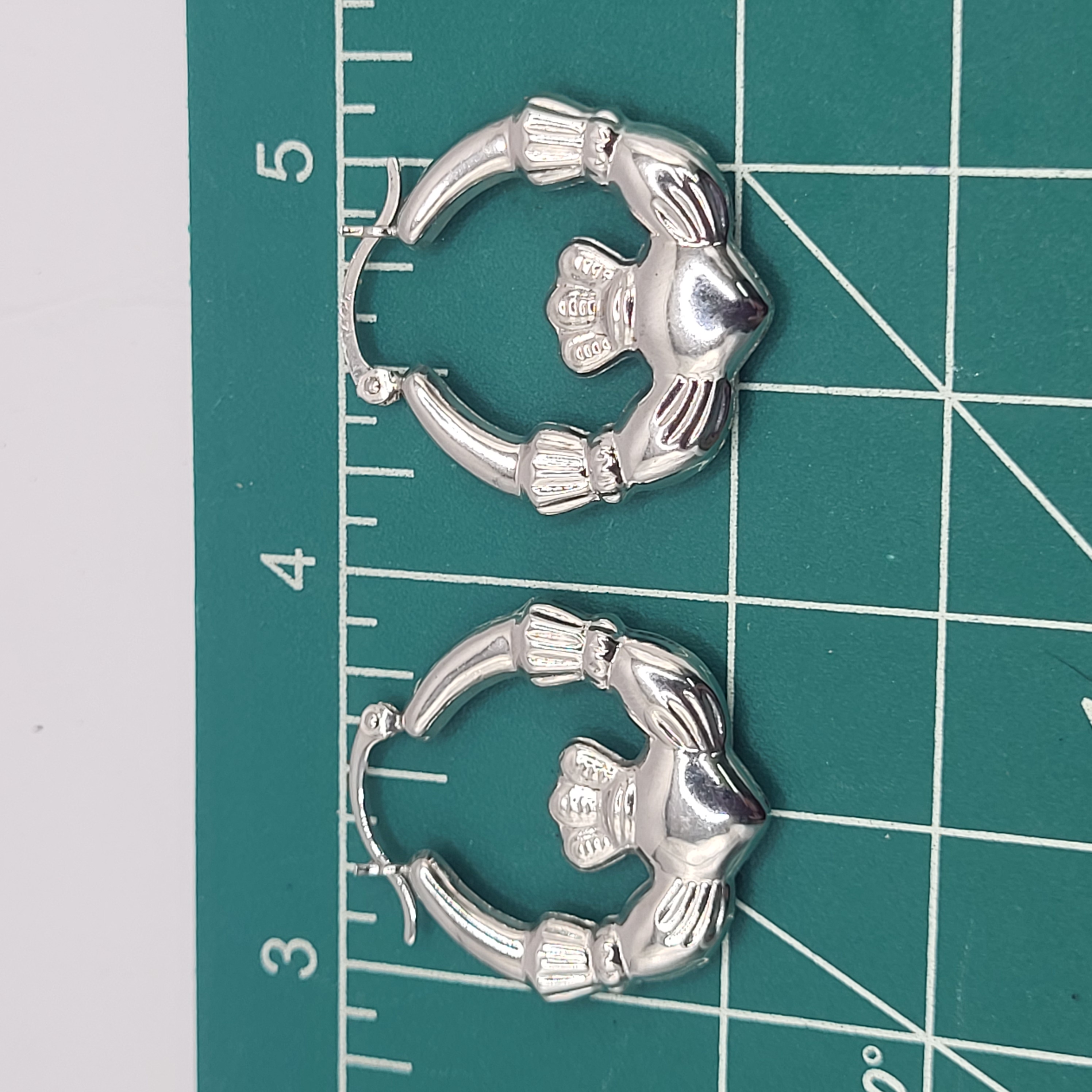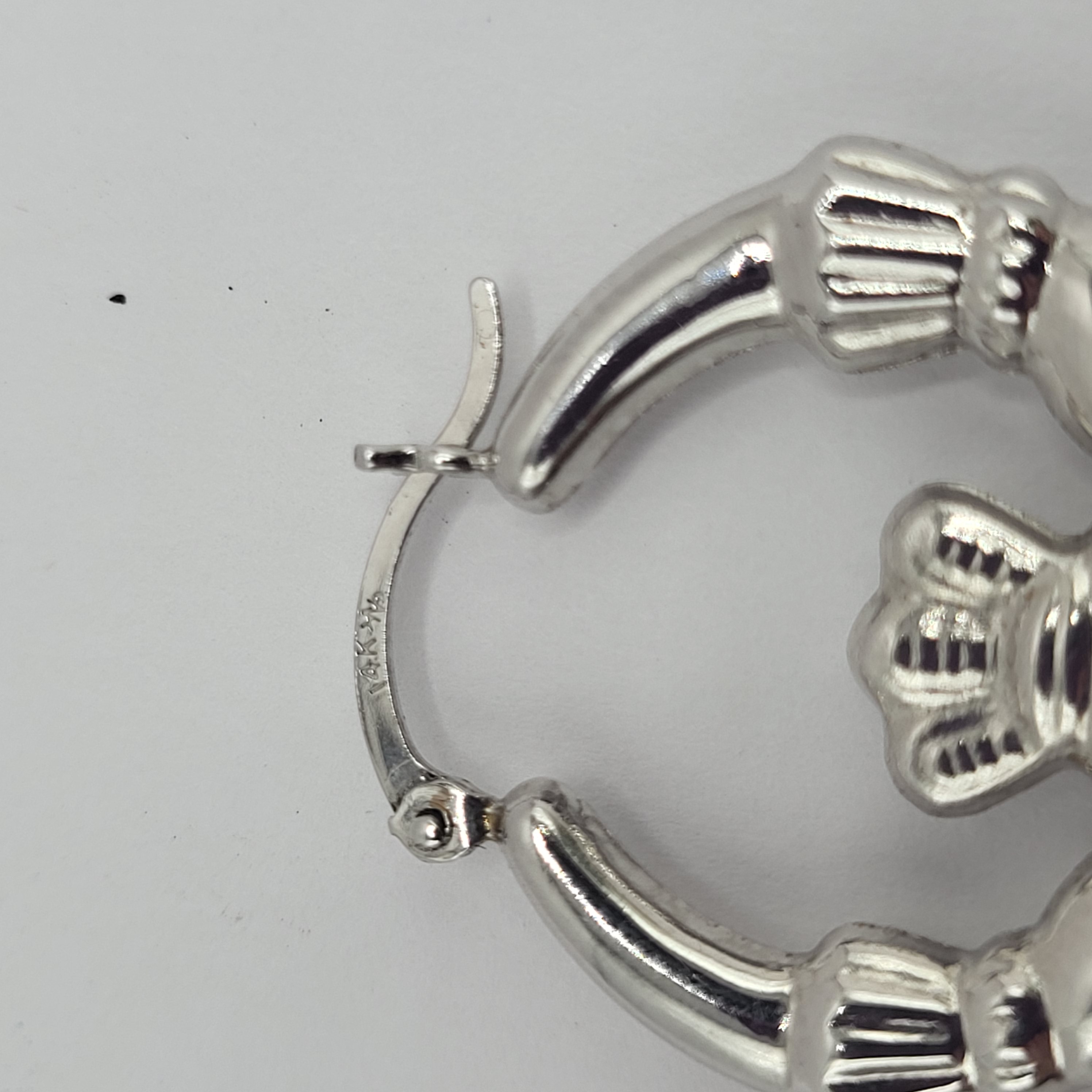 The claddagh is worldwide recognized symbol of love that originated in Ireland nearly 500 years ago! (Read more about the claddagh below.) These 14 karat white gold hoop earrings are designed as "Claddagh" symbol and have hinged bar closures. They are approximately 3/4" diameter and weigh 1.4 grams total (less than one gram each) for a light, comfortable wear. These are brand new earrings that have been held in back stock. They are in excellent condition, but may have minor signs of storage, such as fine scratches or patina. Admin: 33110/27ea