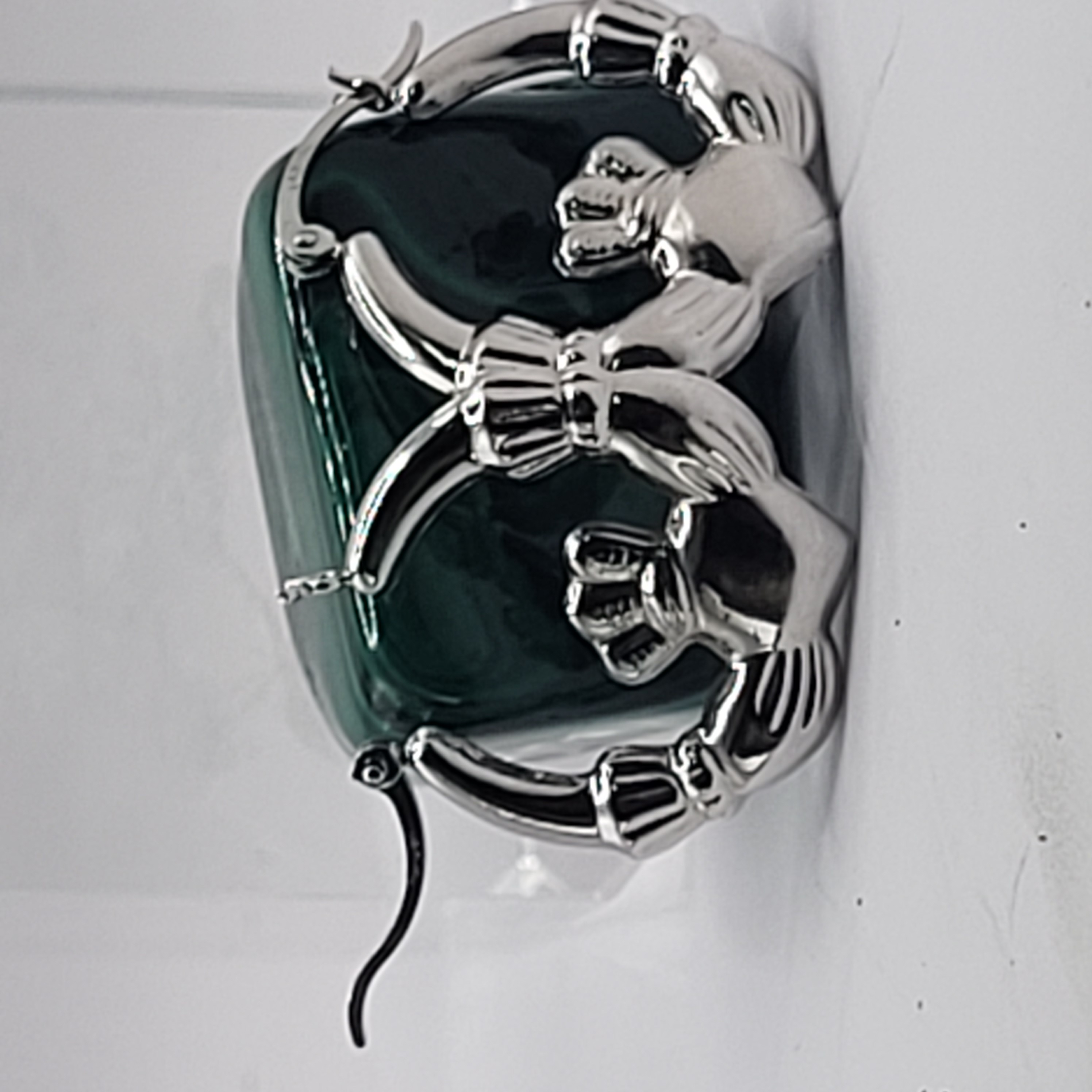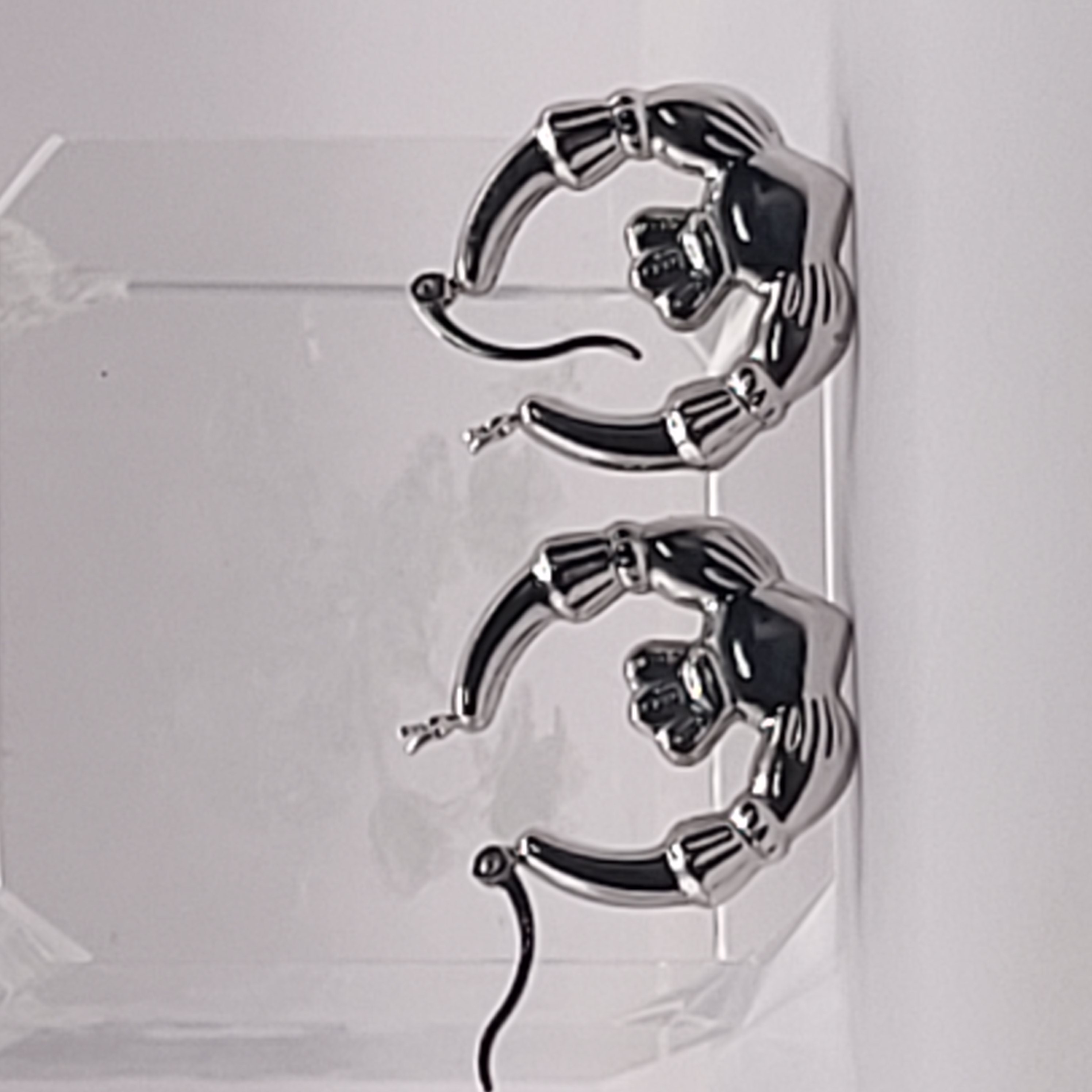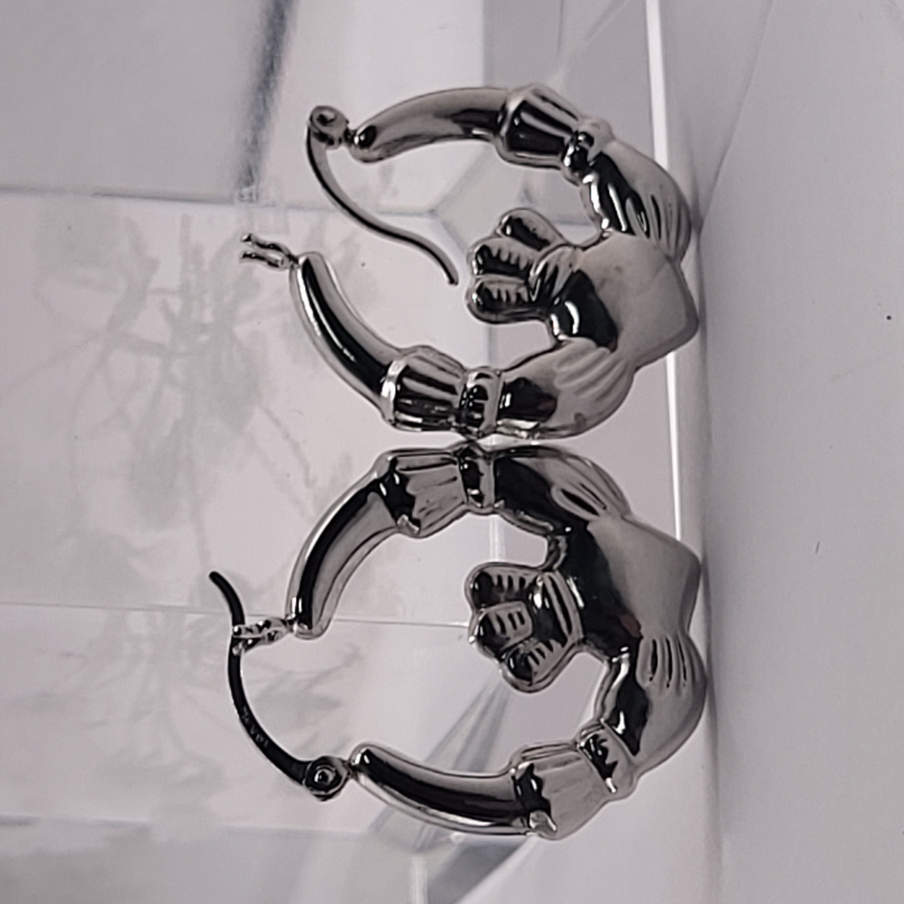 The claddagh is worldwide recognized symbol of love that originated in Ireland nearly 500 years ago! (Read more about the claddagh below.) These 14 karat white gold hoop earrings are designed as "Claddagh" symbol and have hinged bar closures. They are approximately 3/4" diameter and weigh 1.4 grams total (less than one gram each) for a light, comfortable wear. These are brand new earrings that have been held in back stock. They are in excellent condition, but may have minor signs of storage, such as fine scratches or patina. Admin: 33110/27ea