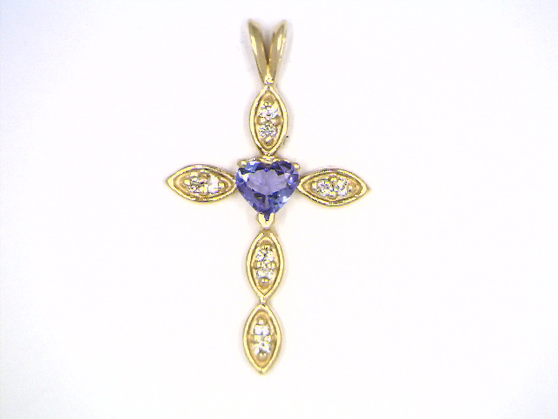 This is a 14 karat yellow gold cross pendant with an approximate .55 carat heart-cut, prong-set, genuine tanzanite and approximately .20 carat total weight of round, brilliant-cut, H, SI2-I1 clarity diamonds on the rail and arms. The cross is approximately 1.25" tall and 7/8" wide and the rabbit ear bail can accommodate an approximate 1.25mm thick chain. This is a brand new item with manufacturer’s approval to sale in a public auction. It is in excellent condition, but may have fine scratches from shipping or storage. Admin: G11241/14ilt