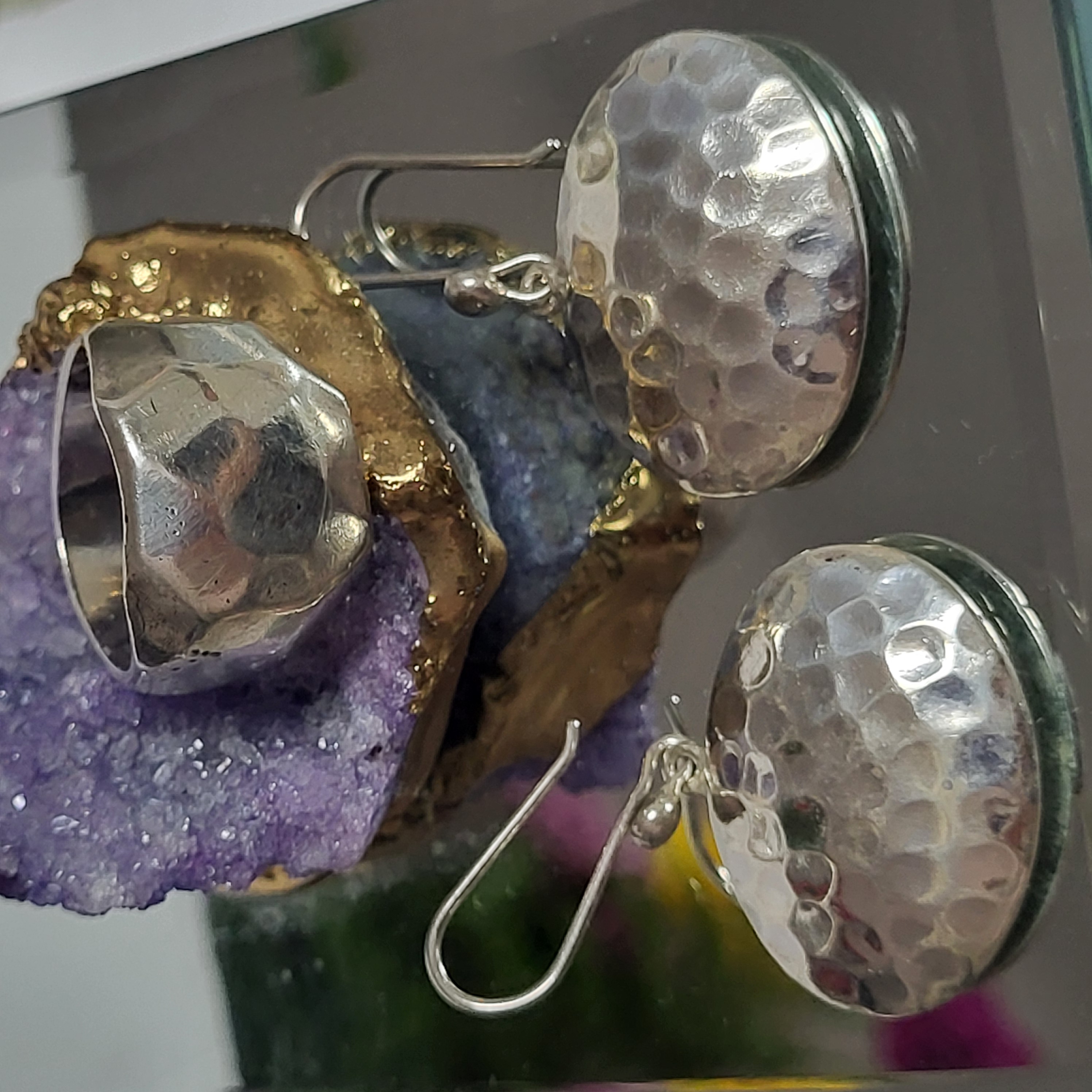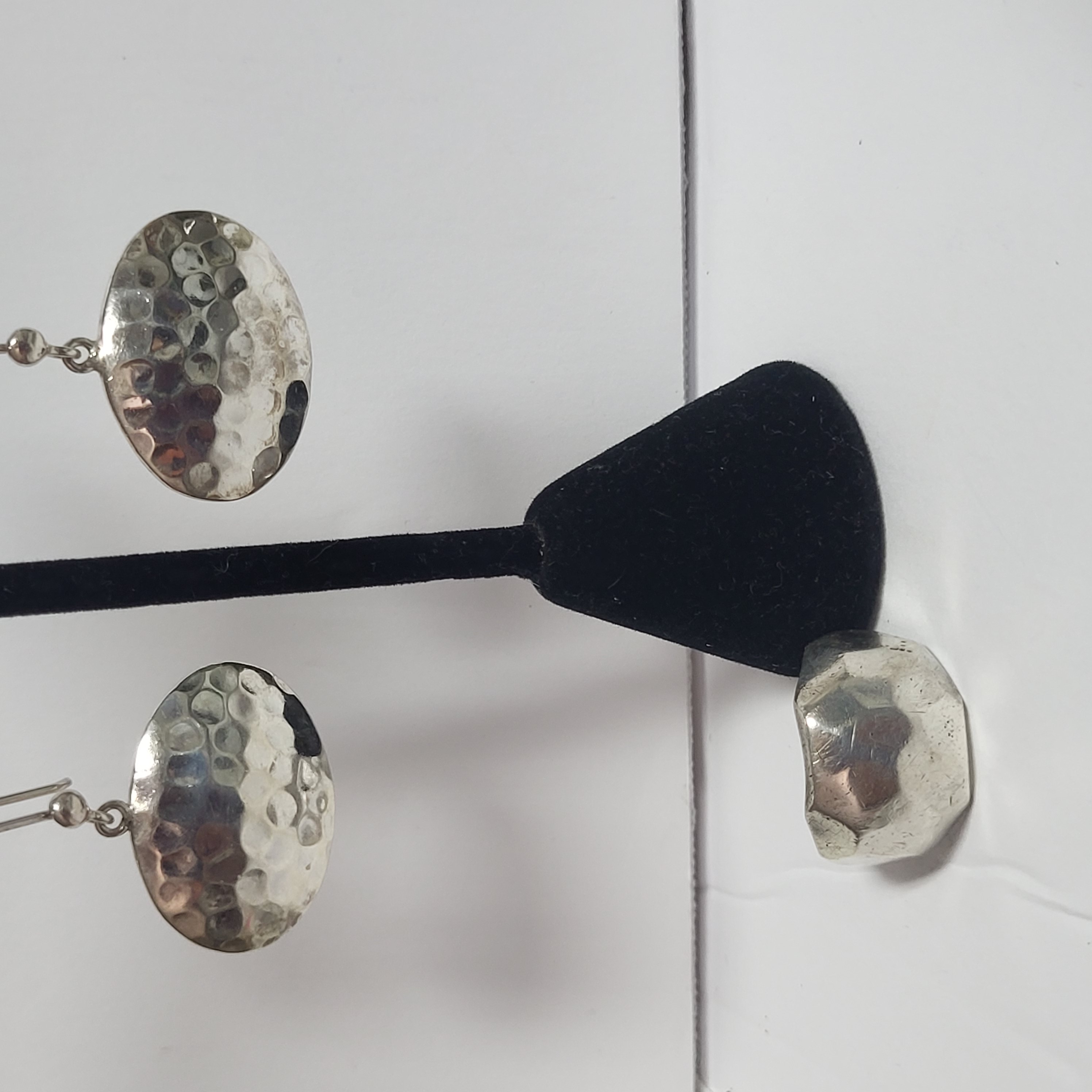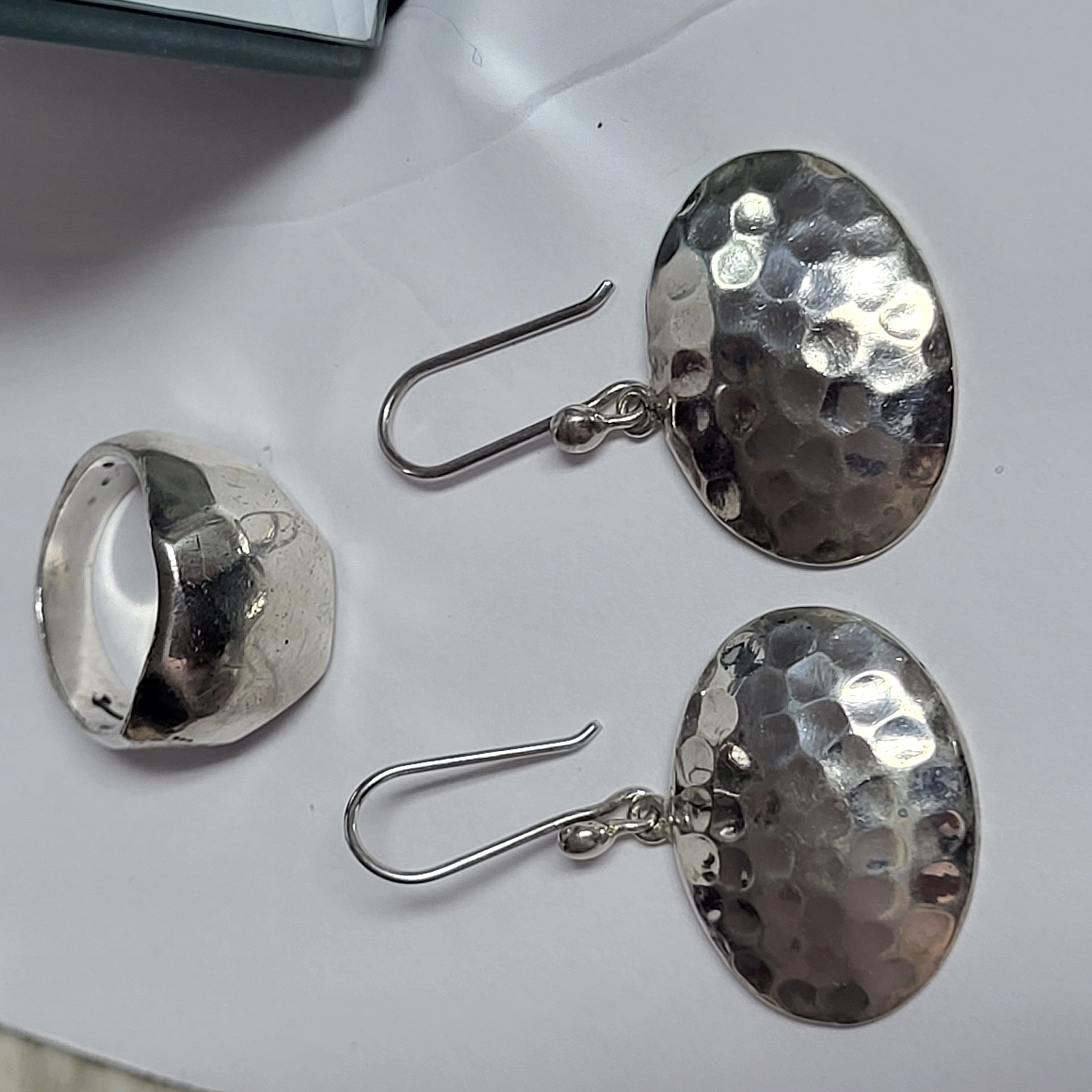 A .925 sterling silver ring with a polished, hammered finish is added to this lot as a companion ring to the earrings. The ring is not affiliated with the ILARIA brand, but rather Made in Mexico. However, the ring and earrings make a nice set. The ring is approximately 12mm wide and is US size 8.25. It can be sized for an additional charge. Please contact Bidfair Fine Jewelry for sizing details. These are estate items that have been well-cared for and are in excellent condition with only minor fine scratches and possibly some mild patina.