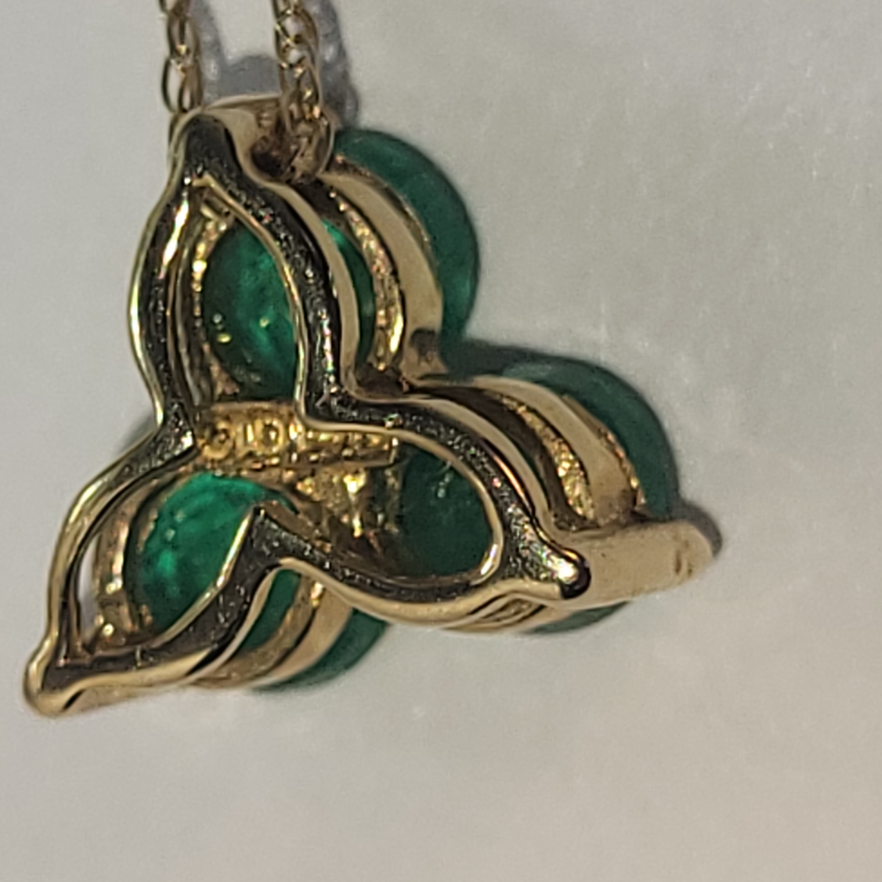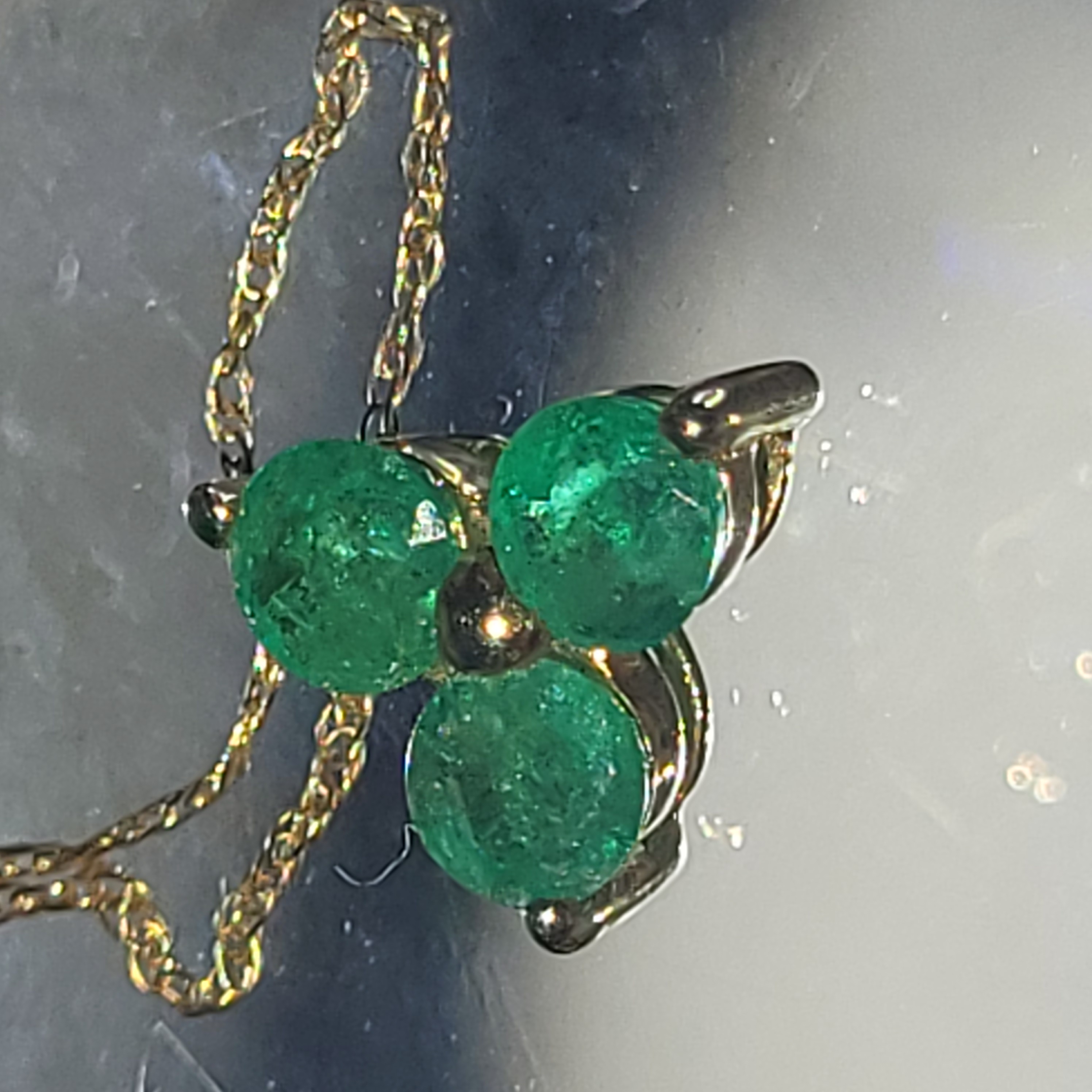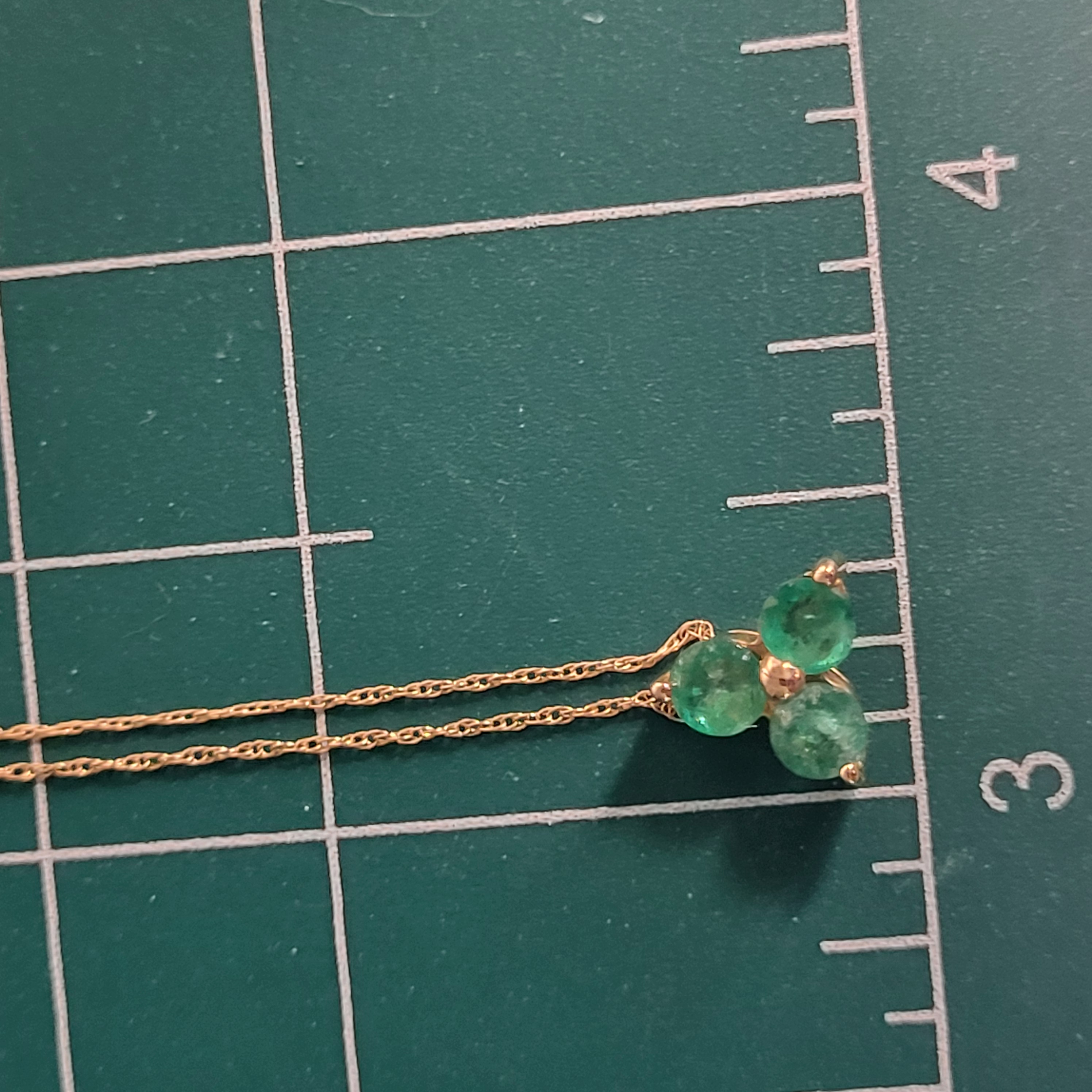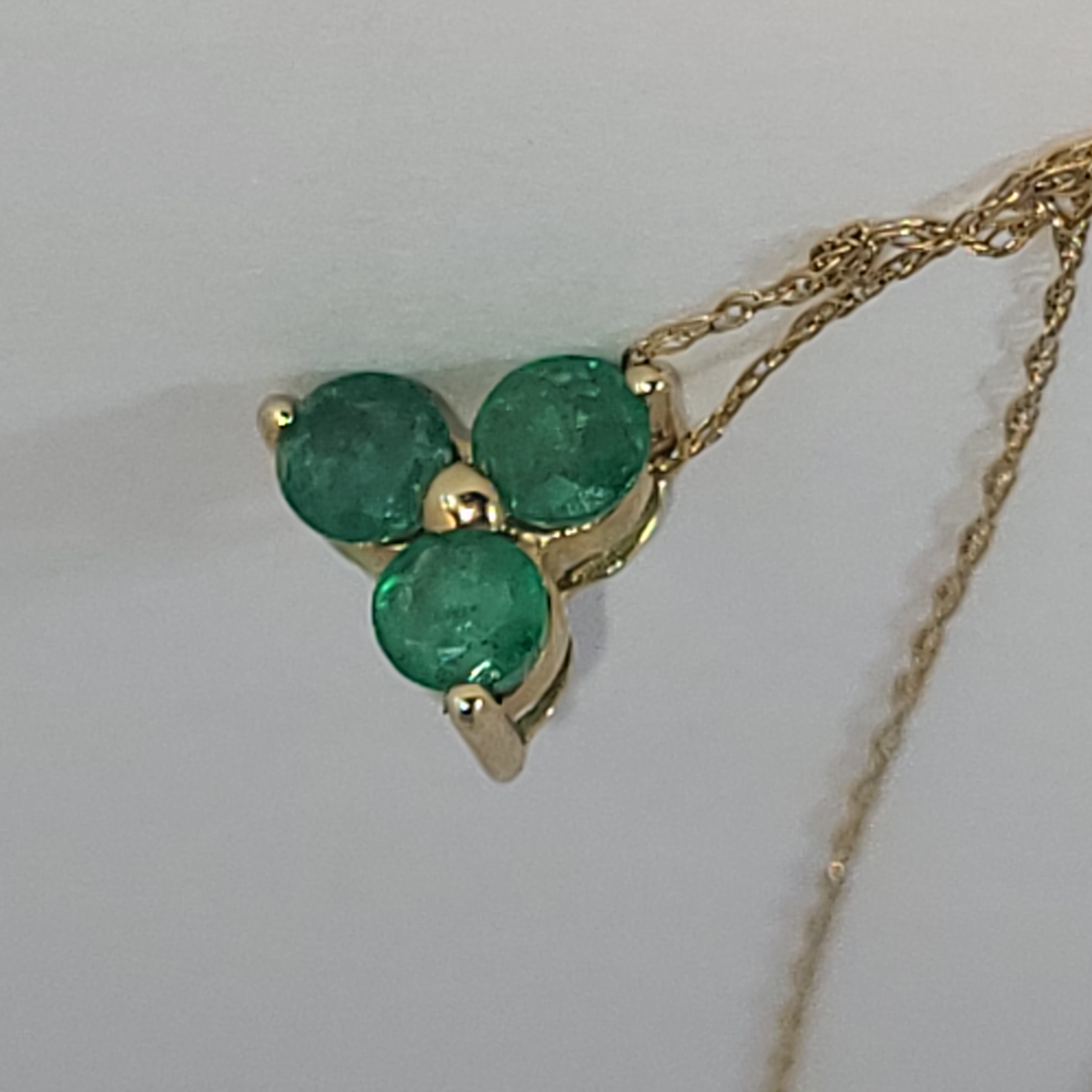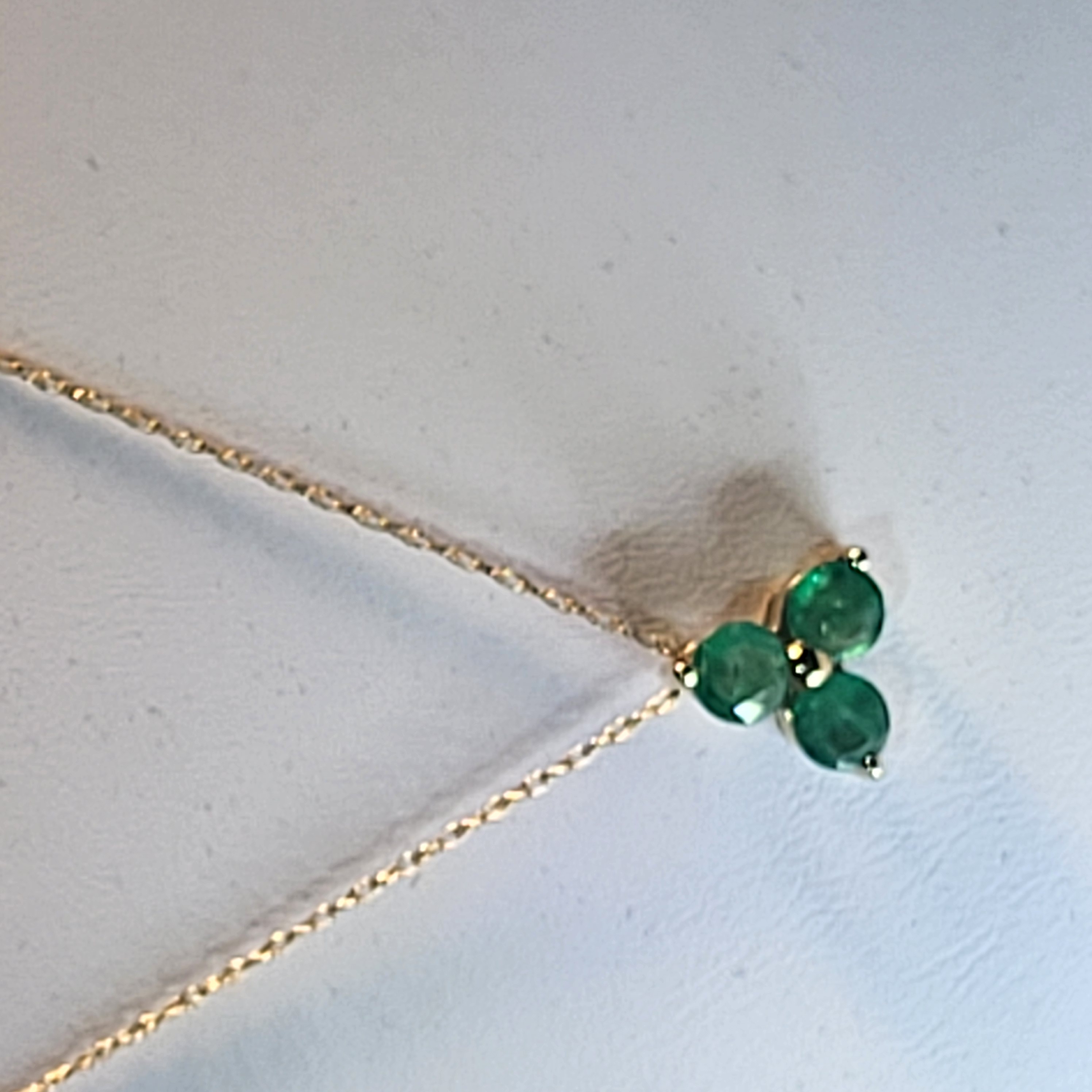 Sweet and simple, yet elegant. This 14 karat yellow gold necklace arranges three round, faceted, genuine emeralds into a clover design with a built-in bail for a simple slide. There is approximately .75 carats total weight in the pendant. It hangs from a 14 karat yellow gold 18" very fine rope chain (approximately .25mm) with a spring ring. This pendant bears the CID, Clyde Duneier, hallmark. This is a brand new item that has been held in back stock. It is in excellent condition, but may have minor signs of storage, such as fine scratches or patina. Admin: 33110/18-eh