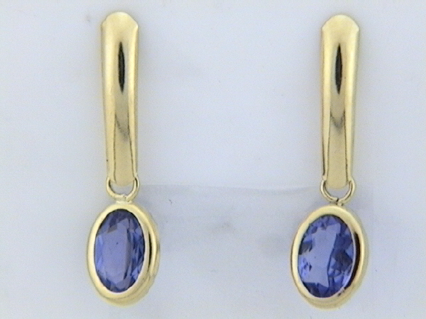 This is a pair of 14 karat yellow gold earrings that feature .90 carats total weight of oval-cut, bezel-set, genuine tanzanite and hang approximately 3/4". The earrings attach to the earlobe with posts and friction backs. This is a brand new item with manufacturer’s approval to sale in a public auction. It is in excellent condition, but may have fine scratches from shipping or storage. Admin: G11241/32blt