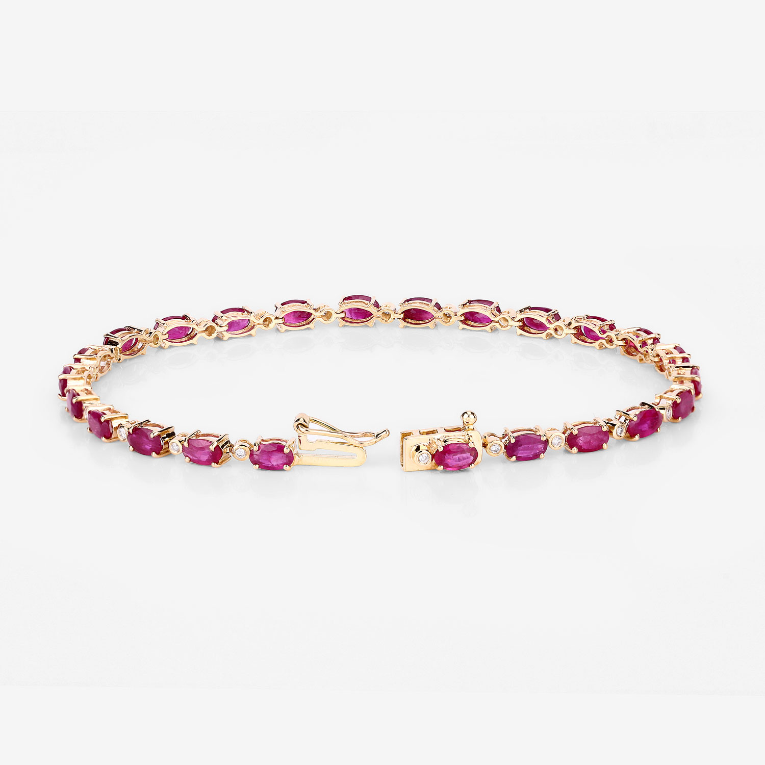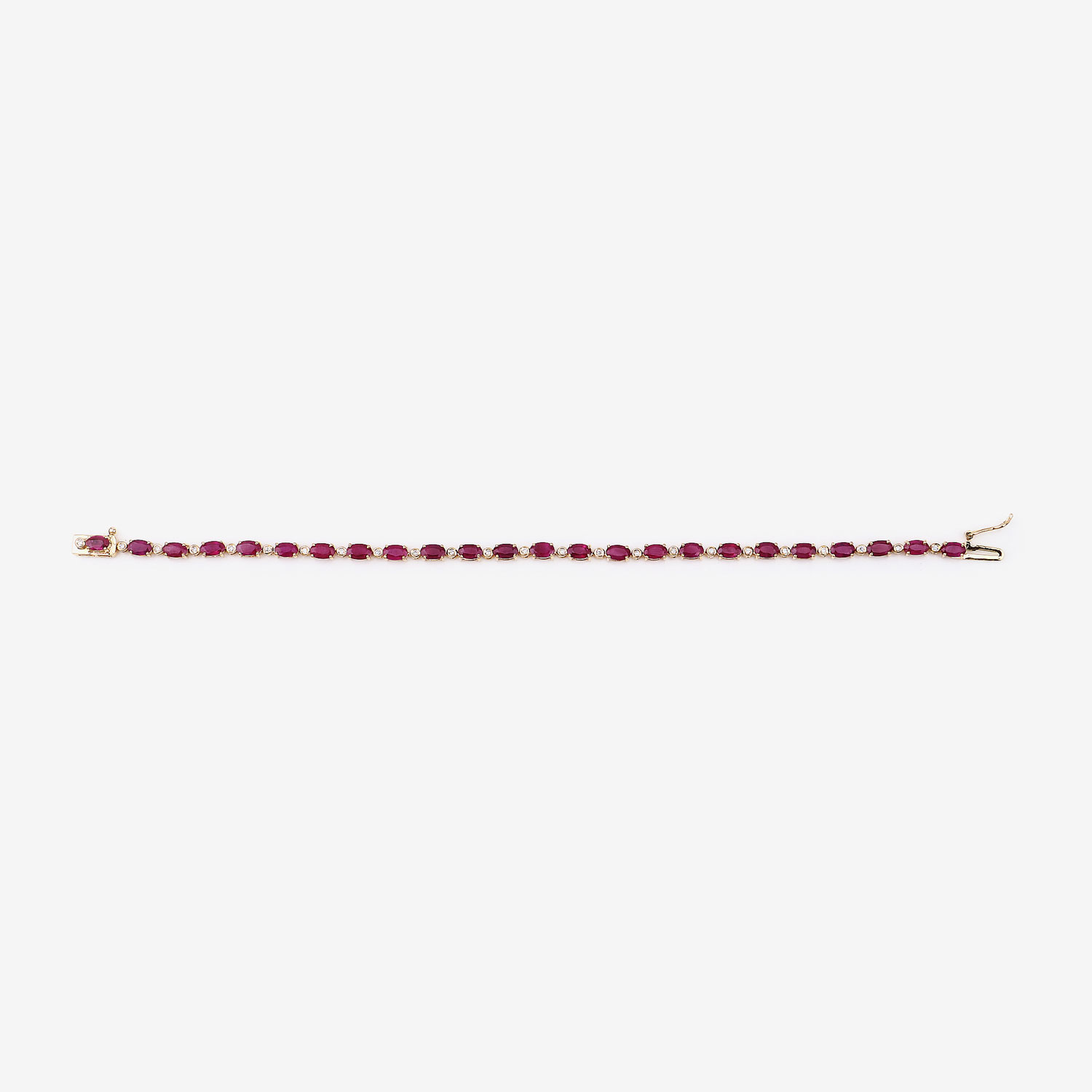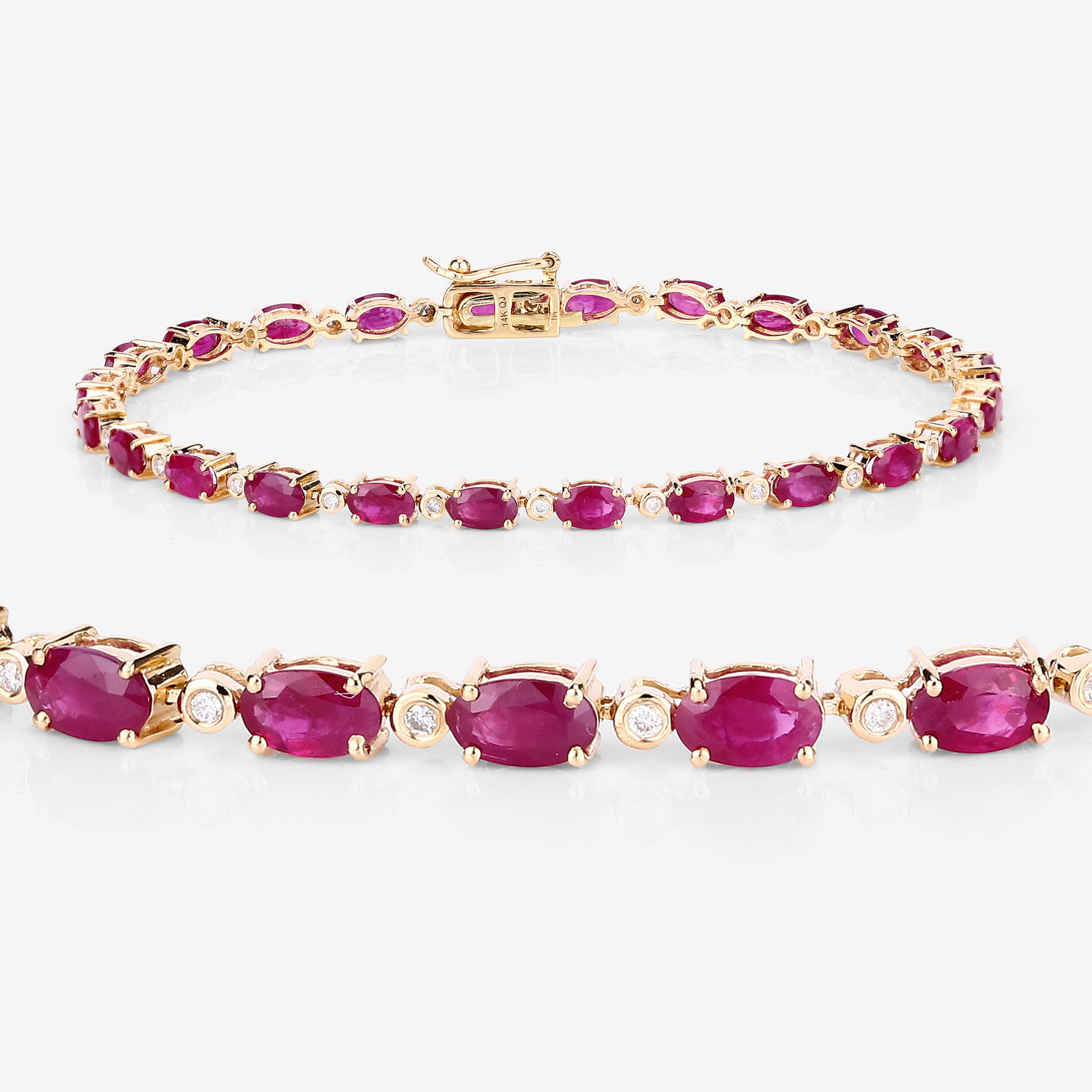 This is a stand-out ruby and diamond bracelet, set in 14 karat yellow gold. There are 6.48 carats total weight of oval-cut, prong-set rubies, and what makes this bracelet stand apart from so many others that you see, is the bezel-set diamonds between the rubies. There are .19 carats total weight of round, brilliant-cut, H-I color, I1 clarity diamonds in this bracelet. It is approximately 3mm wide and 7" long with a hidden box clasp and a safety clip. This bracelet can be shortened, if needed. Please contact Bidfair Fine Jewelry for details. This item is eligible for appraisal by an independent appraiser (with qualifying credentials from GIA) without affiliation to Bidfair Fine Jewelry, at a discounted rate. Please contact Bidfair Fine Jewelry for more information on appraisals. This is a brand new item, with approved from the manufacturer for sale to the public, by auction. It is in excellent condition, but may have fine scratches from shipping or transportation. Admin: Q741/38aen