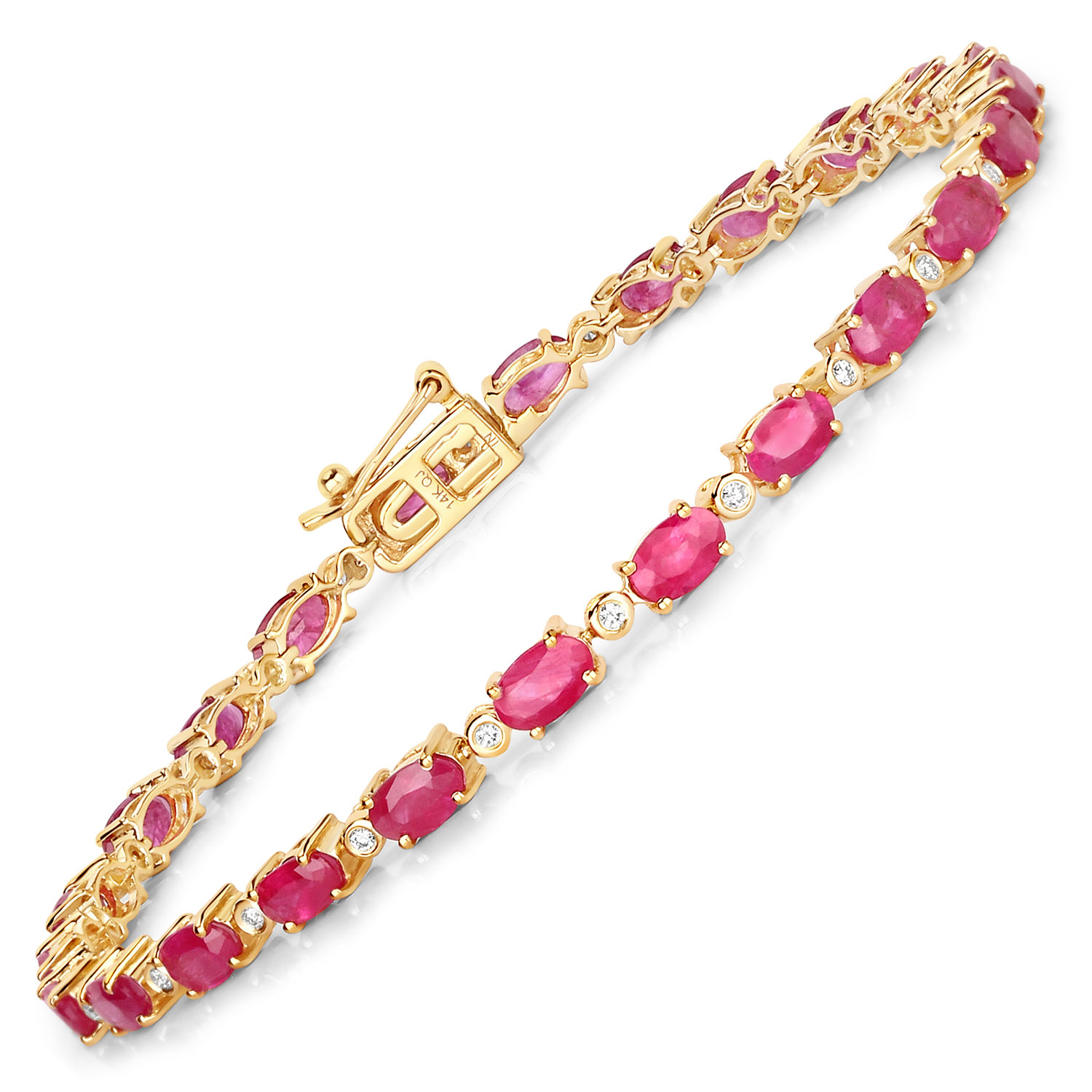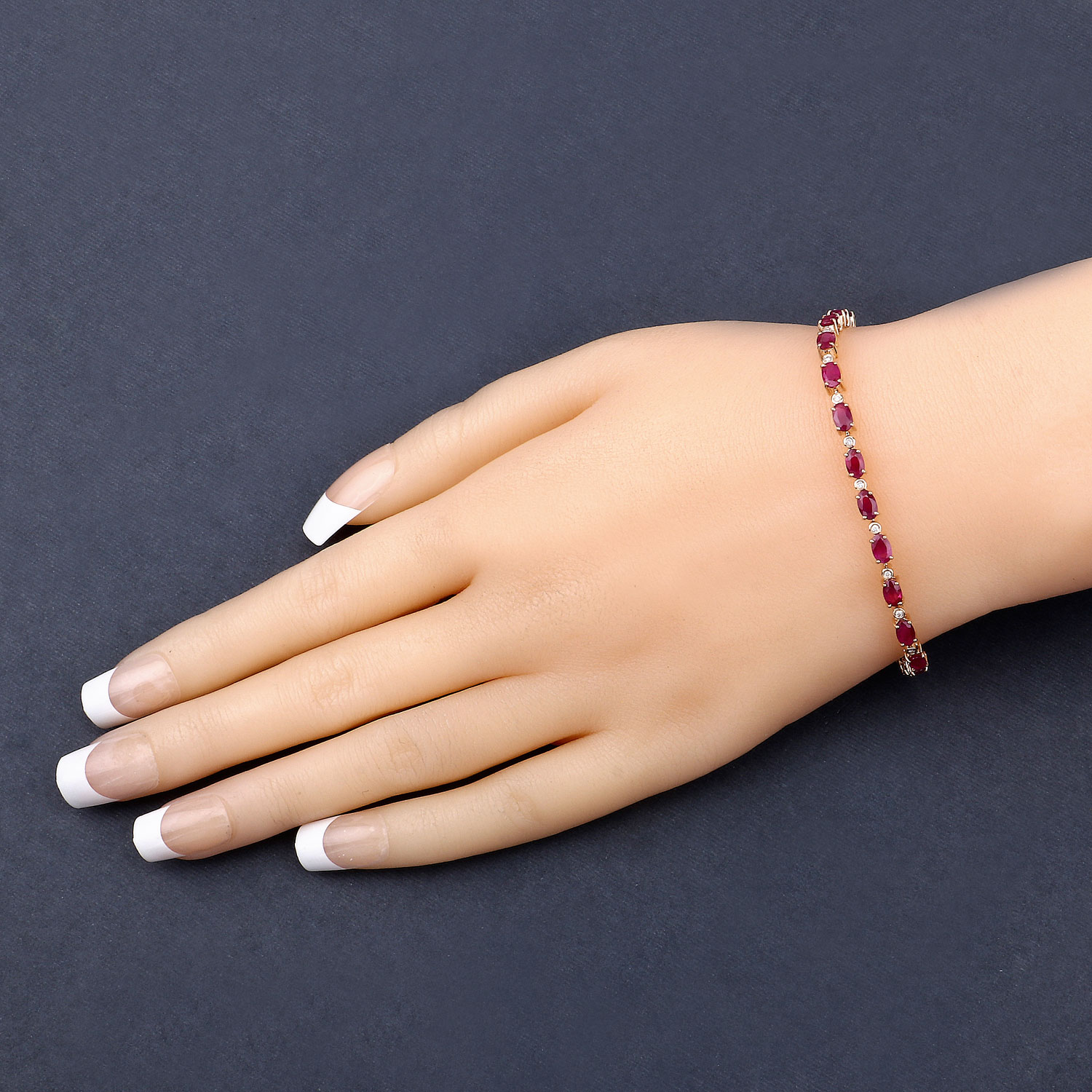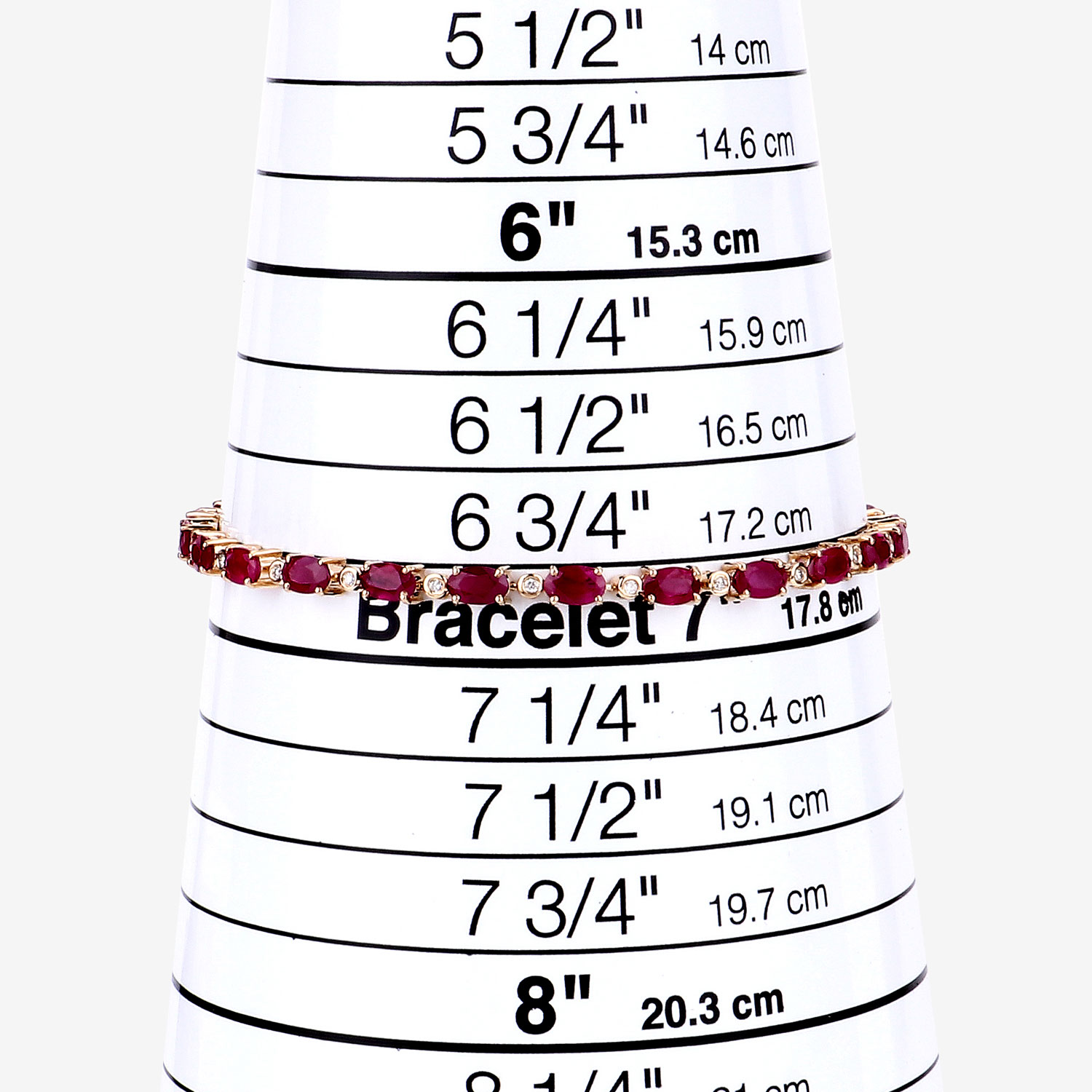 This is a stand-out ruby and diamond bracelet, set in 14 karat yellow gold. There are 6.48 carats total weight of oval-cut, prong-set rubies, and what makes this bracelet stand apart from so many others that you see, is the bezel-set diamonds between the rubies. There are .19 carats total weight of round, brilliant-cut, H-I color, I1 clarity diamonds in this bracelet. It is approximately 3mm wide and 7" long with a hidden box clasp and a safety clip. This bracelet can be shortened, if needed. Please contact Bidfair Fine Jewelry for details. This item is eligible for appraisal by an independent appraiser (with qualifying credentials from GIA) without affiliation to Bidfair Fine Jewelry, at a discounted rate. Please contact Bidfair Fine Jewelry for more information on appraisals. This is a brand new item, with approved from the manufacturer for sale to the public, by auction. It is in excellent condition, but may have fine scratches from shipping or transportation. Admin: Q741/38aen