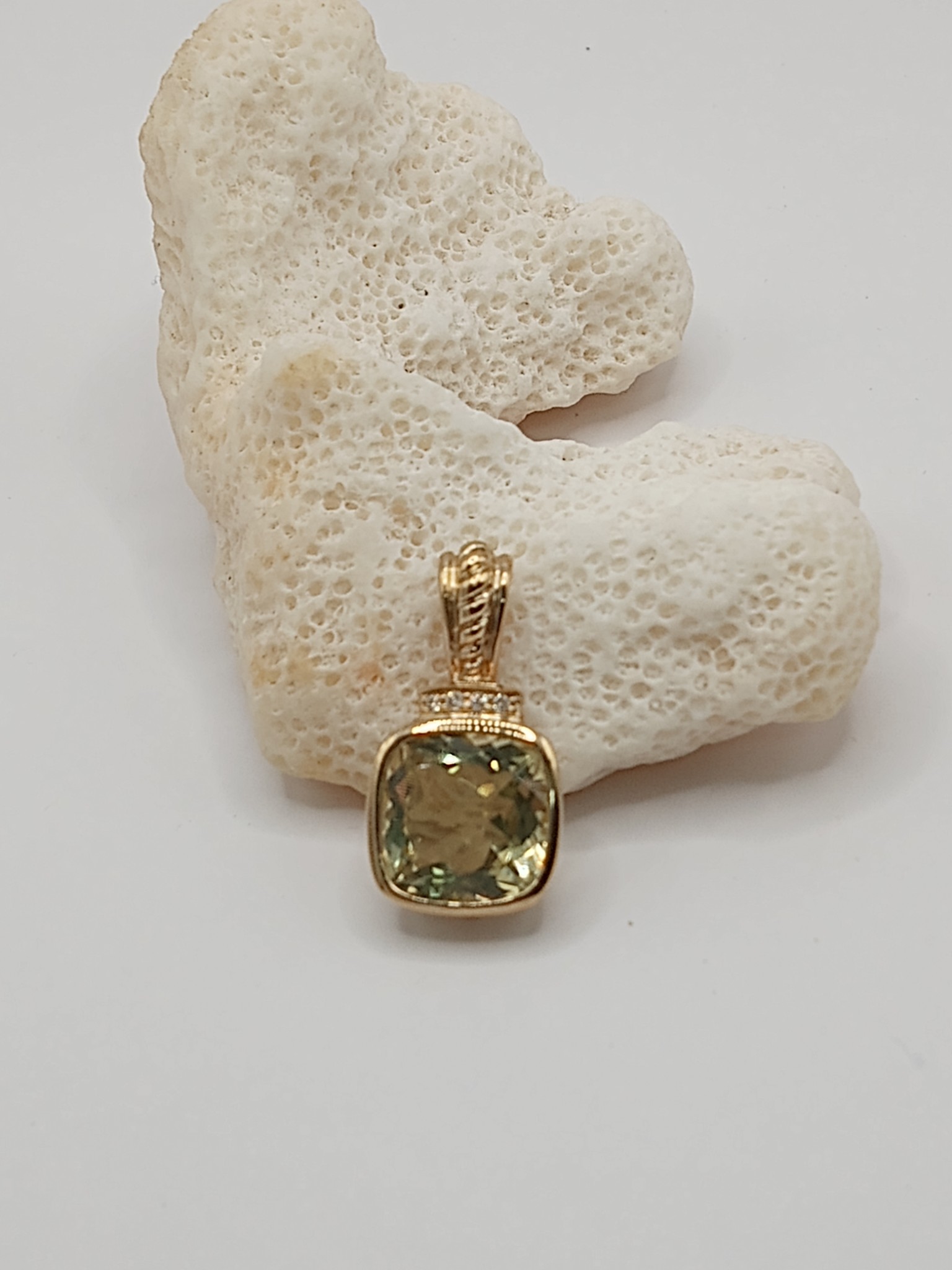 This is a 14 karat yellow gold pendant that features an amazing 3.36 carat cushion-cut, bezel-set lemon quartz and .02 carats total weight of round, brilliant-cut, H color, SI2-I1 clarity diamonds for accent along the topl The pendant has a solid bail with gold beads that can accommodate an approximate 2.5mm wide chain. This is a brand new item with manufacturer’s approval to sale in a public auction. It is in excellent condition, but may have fine scratches from shipping or storage.