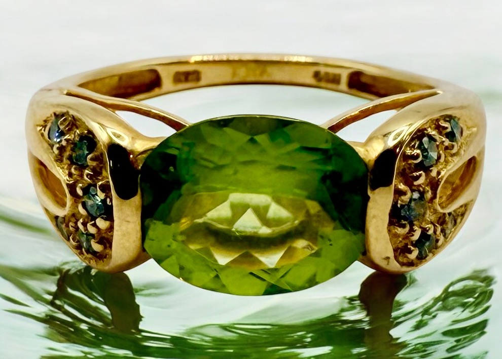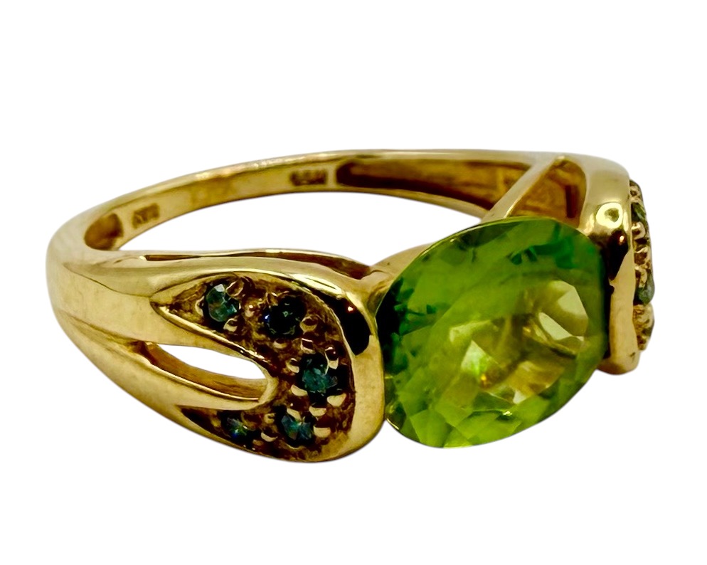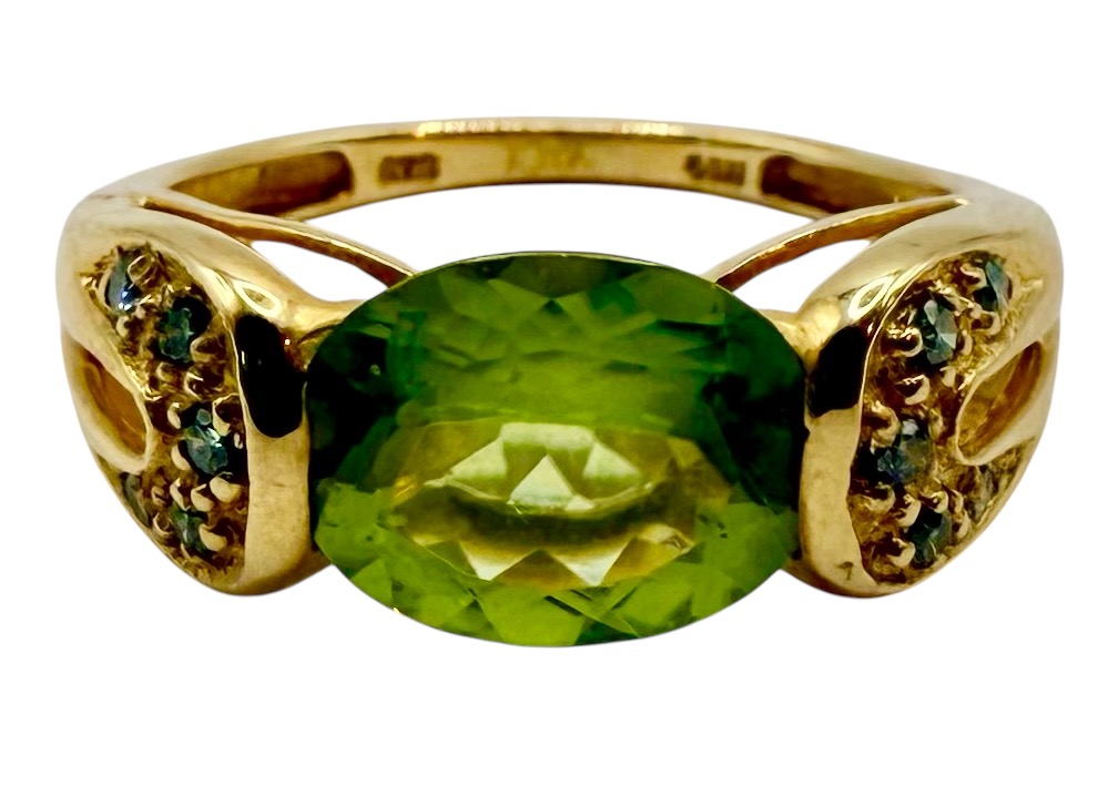 This is a 14 karat yellow gold ring with an approximate 2.50 carat oval-cut, East-West set, genuine peridot with approximately .10 carats total weight round, brilliant-cut, blue diamonds (approximate SI2) in the cathedral shoulders. The ring is approximately size 7 and can be sized for an additional charge. Please contact Bidfair Fine Jewelry for sizing details. This is a brand new item that has been held in back stock. It is in excellent condition, but may have minor signs of storage, such as fine scratches or patina. Admin: 33110/5wid