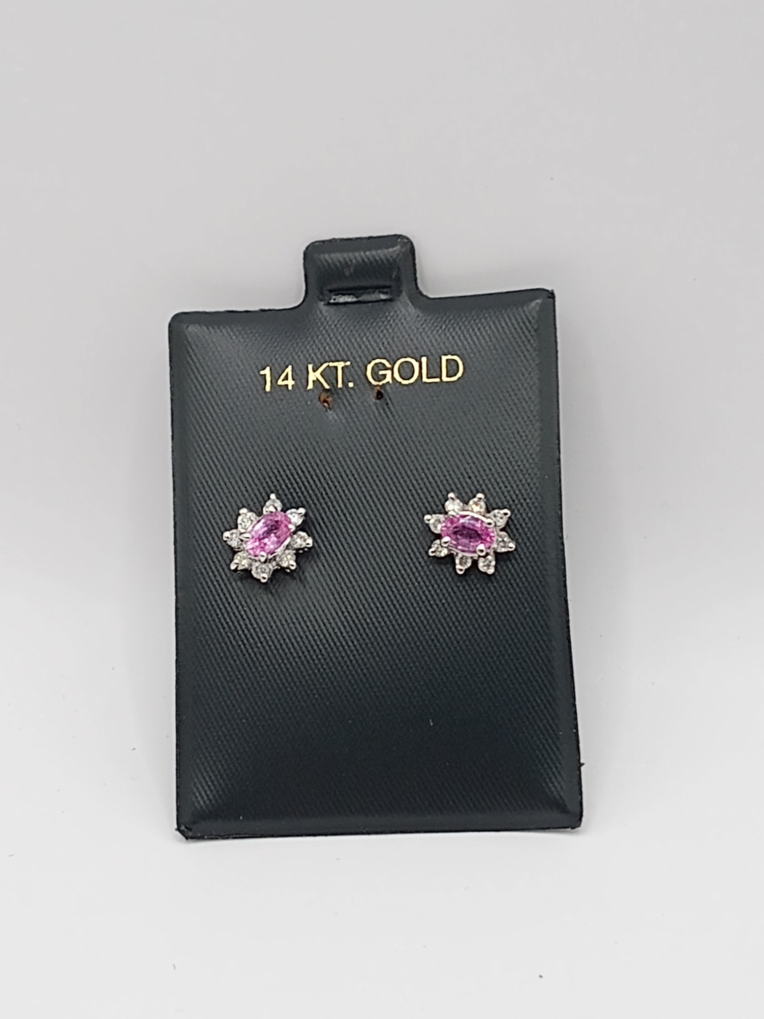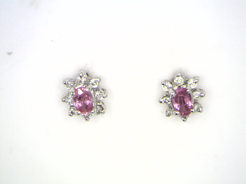This is a pair of 14 karat white gold earrings that feature .66 carats total weight of oval-cut, prong-set, genuine pink sapphires and .27 carats of round, brilliant-cut, H, SI2-I1 clarity diamonds in the halos. The earrings attach to the earlobe with posts and friction backs. This is a brand new item with manufacturer’s approval to sale in a public auction. It is in excellent condition, but may have fine scratches from shipping or storage. Admin: G11241/11lat