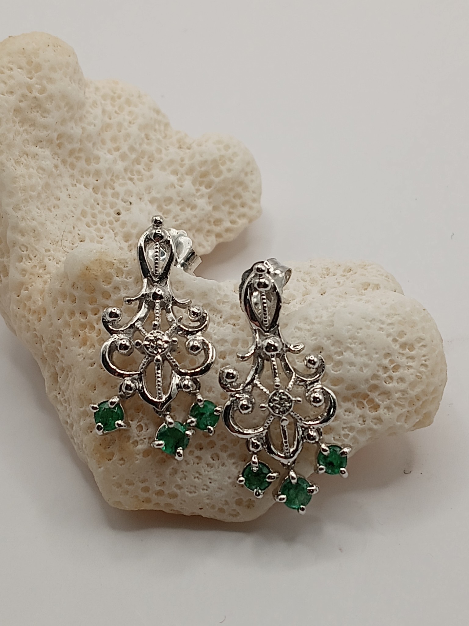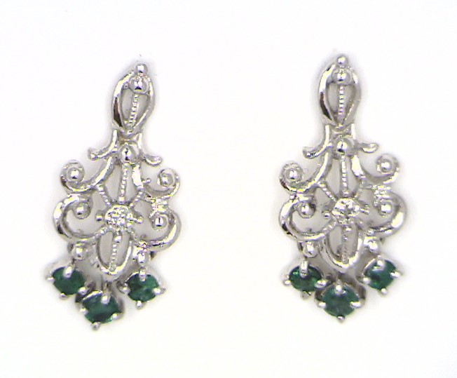 These 14 karat white gold chandelier earrings are perfect for dressy or casual outings. Approximately .58 carats total weight of prong-set, genuine emeralds dangle from the bottom of white gold gentle swirls and graceful curves. The earrings are 7/8" x 3/16" and attach to the earlobe with posts and friction backs. This is a brand new item with manufacturer’s approval to sale in a public auction. It is in excellent condition, but may have fine scratches from shipping or storage.