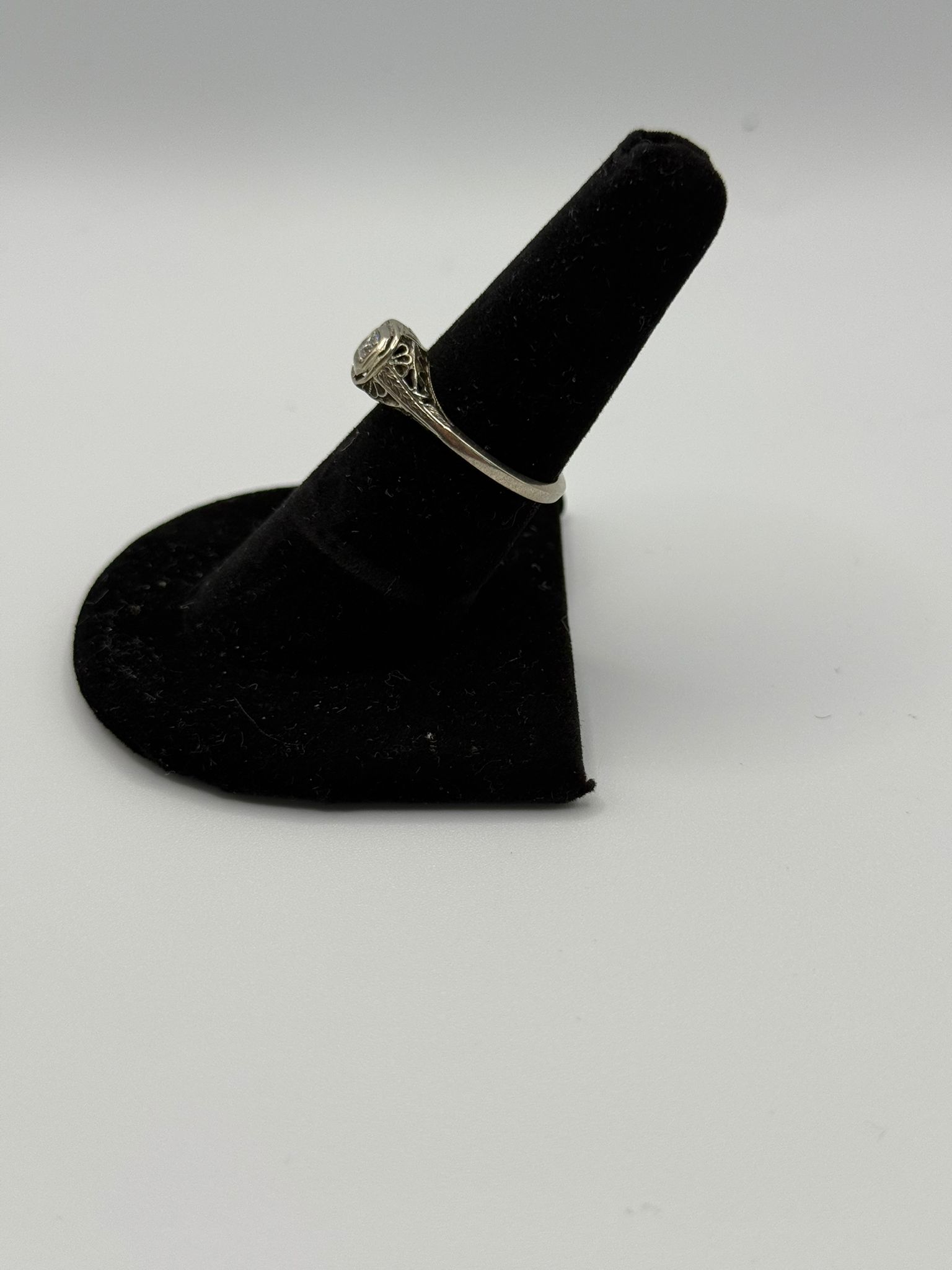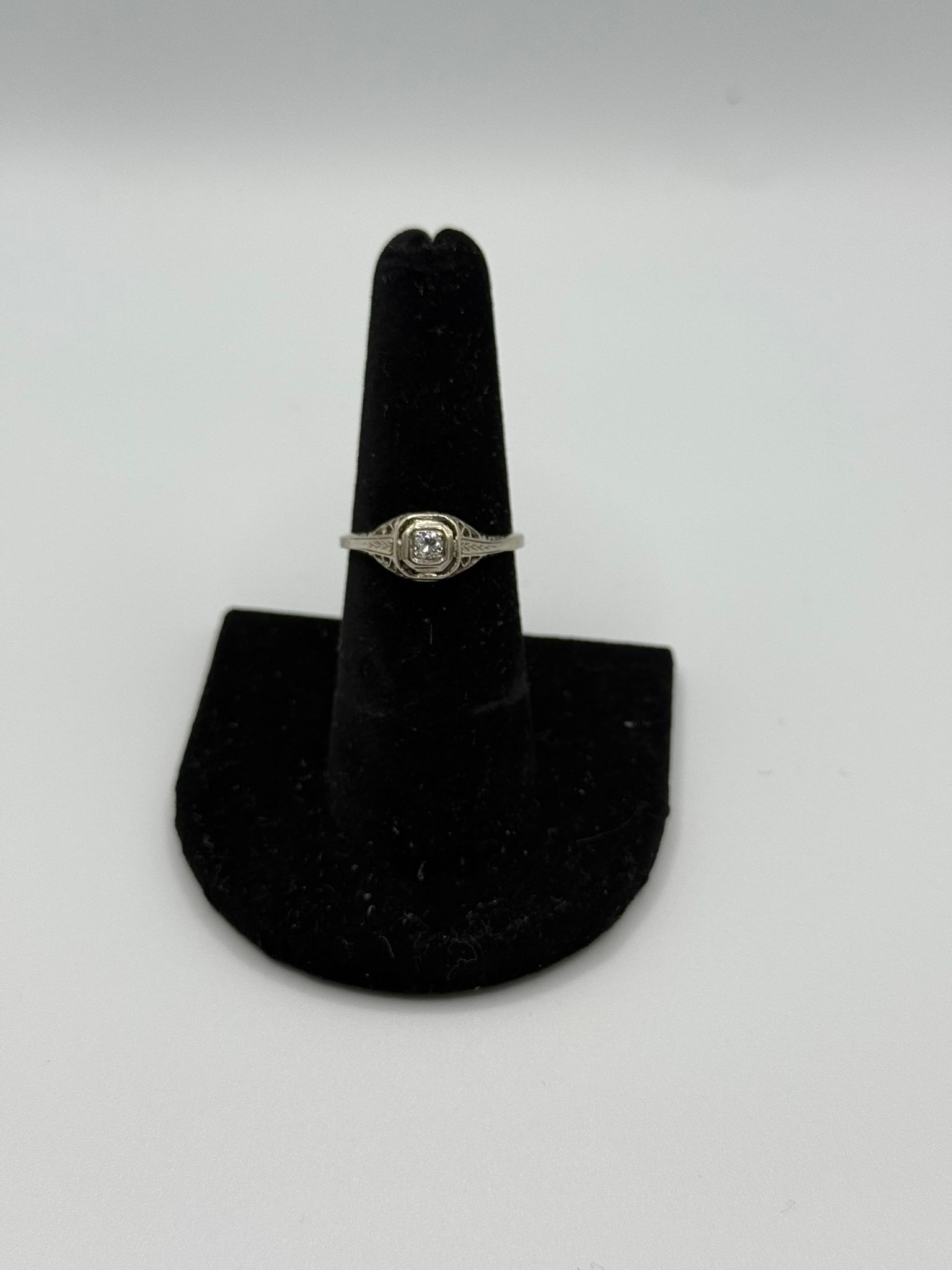 This is a lovely 18 karat white gold ring, likely over 100 years old, is set with an approximate .10 carat, European-cut, G color, VS2 clarity diamond in the center. The ring can be sized, if desired. Request details from Bidfair Fine Jewelry. This is an estate item that is in very good condition, with only signs of wear typical of jewelry from its era. Admin: C33109/2lhh