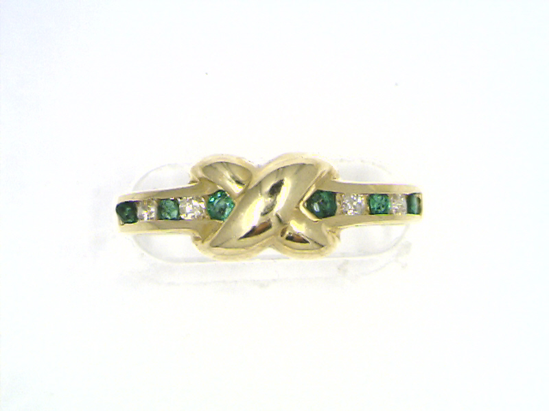 This is a 14 karat yellow gold ring that features .25 carats total weight of round, faceted, genuine emeralds and .13 carats total weight of round, brilliant-cut, H-I color, SI2-I1 clarity diamonds in a ring with a "X" Kiss design. The ring is US size 7 and can be sized for an additional charge. Please contact Bidfair Fine Jewelry for sizing details. This is a brand new item with manufacturer’s approval to sale in a public auction. It is in excellent condition, but may have fine scratches from shipping or storage. Admin: G11241/5llt