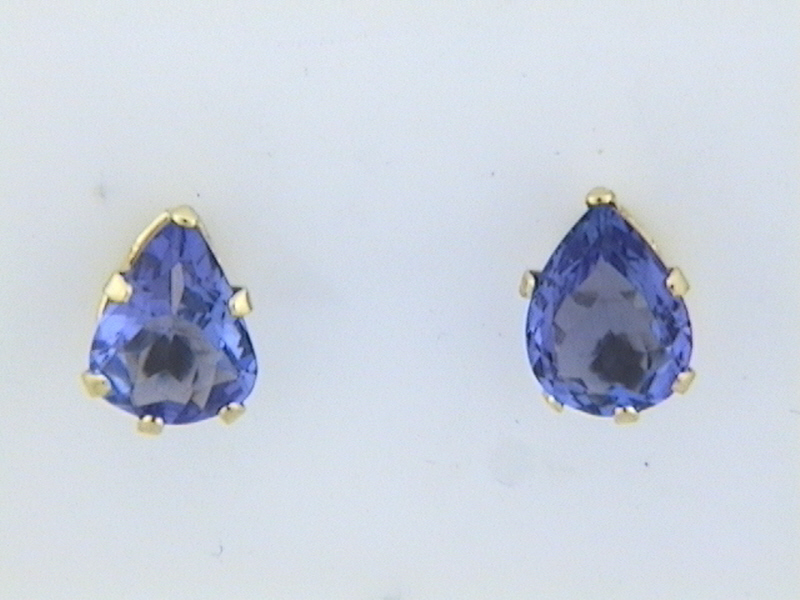 This is a pair of 14 karat yellow gold tanzanite solitaire earrings. Each tanzanite is one-carat, pear-cut, earth-mined, and prong-set. The earrings attach to the earlobe with posts and friction backs. This is a brand new item with manufacturer’s approval to sale in a public auction. It is in excellent condition, but may have fine scratches from shipping or storage. Admin: G11251/28let