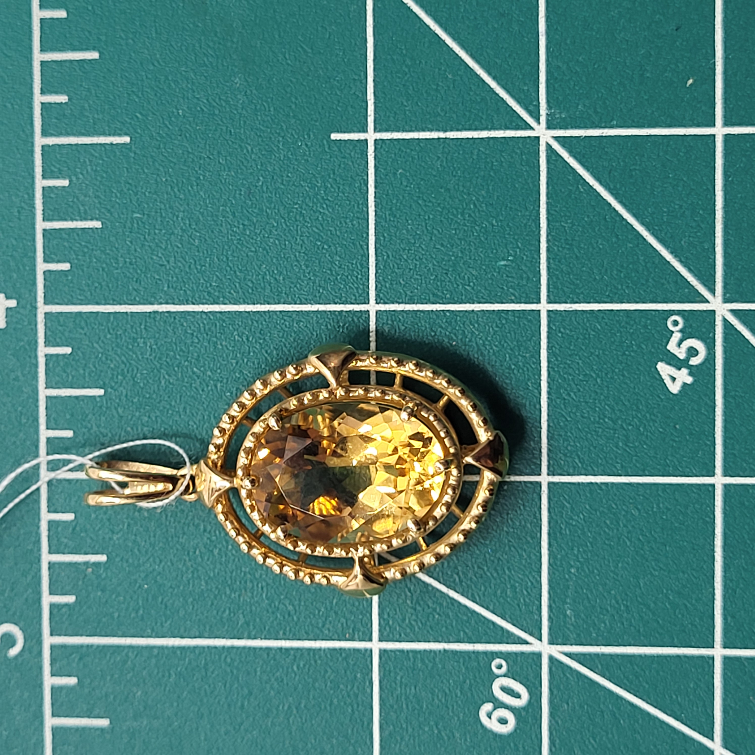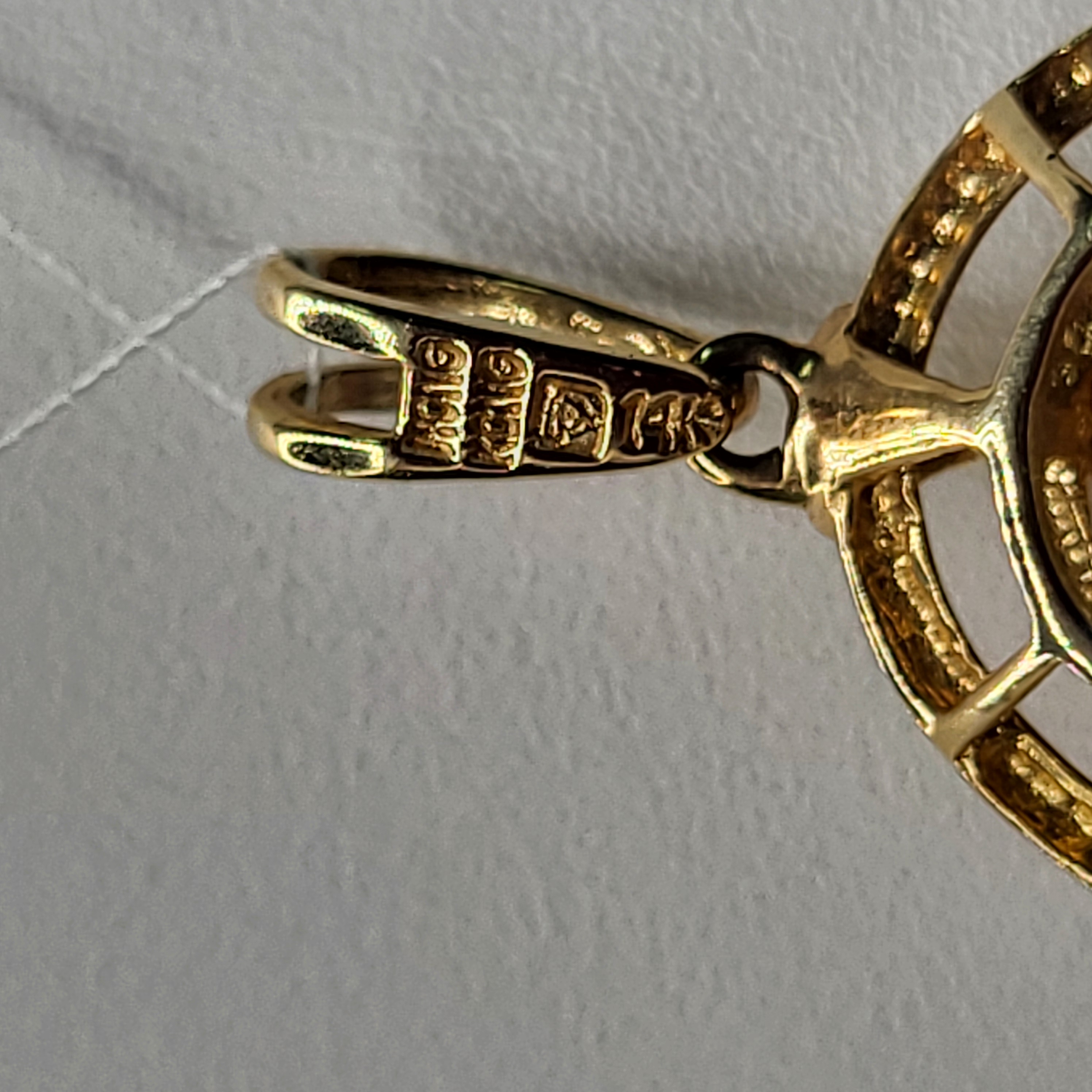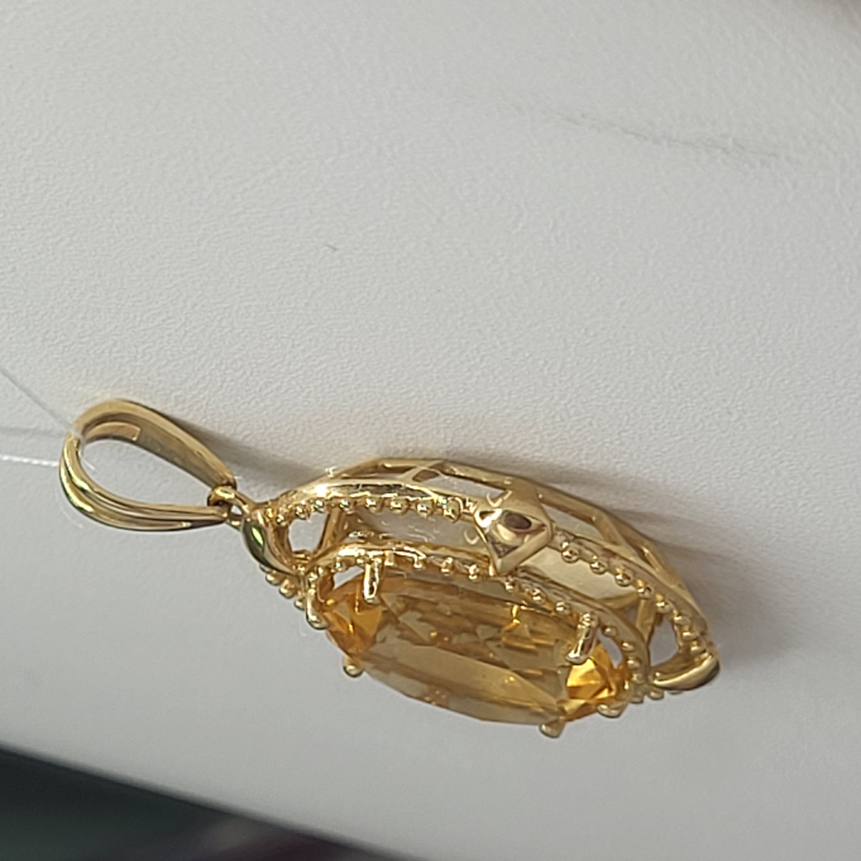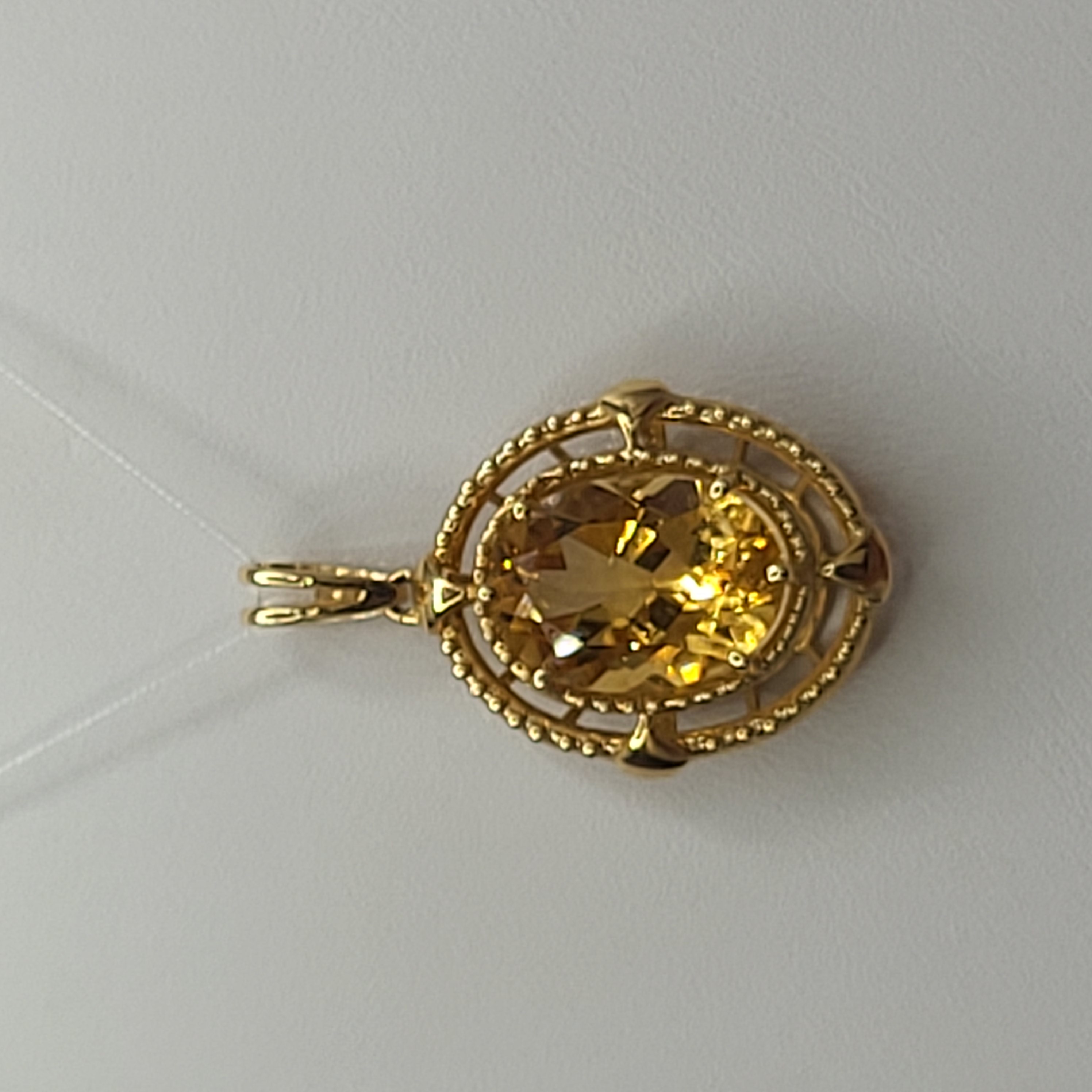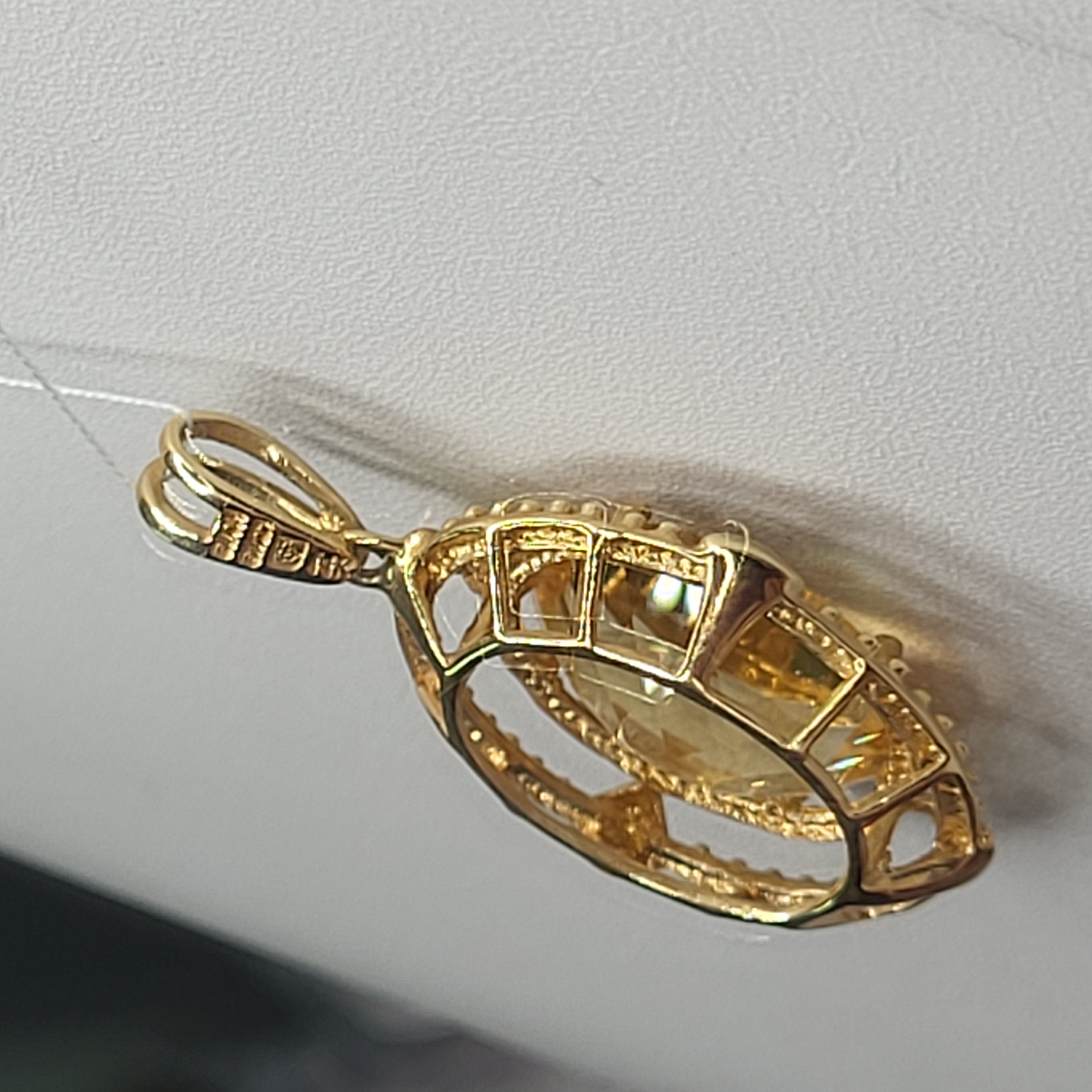 This is a wonderful 14 karat yellow gold pendant with an approximate 5.00 carat oval-cut, golden citrine that is set with 6-prongs inside concentric oval-shaped hobnail frames. There is a rabbit ear bail that is affixed to a permanent ring at the top of the pendant and it can accommodate an approximate 3.5mm chain. The pendant is approximately 1 3/8" long x 3/4" wide and bears the mark LJ for Lorenzo Jewelry, Hong Kong (one of the largest suppliers of colored stone jewelry in the industry). This pendant makes a great companion with the citrine ring in Lot 36! This is a brand new item that has been held in back stock. It is in excellent condition, but may have minor signs of storage, such as fine scratches or patina. Admin:33110/13baa
