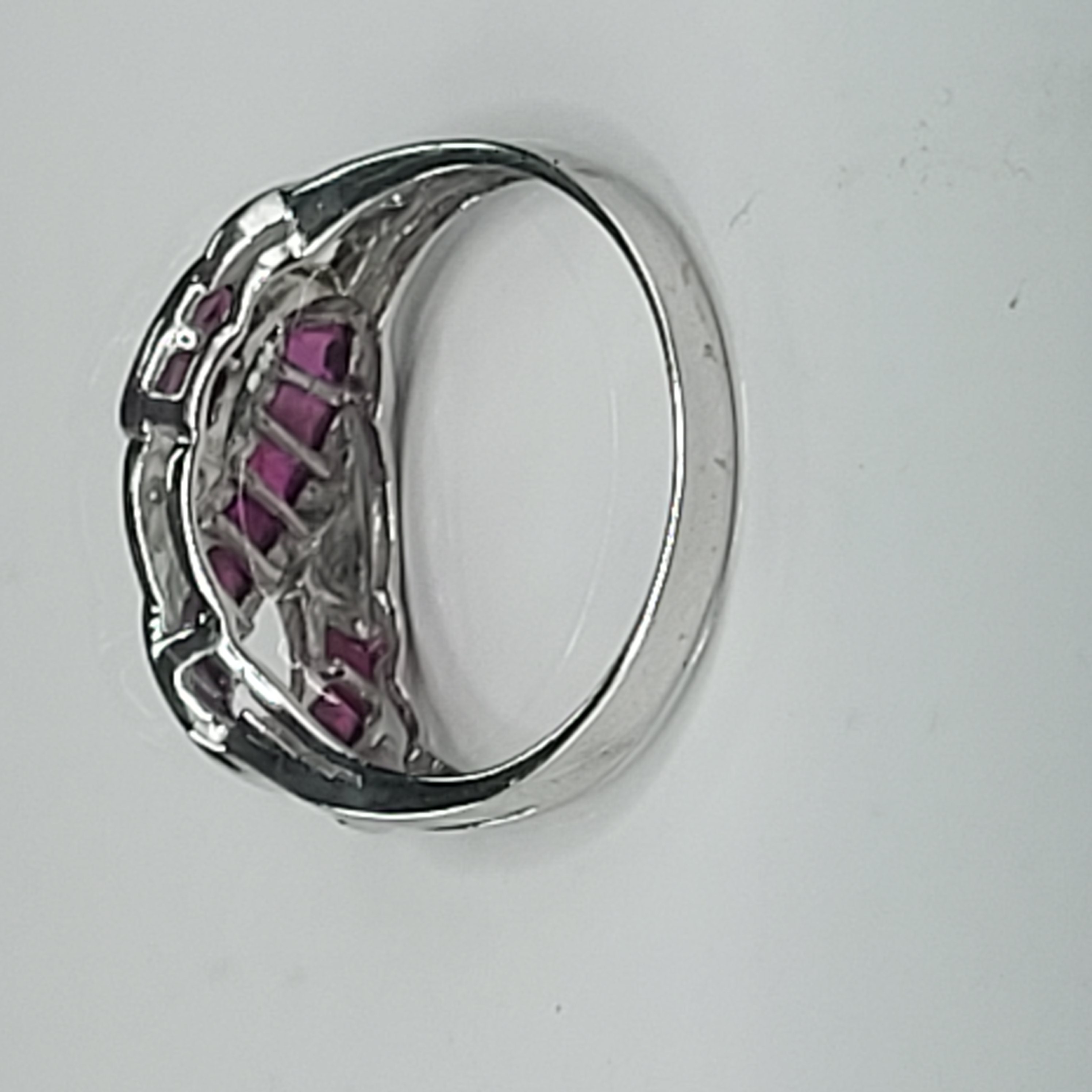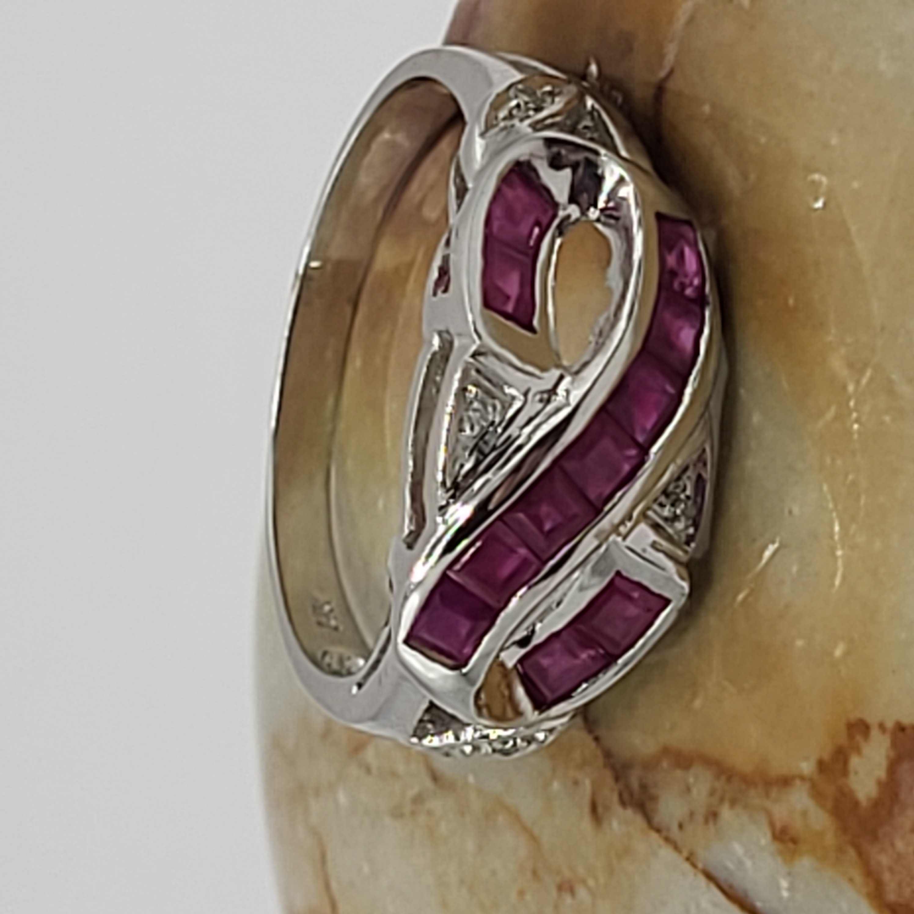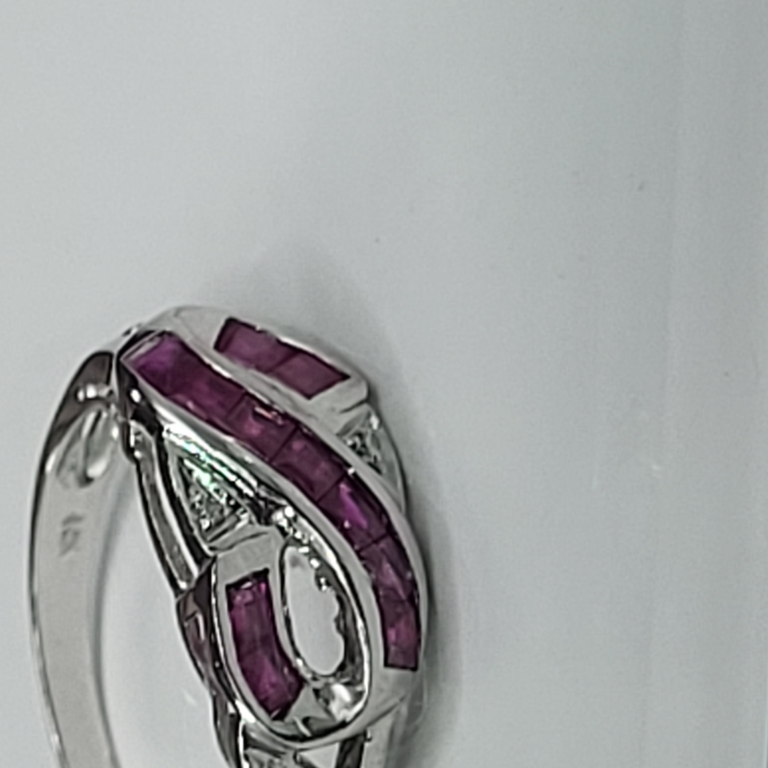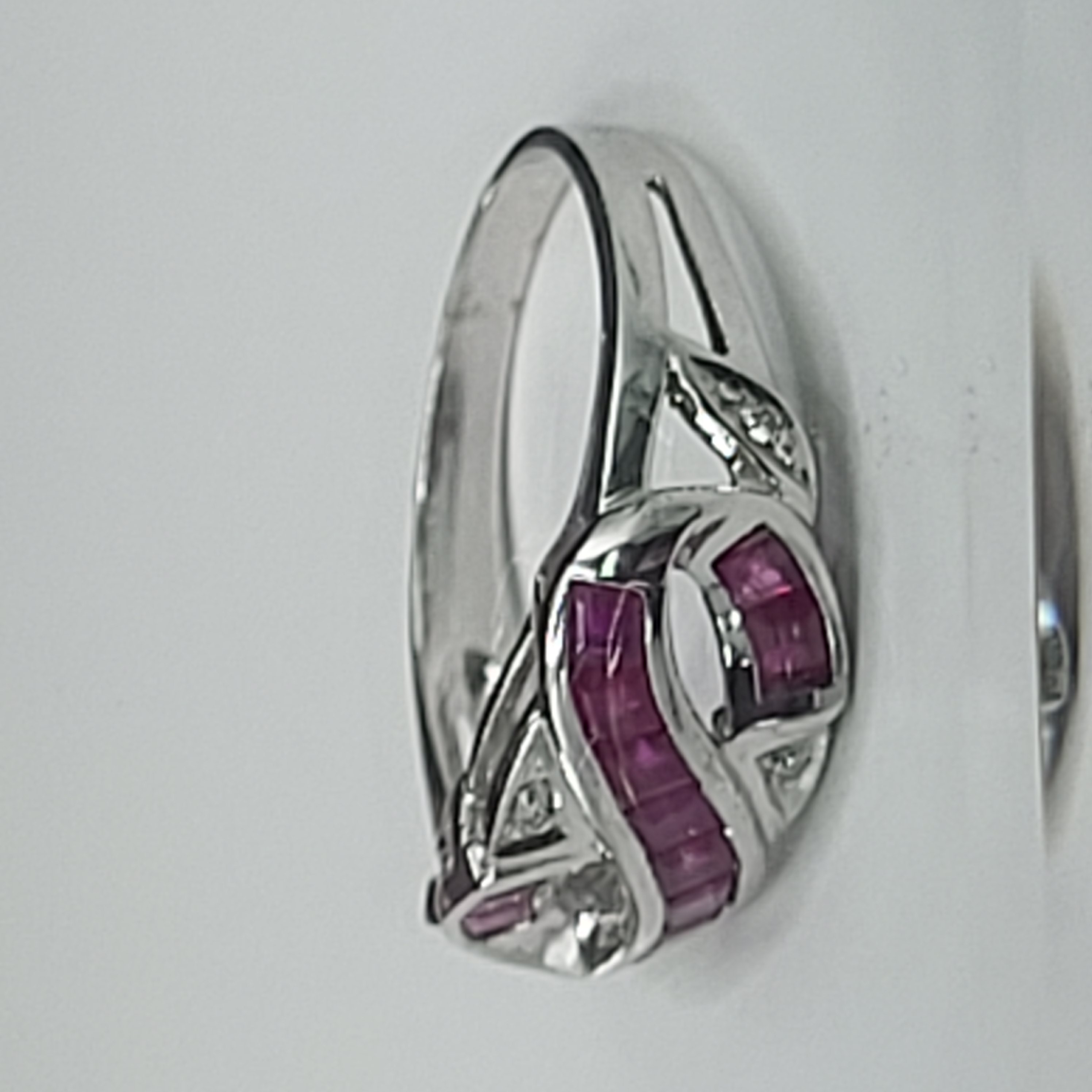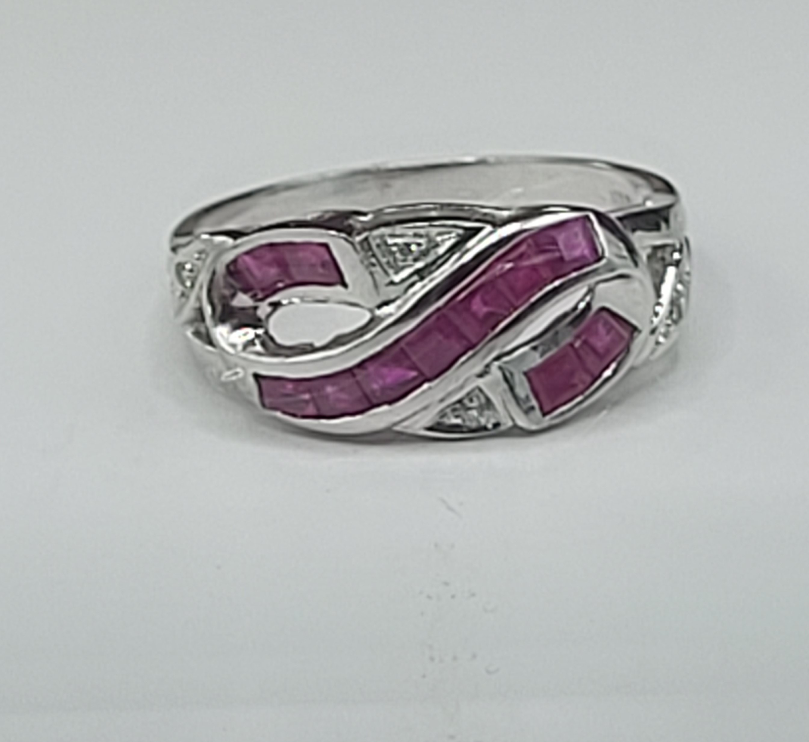 14 karat white gold ring features approximately 1.00 carats total weight of square-cut, channel- and invisible-set, genuine rubies that follow a ribbon of the "infinity" symbol. There are four round, faceted accent diamonds for additional sparkle. This ring is US size 7 and can be sized for an additional charge. Please contact Bidfair Fine Jewelry for sizing details. This is a brand new item that has been held in back stock. It is in excellent condition, but may have minor signs of storage, such as fine scratches or patina. Admin: 33109/26bin
