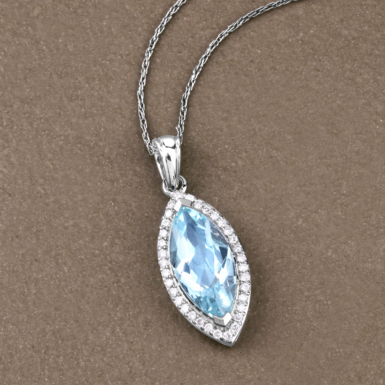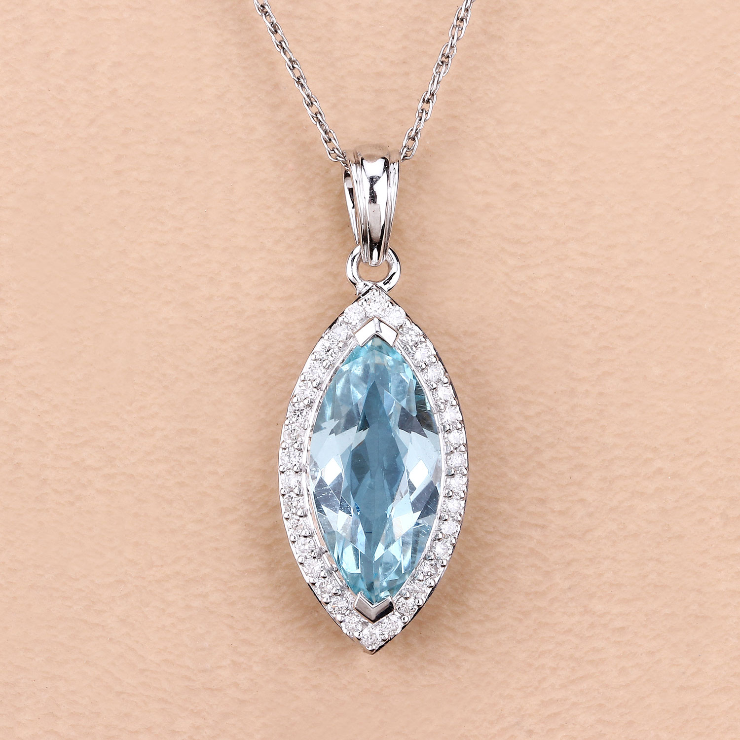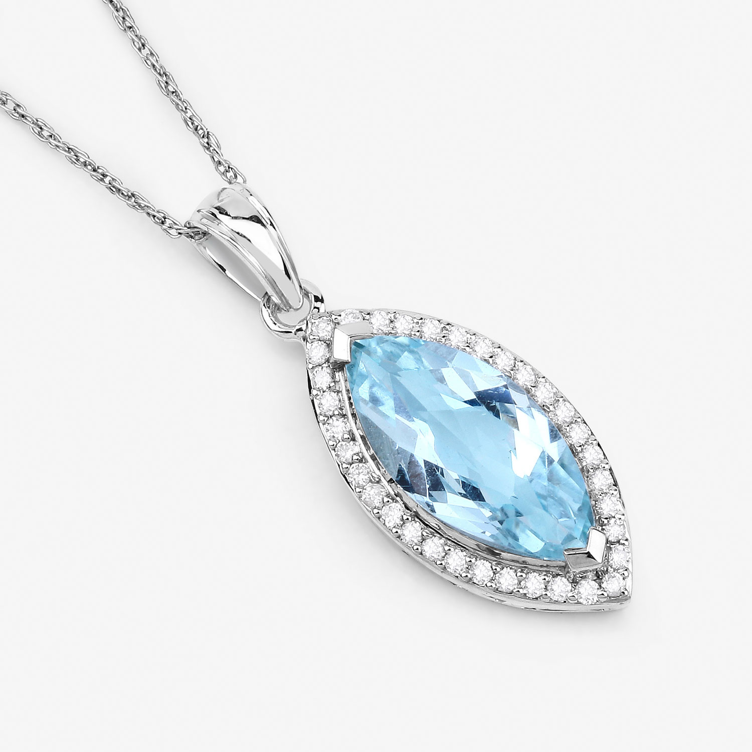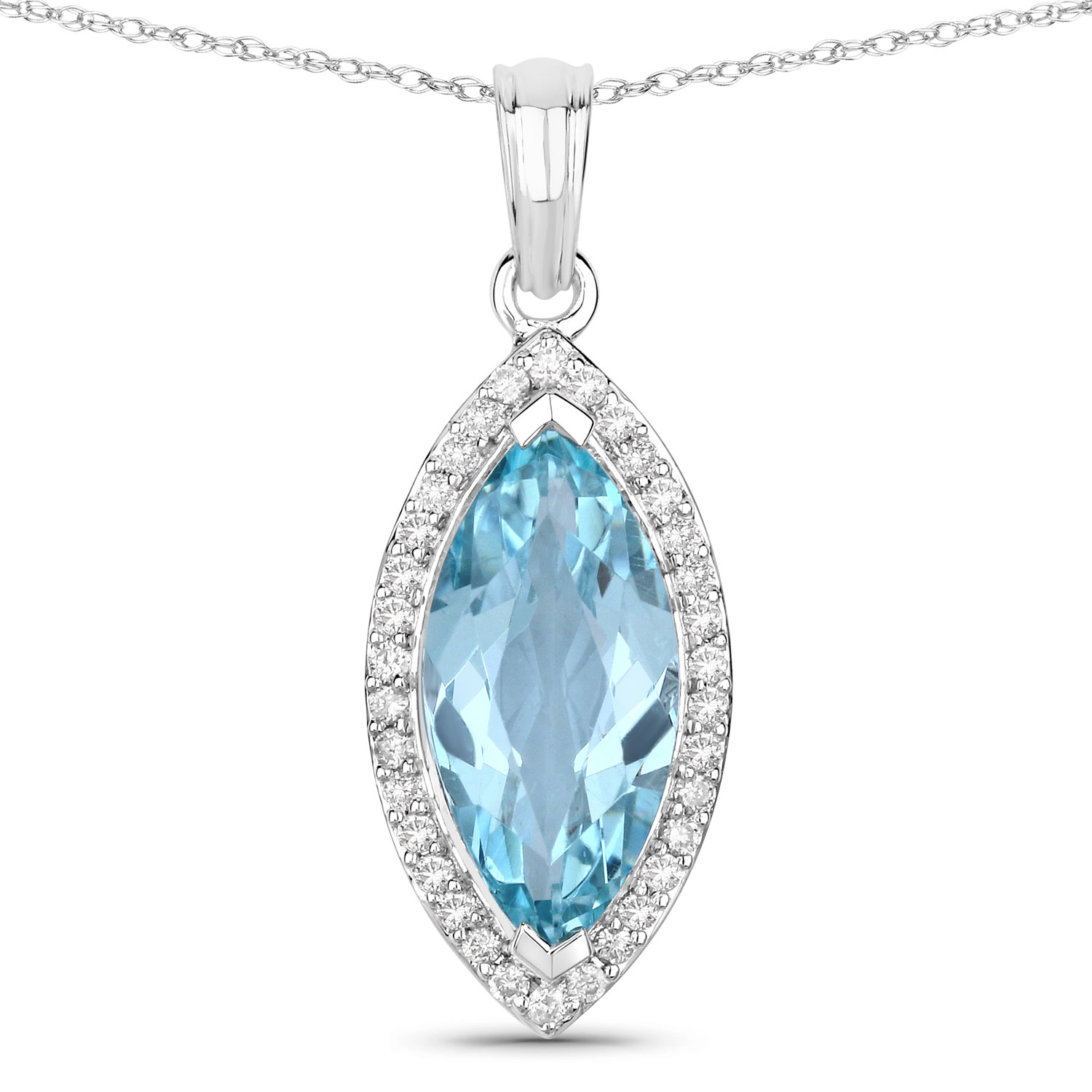 14 karat white gold 2.33 carat marquise-cut, spring-sky blue, genuine aquamarine and .22 carats total weight round, brilliant-cut, H-I color, I1 clarity diamonds in the halo. The pendant is approximately 1" long and the solid bail can accommodate an approximate 3.5mm wide chain. This item is eligible for appraisal by an independent appraiser (with qualifying credentials from GIA) without affiliation to Bidfair Fine Jewelry, at a discounted rate. Please contact Bidfair Fine Jewelry for more information on appraisals. This is a brand new item, with approved from the manufacturer for sale to the public, by auction. It is in excellent condition, but may have fine scratches from shipping or transportation. Admin: Q741/23ghn