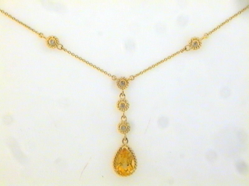 This is a 14 karat yellow gold lavalier, or drop, necklace that features a 1.75 carat, pear-cut, prong-set, genuine citrine in a twisted rope frame. This honey golden gemstone dangles approximately 1.50" from the main section of the 16" long fine rope necklace. There is .14 carats total weight of round, brilliant-cut, H, SI2-I1, bezel-set diamonds in this necklace, and they are all earth-mined. The diamonds in the drop and stations have striking twisted rope frames. The necklace closes with a lobster clasp. This is a brand new item with manufacturer’s approval to sale in a public auction. It is in excellent condition, but may have fine scratches from shipping or storage. Admin: G11241/45ngt