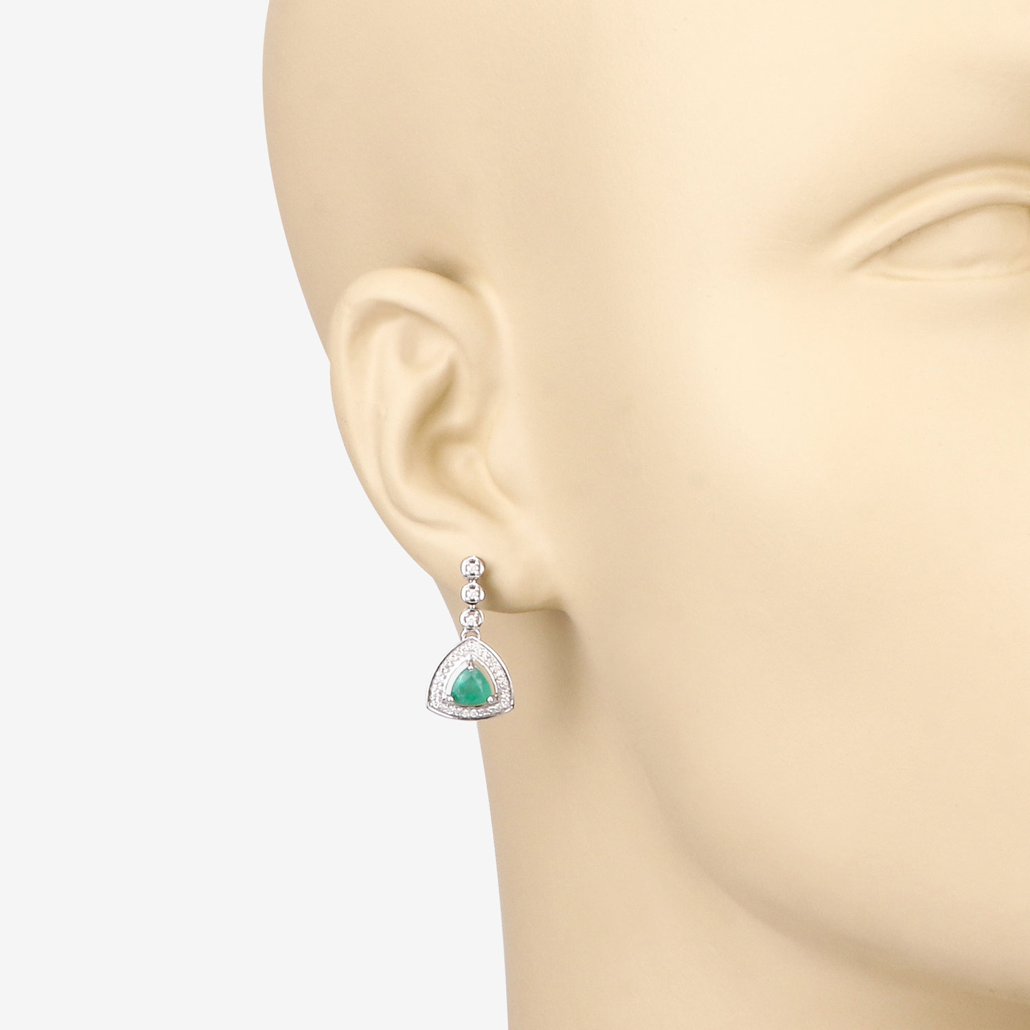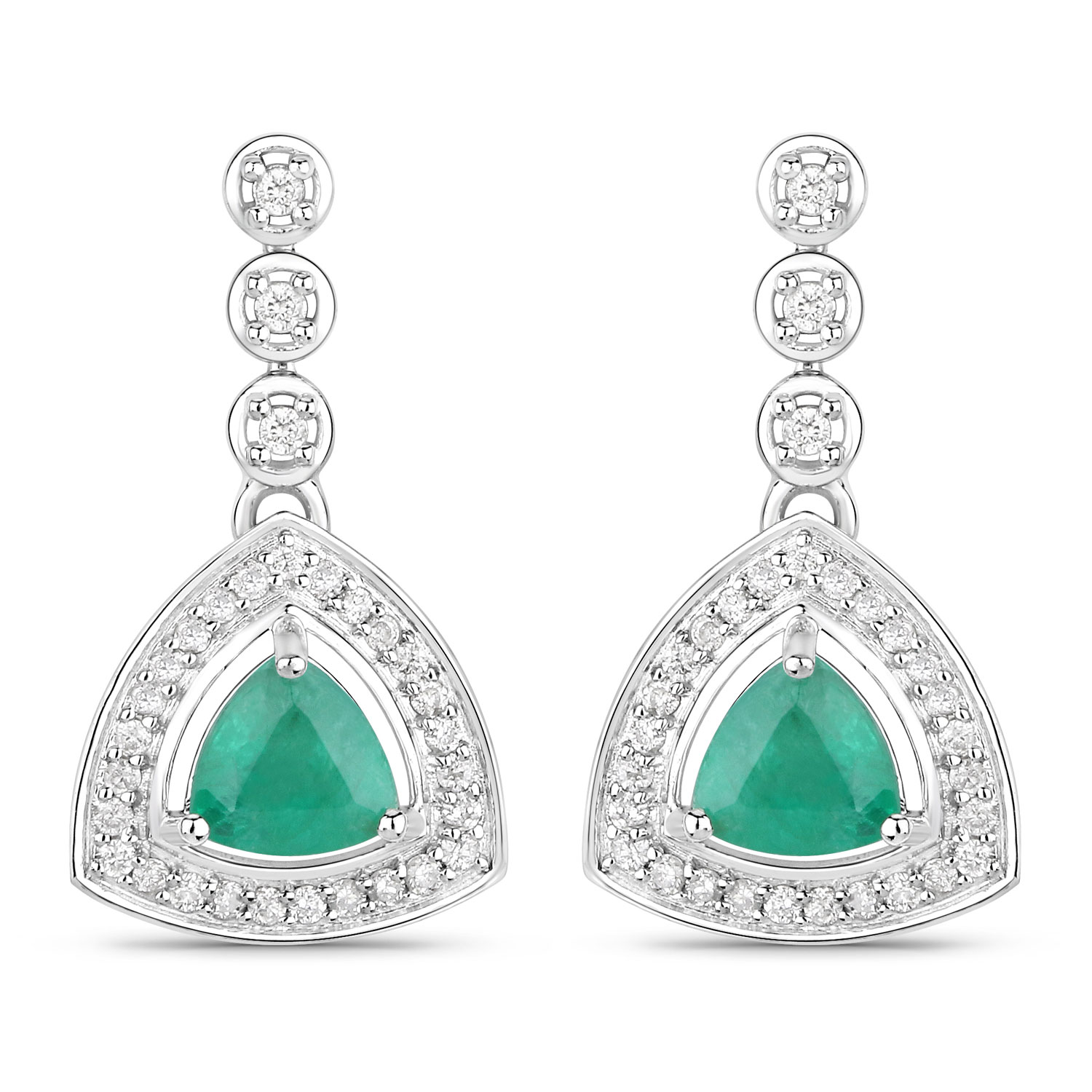 This pair of 14 karat white gold earrings feature 1.08 carats total weight of beautiful Zambian emeralds that are prong-set with .31 carats of round, brilliant-cut, H-I color, I1 clarity diamonds located in the halos and the drop stems. The earrings are approximately 7/8" long and attach to the earlobe with posts and friction backs. The dangle drops are individually hinged for movement, and no stiffness. This is a brand new item, with approved from the manufacturer for sale to the public, by auction. It is in excellent condition, but may have fine scratches from shipping or transportation. Admin: Q741/31gnb