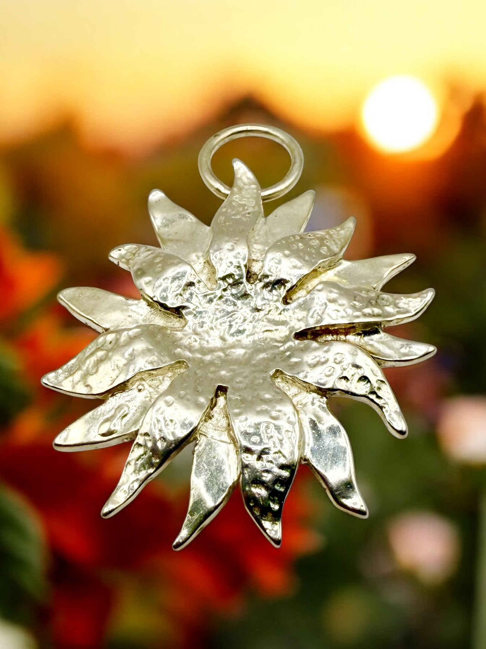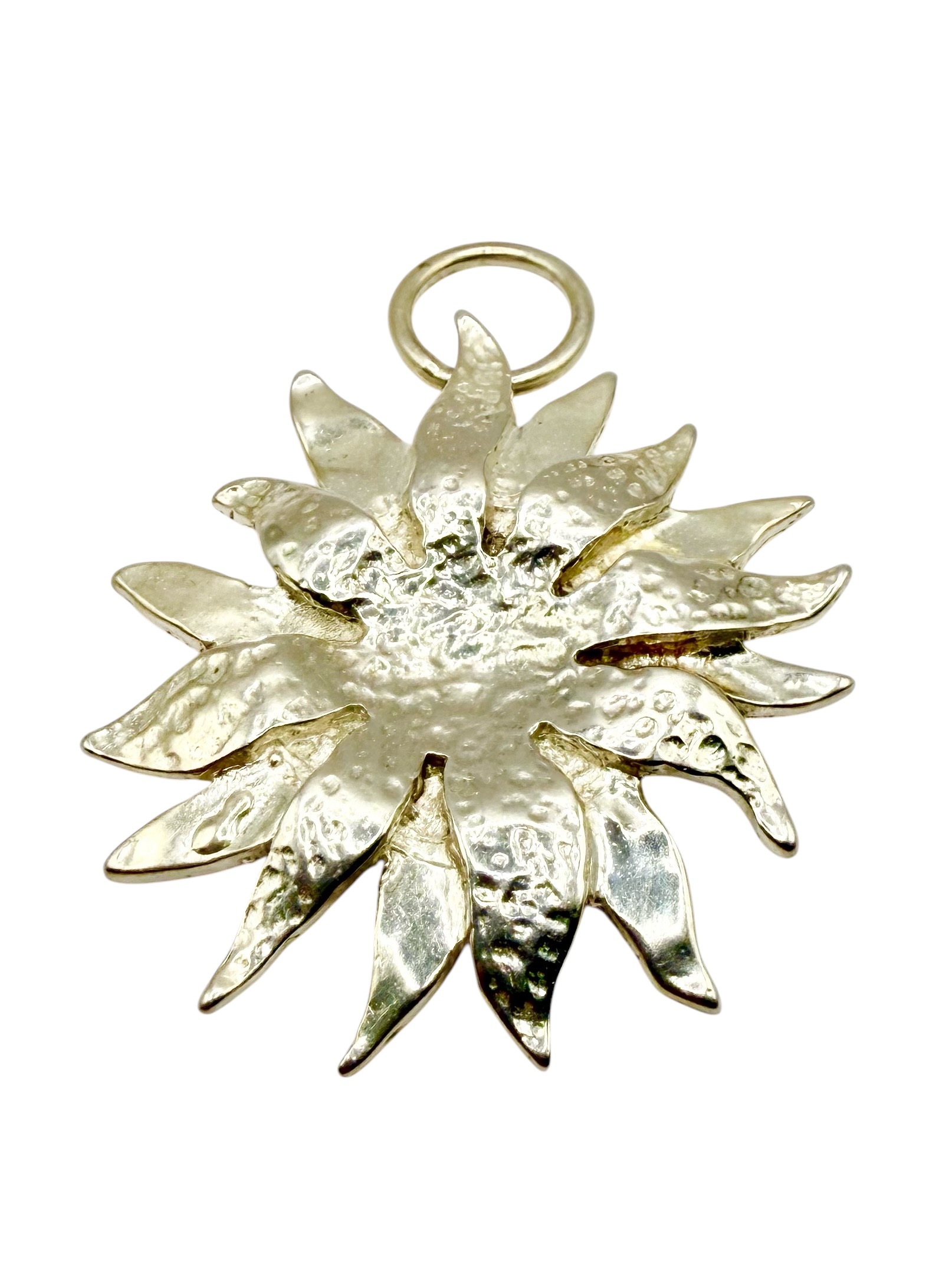 This is a beautiful sterling silver (.925) pendant, depicting a sunflower with full petals in the wind. The pendant is approximately 1.75" diameter and is dimensional with textured and polished rays. The pendant has a large jump ring. The hallmark is located at the end of one of the petals, and appears to be a "swan". This is an estate item that is in very good condition, with only signs of wear typical of jewelry from its era. Admin: KF3312/16hhh
