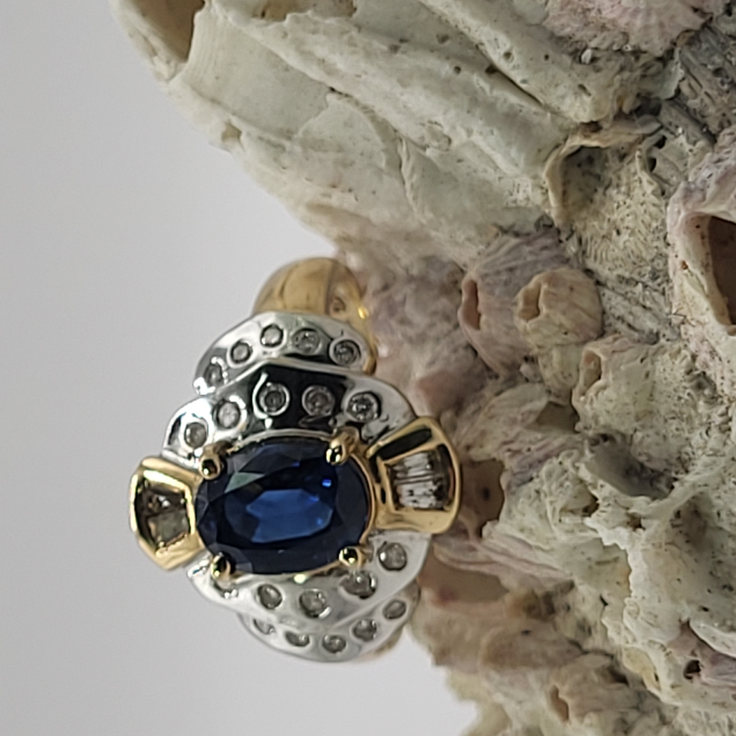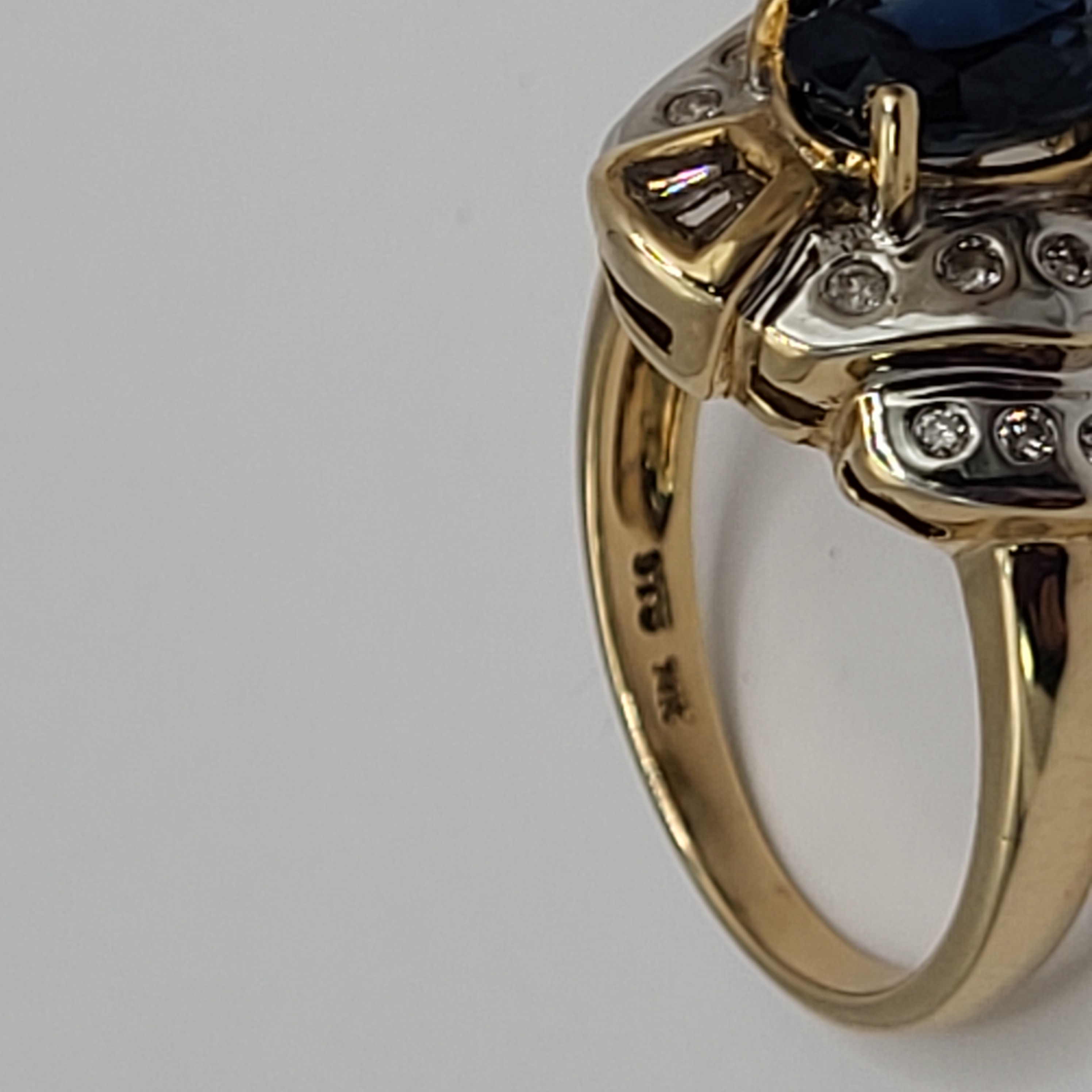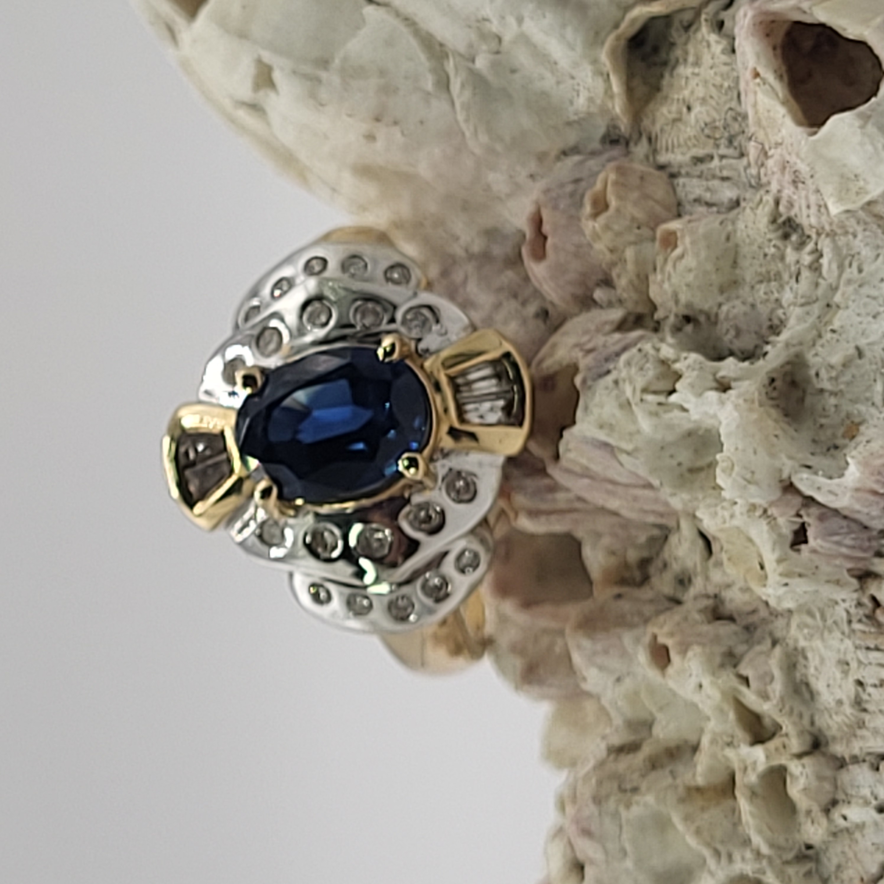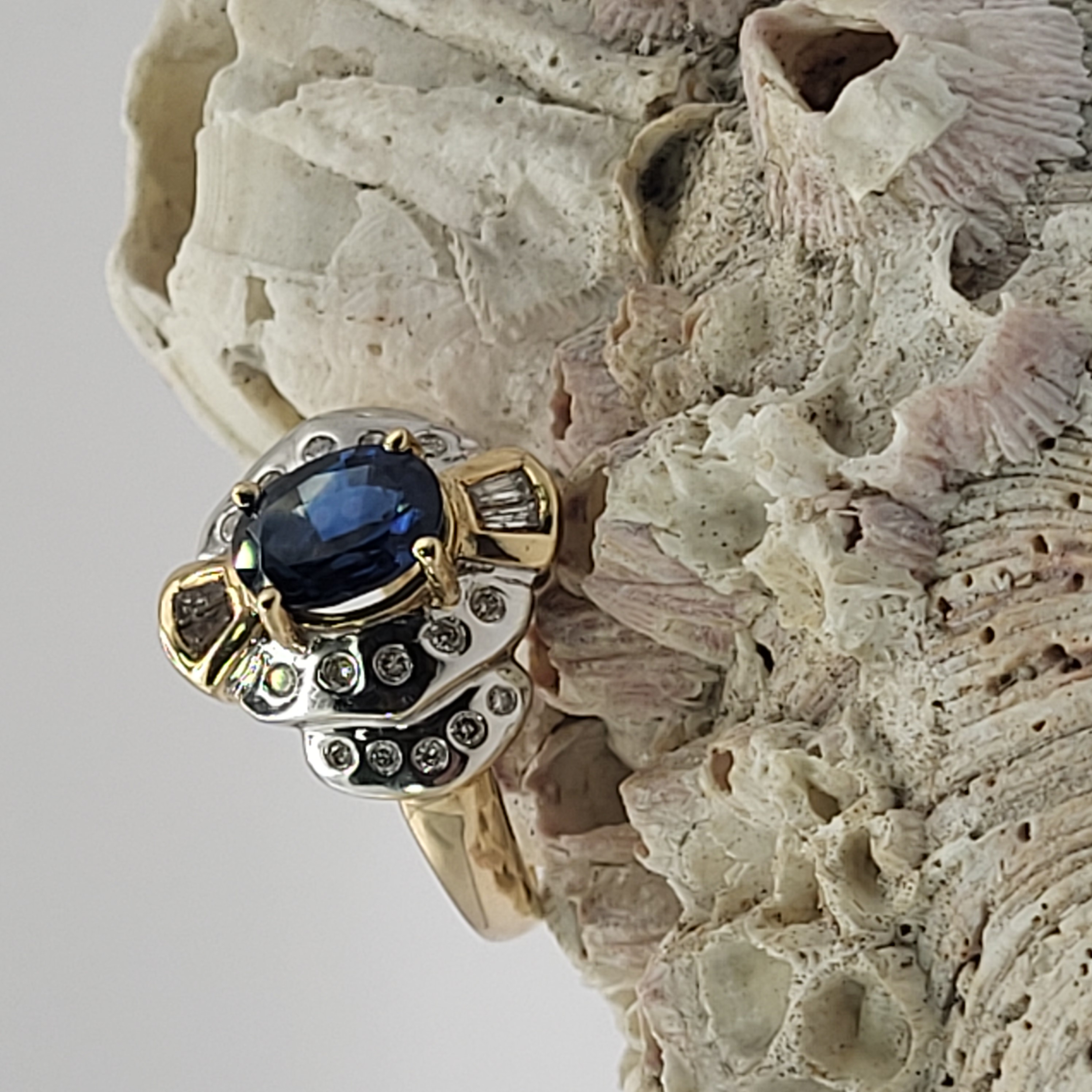 14K Yellow and White Gold ring with an approx 2.00 carat oval-cut, prong-set, natural blue sapphire and approx. .50 carats total weight round, brilliant- and baguette cut diamonds on the frame and stepped shoulders. approx size 7. Round diamonds are flush-set and baguette diamonds are prong-set. Admin:33109/13ltl