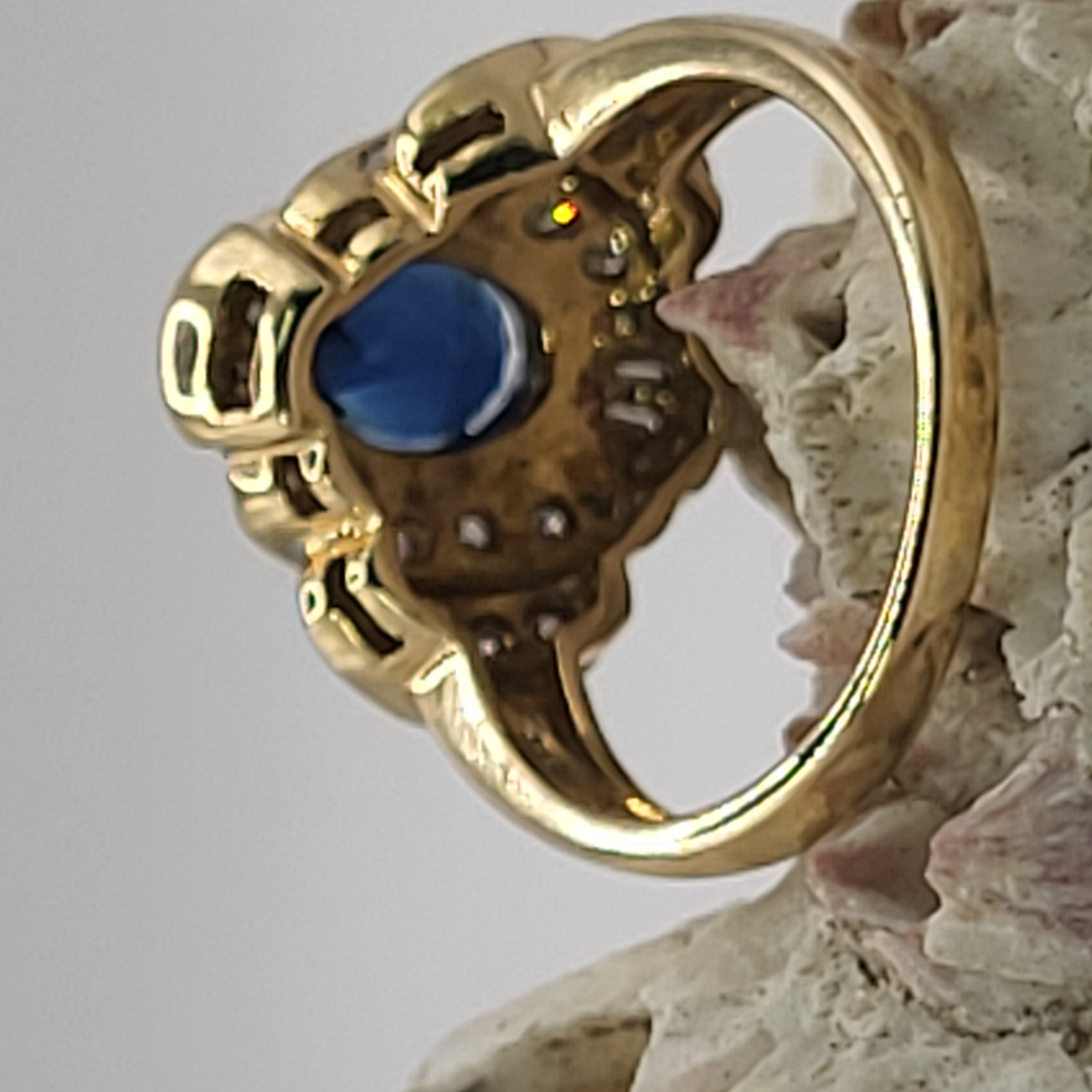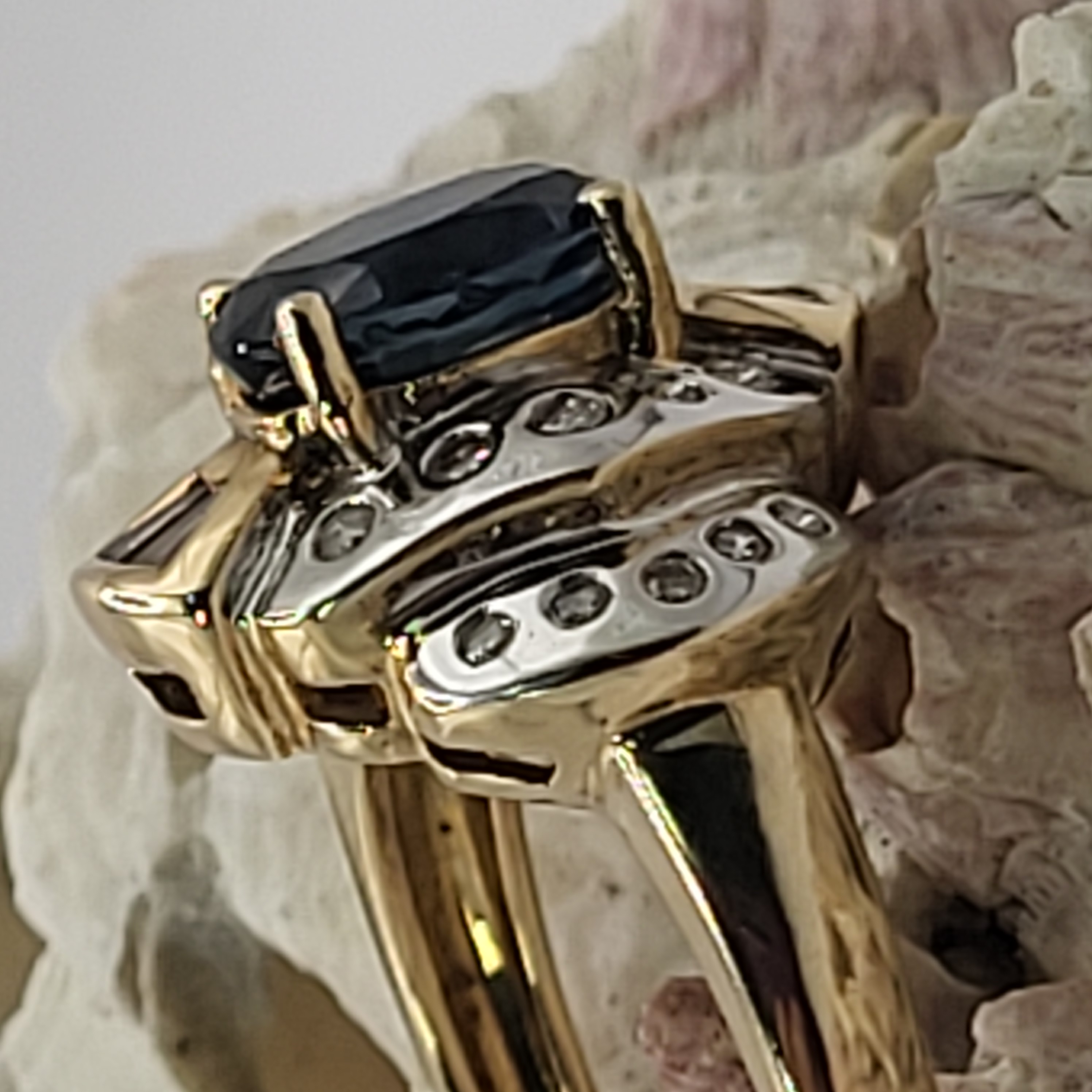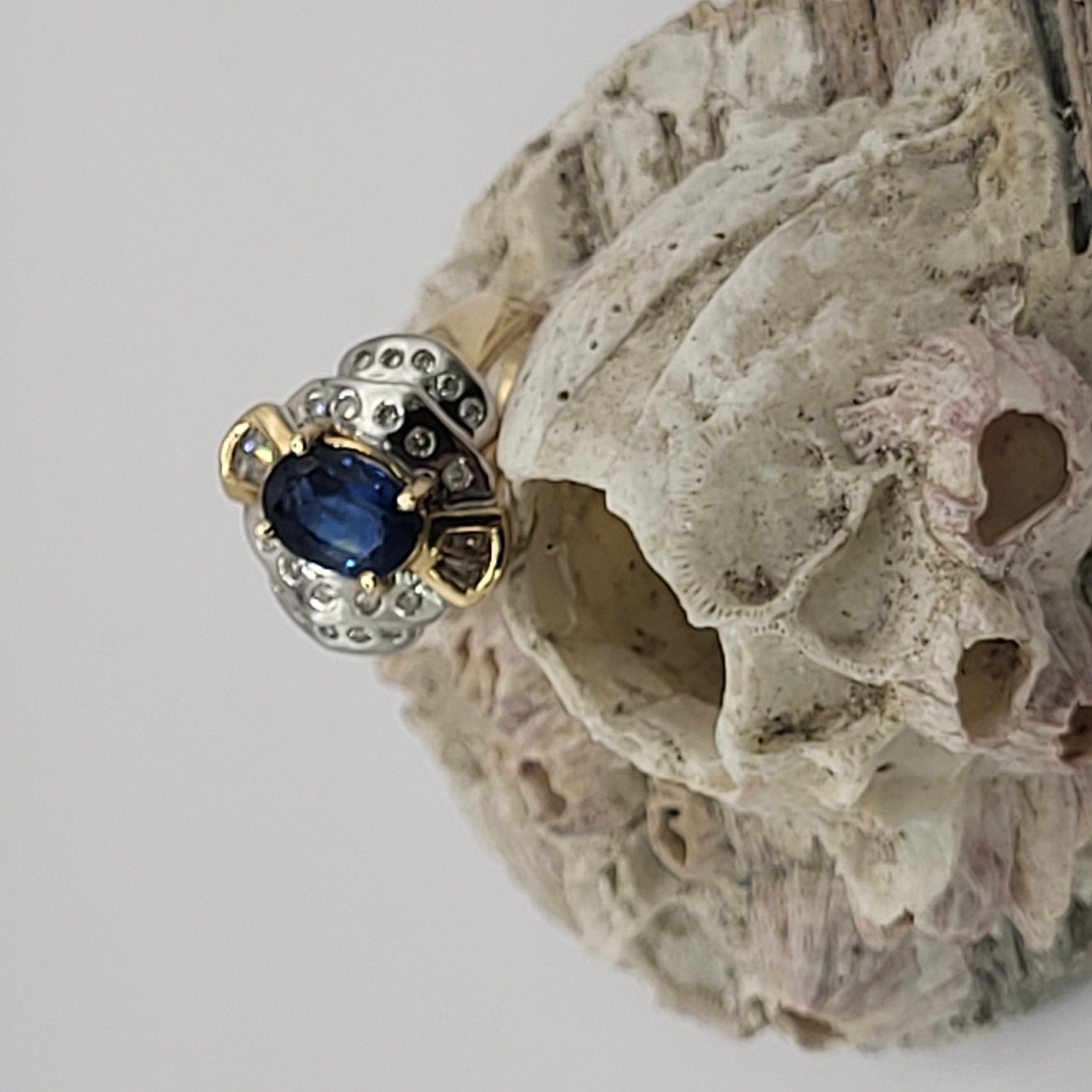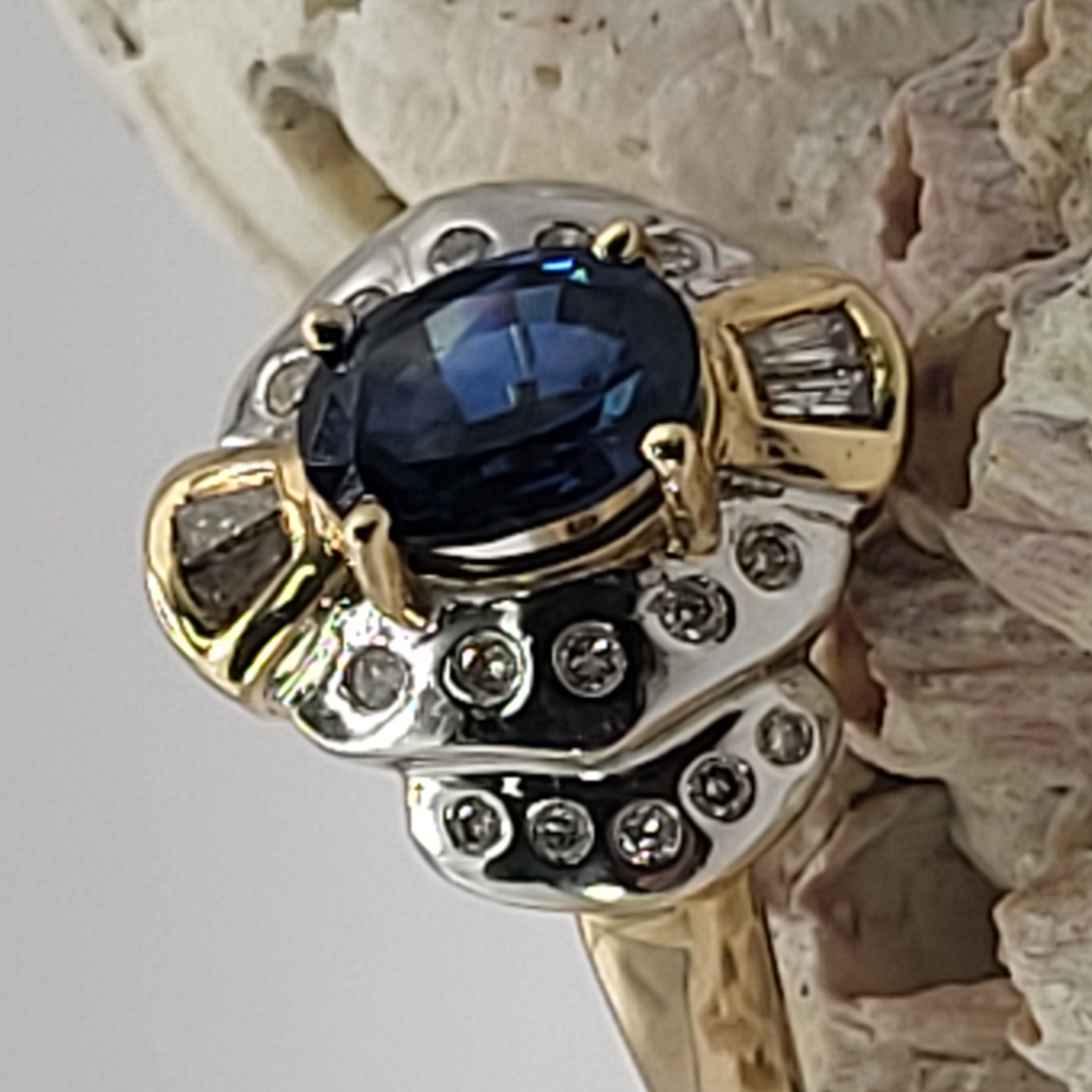 14K Yellow and White Gold ring with an approx 2.00 carat oval-cut, prong-set, natural blue sapphire and approx. .50 carats total weight round, brilliant- and baguette cut diamonds on the frame and stepped shoulders. approx size 7. Round diamonds are flush-set and baguette diamonds are prong-set. Admin:33109/13ltl