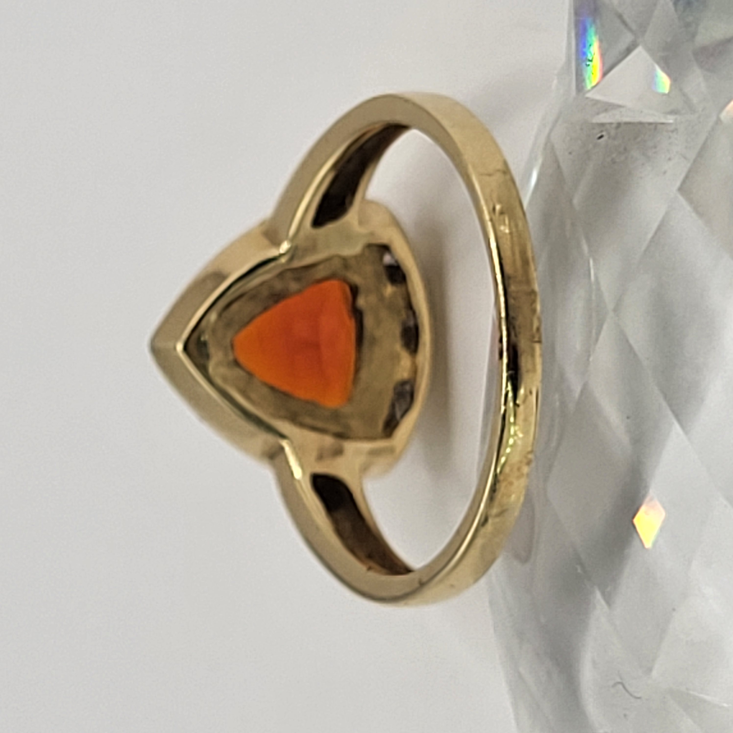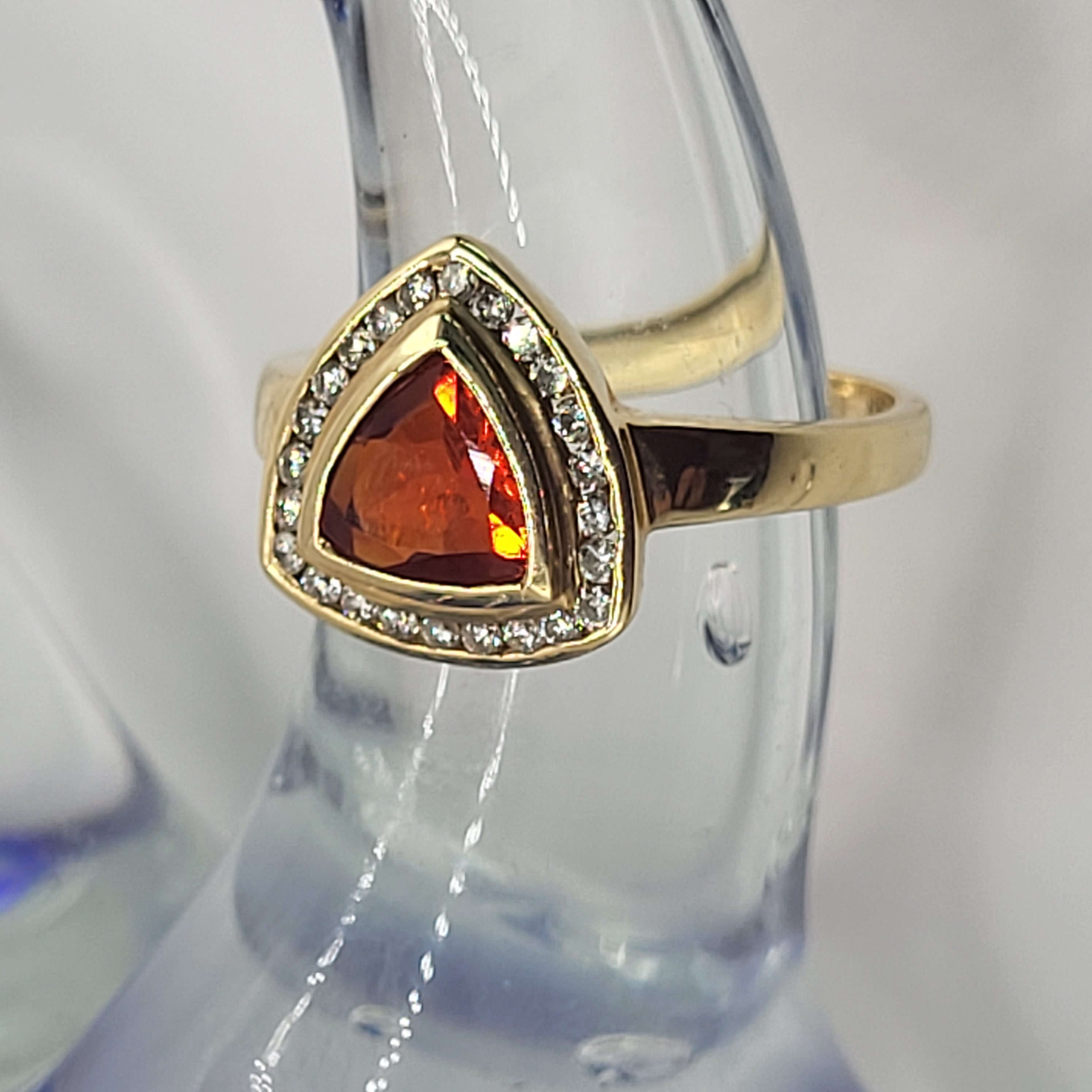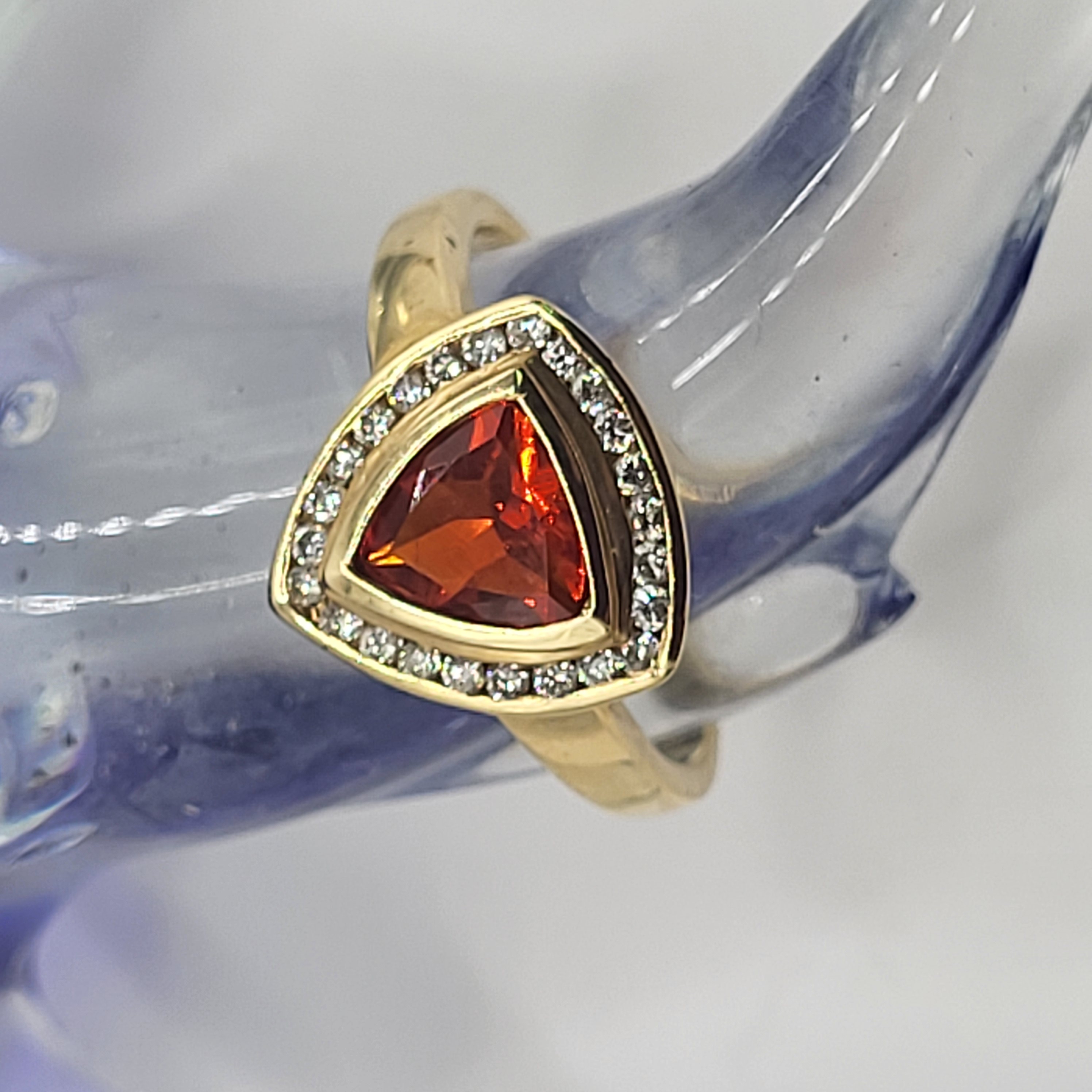 Clear and bright! This 14 karat yellow gold ring presents an approximate .50 carat, trilliant-cut, bezel-set, bright orange Fire Opal with a frame of approximately .25 carats total weight, round-brilliant-cut, approximate H-I color, I1 clarity diamonds. This ring is US size 6.5 and can be sized for an additional charge. This ring is eligible for appraisal at a discounted rate, by an independent appraiser (with qualifying credentials from GIA) and no affiliation to Bidfair Fine Jewelry. Please contact Bidfair Fine Jewelry for more information on appraisals and sizing.. This is a brand new item that has been held in back stock. It is in excellent condition, but may have minor signs of storage, such as fine scratches or patina. Admin: 3110/12bnn