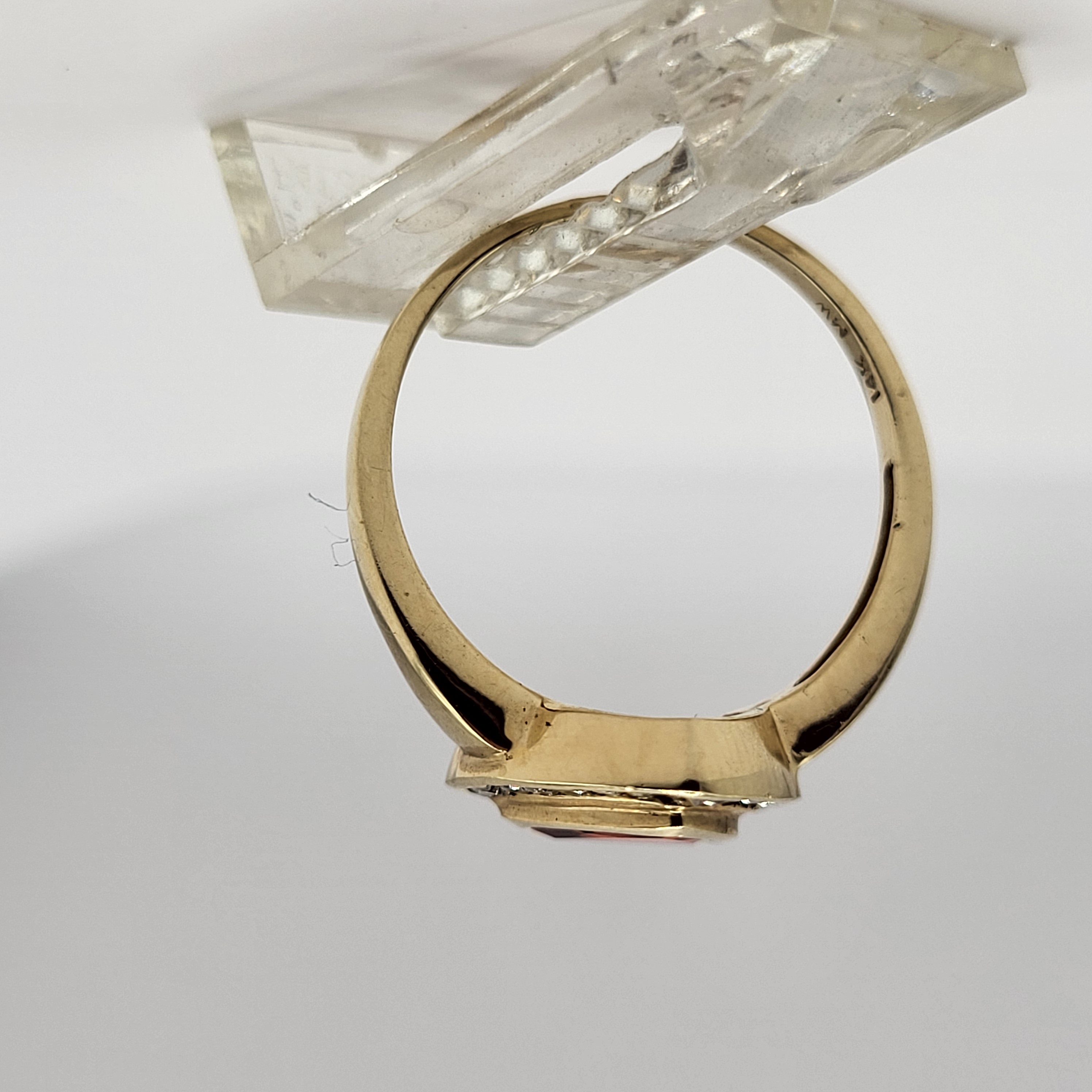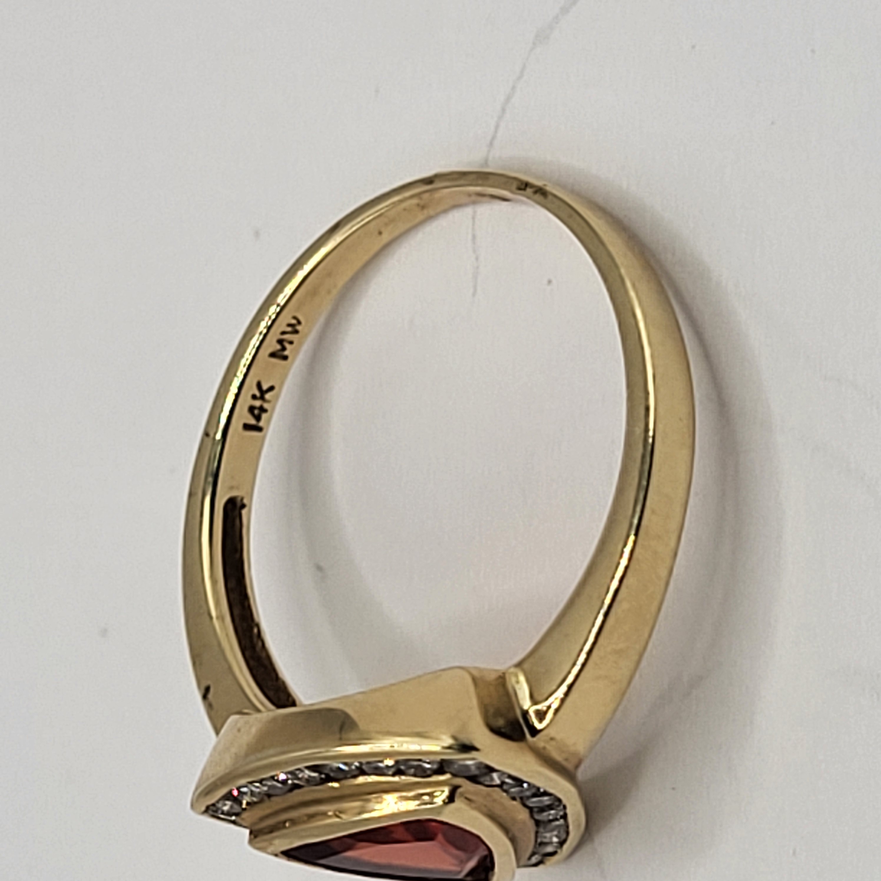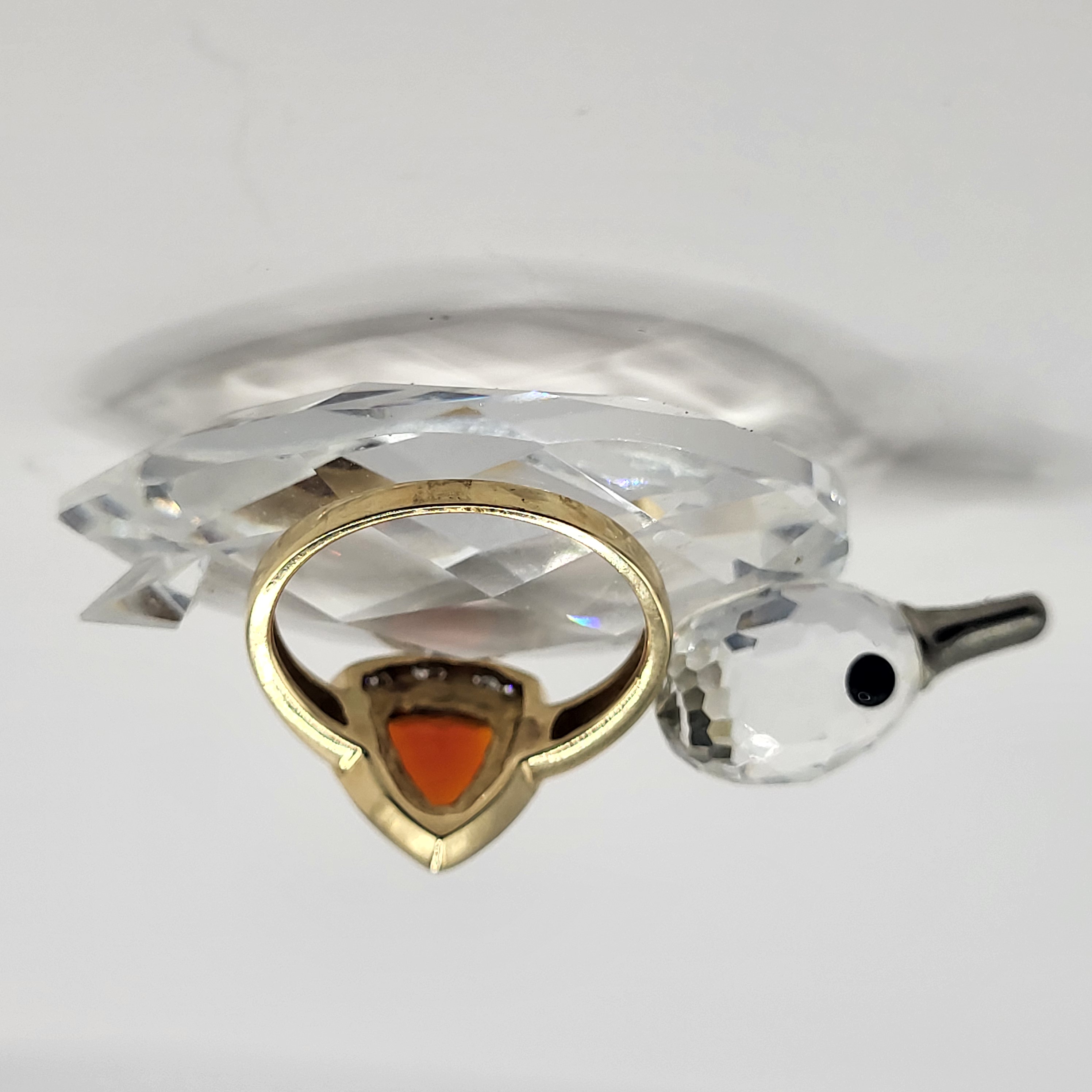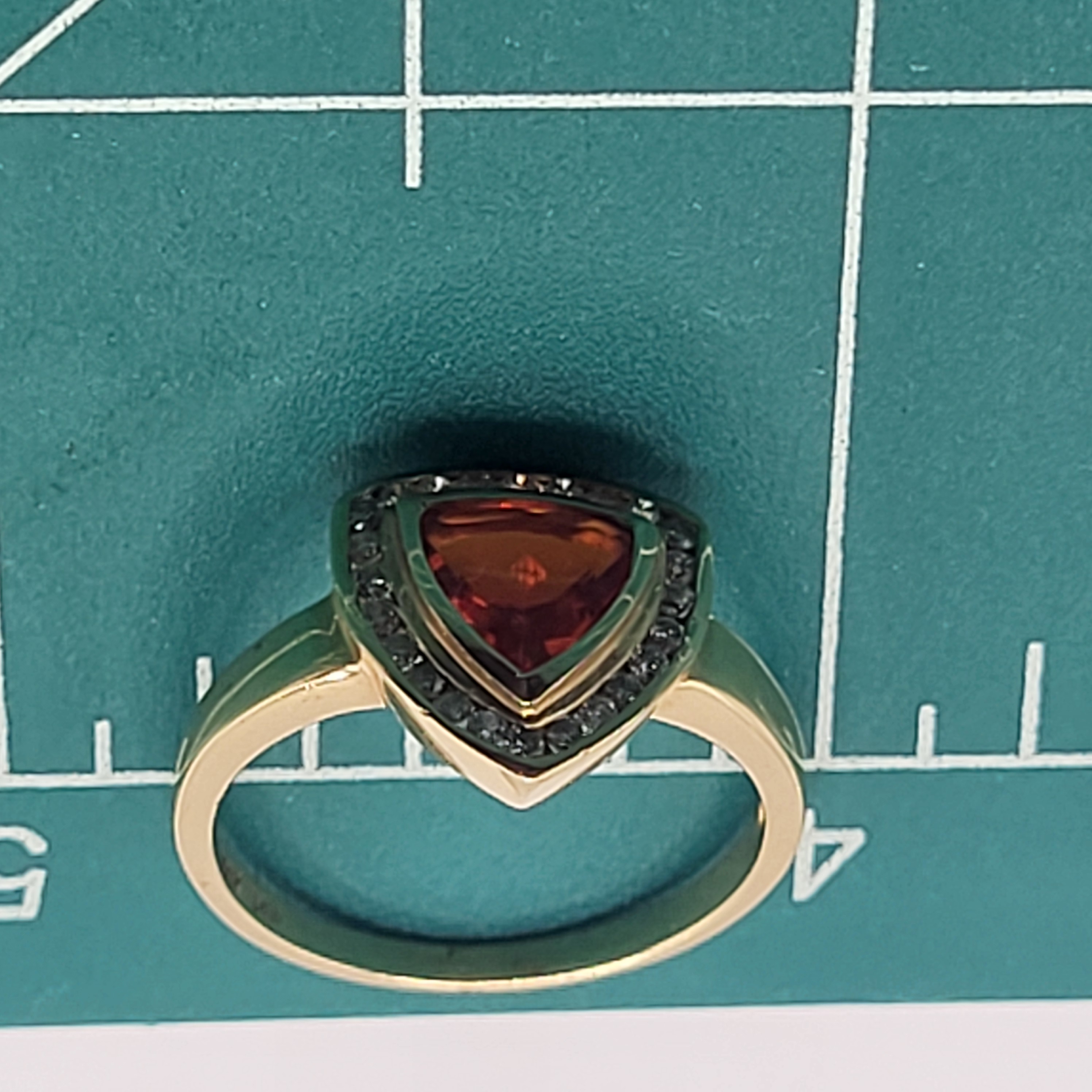 Clear and bright! This 14 karat yellow gold ring presents an approximate .50 carat, trilliant-cut, bezel-set, bright orange Fire Opal with a frame of approximately .25 carats total weight, round-brilliant-cut, approximate H-I color, I1 clarity diamonds. This ring is US size 6.5 and can be sized for an additional charge. This ring is eligible for appraisal at a discounted rate, by an independent appraiser (with qualifying credentials from GIA) and no affiliation to Bidfair Fine Jewelry. Please contact Bidfair Fine Jewelry for more information on appraisals and sizing.. This is a brand new item that has been held in back stock. It is in excellent condition, but may have minor signs of storage, such as fine scratches or patina. Admin: 3110/12bnn