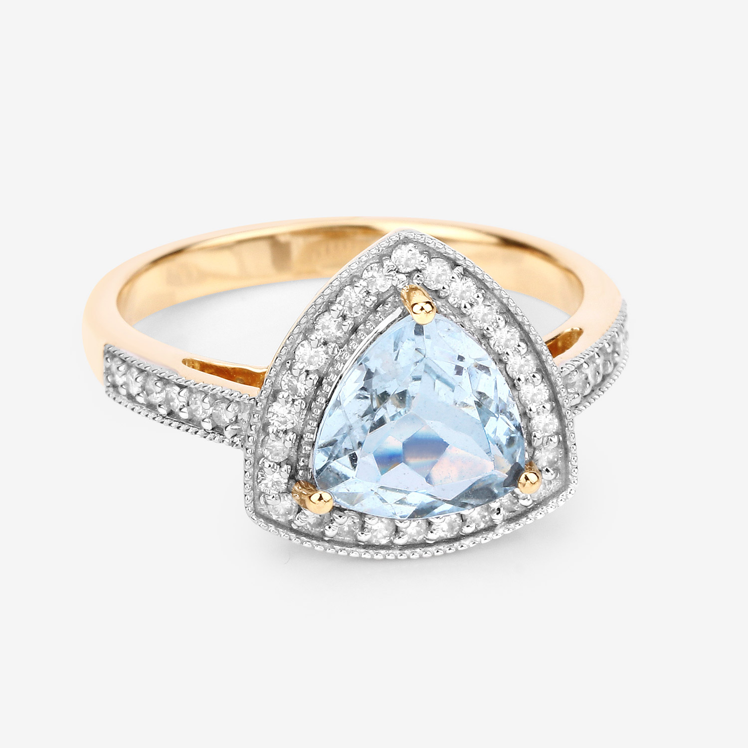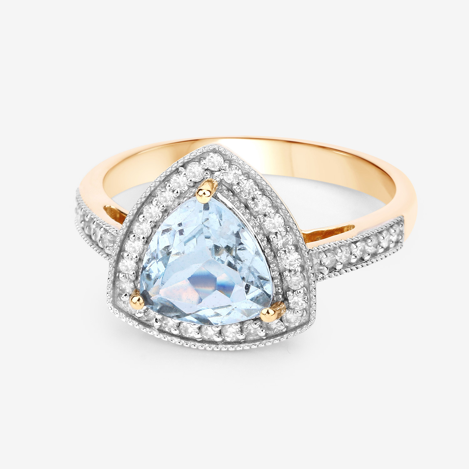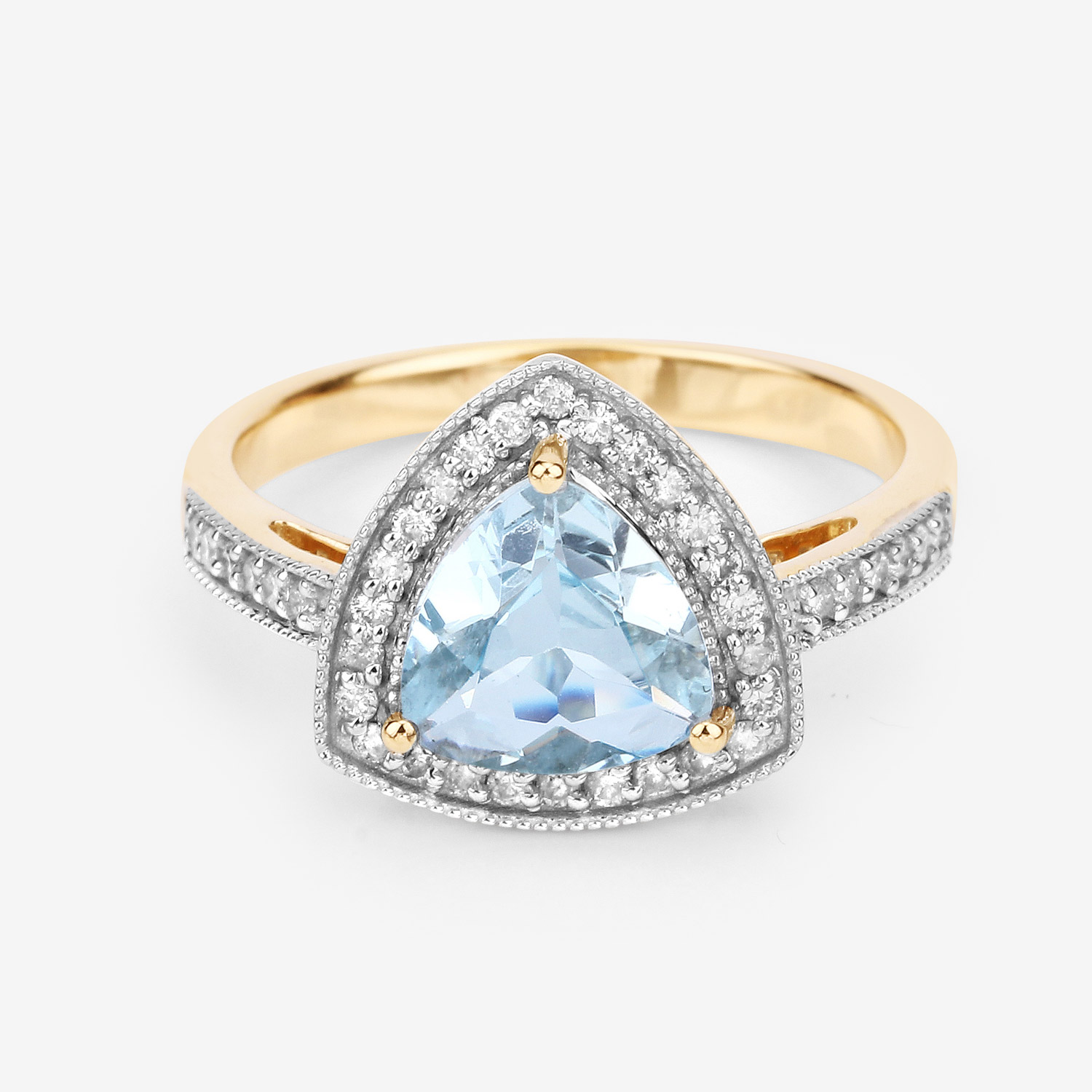 This 14 karat yellow gold ring features an approximate 1.33 carat trilliant-cut, prong-set, genuine aquamarine with approximately .25 carats total weight of round, brilliant-cut, H-I color, I1 clarity diamonds in the floating halo and cathedral-style shoulders.  The ring measures approximately 1/2" between the knuckles and is US size 7.25. It can be sized for an additional charge. This item is eligible for appraisal by an independent appraiser (with qualifying credentials from GIA) without affiliation to Bidfair Fine Jewelry, at a discounted rate. Please contact Bidfair Fine Jewelry for more information on appraisals and sizing.  This is a brand new item, with approved from the manufacturer for sale to the public, by auction. It is in excellent condition, but may have fine scratches from shipping or travel.                 Admin: Q741/8nth