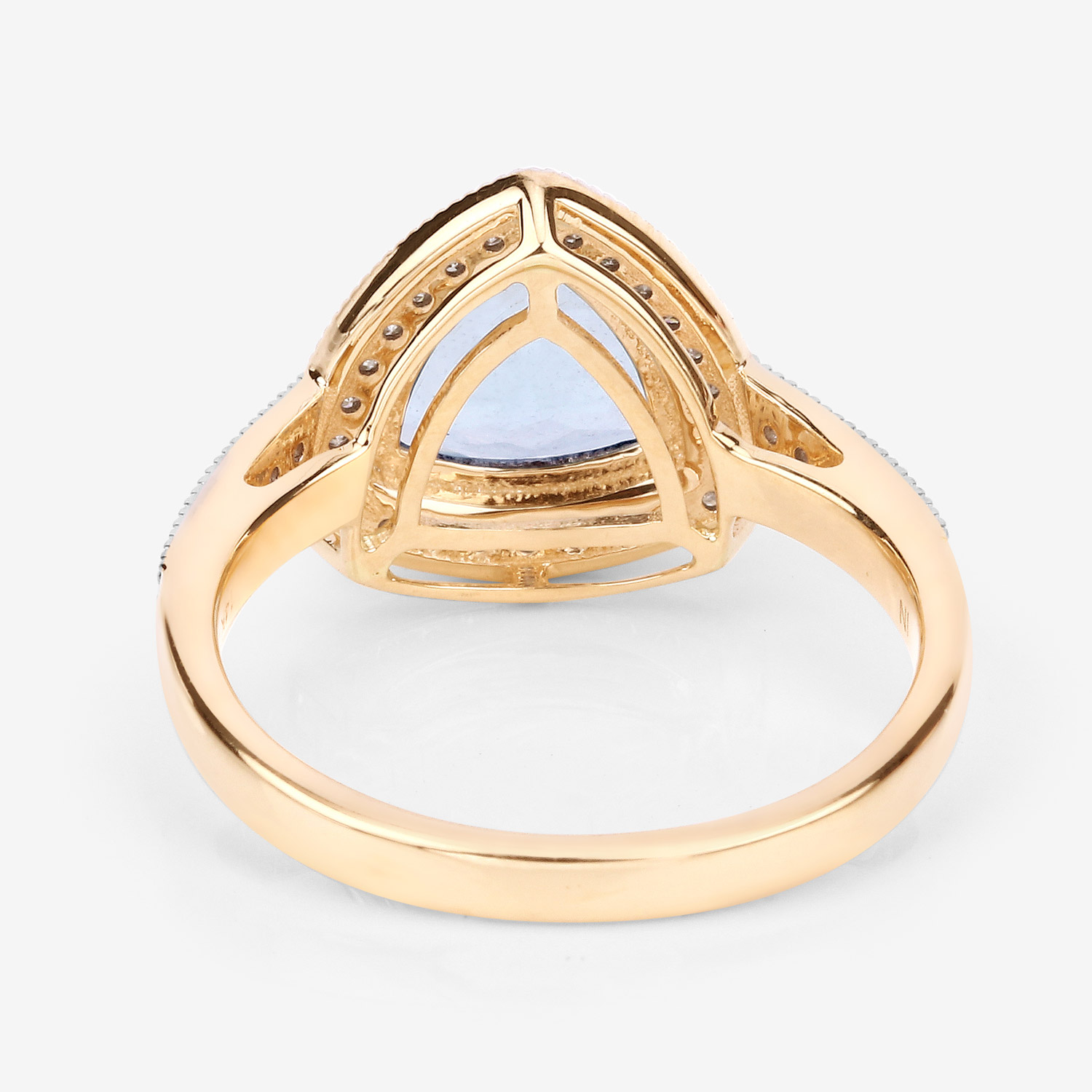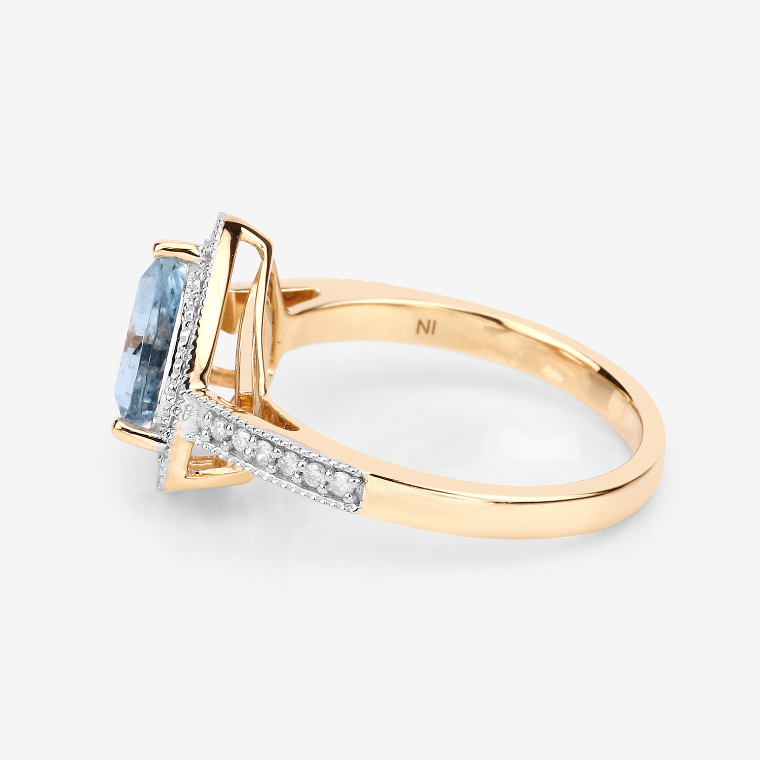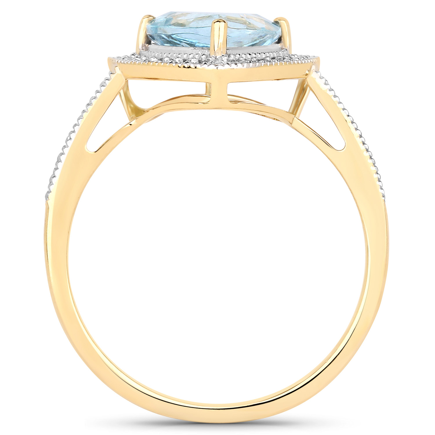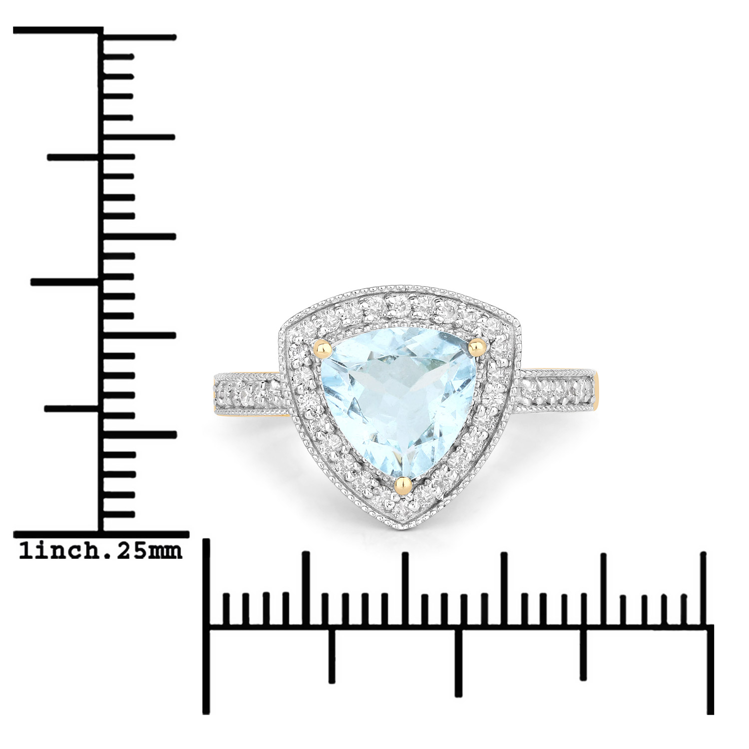 This 14 karat yellow gold ring features an approximate 1.33 carat trilliant-cut, prong-set, genuine aquamarine with approximately .25 carats total weight of round, brilliant-cut, H-I color, I1 clarity diamonds in the floating halo and cathedral-style shoulders.  The ring measures approximately 1/2" between the knuckles and is US size 7.25. It can be sized for an additional charge. This item is eligible for appraisal by an independent appraiser (with qualifying credentials from GIA) without affiliation to Bidfair Fine Jewelry, at a discounted rate. Please contact Bidfair Fine Jewelry for more information on appraisals and sizing.  This is a brand new item, with approved from the manufacturer for sale to the public, by auction. It is in excellent condition, but may have fine scratches from shipping or travel.                 Admin: Q741/8nth