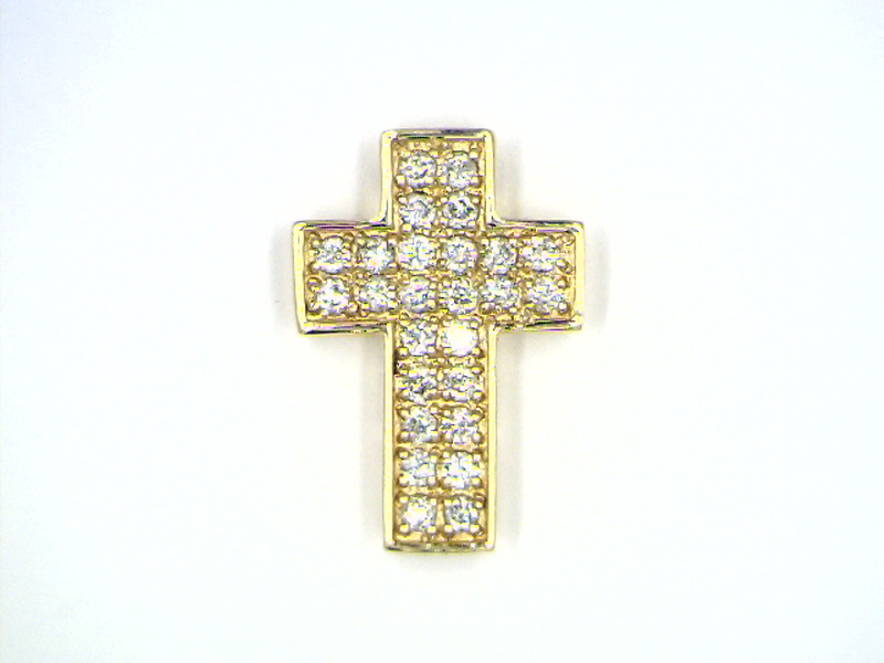 This is a 14 karat yellow gold religious pendant that is set with nearly a carat (.99 carats total weight) of round, brilliant, I color, I1-I2 clarity diamonds. The pendant is approximately 1"L x 5/8"W x 2.25mm thick. This is a pendant only and does NOT include a chain. This is a brand new item with manufacturer’s approval to sale in a public auction. It is in excellent condition, but may have fine scratches from shipping or storage. Admin: G11241/18ttt