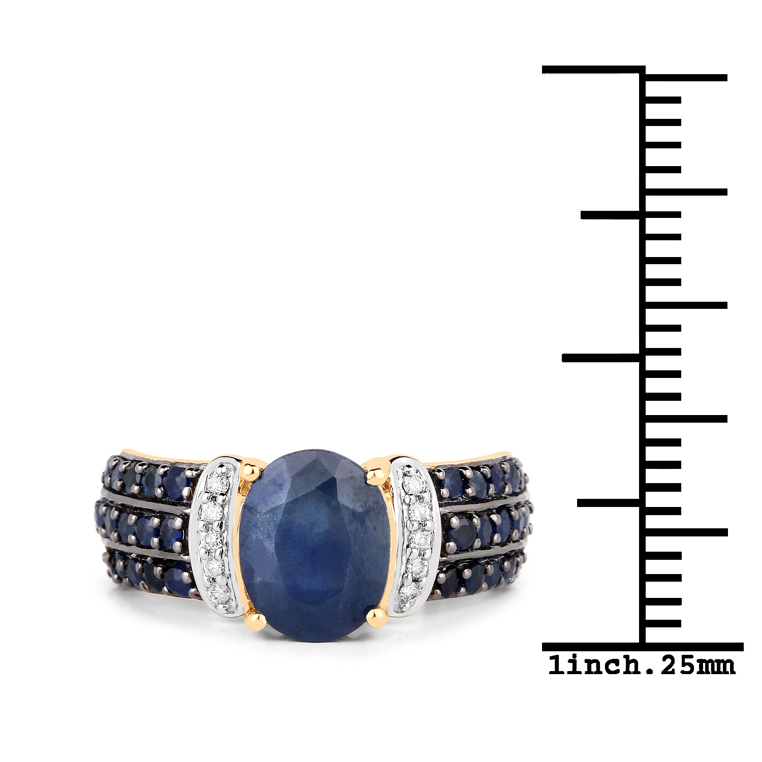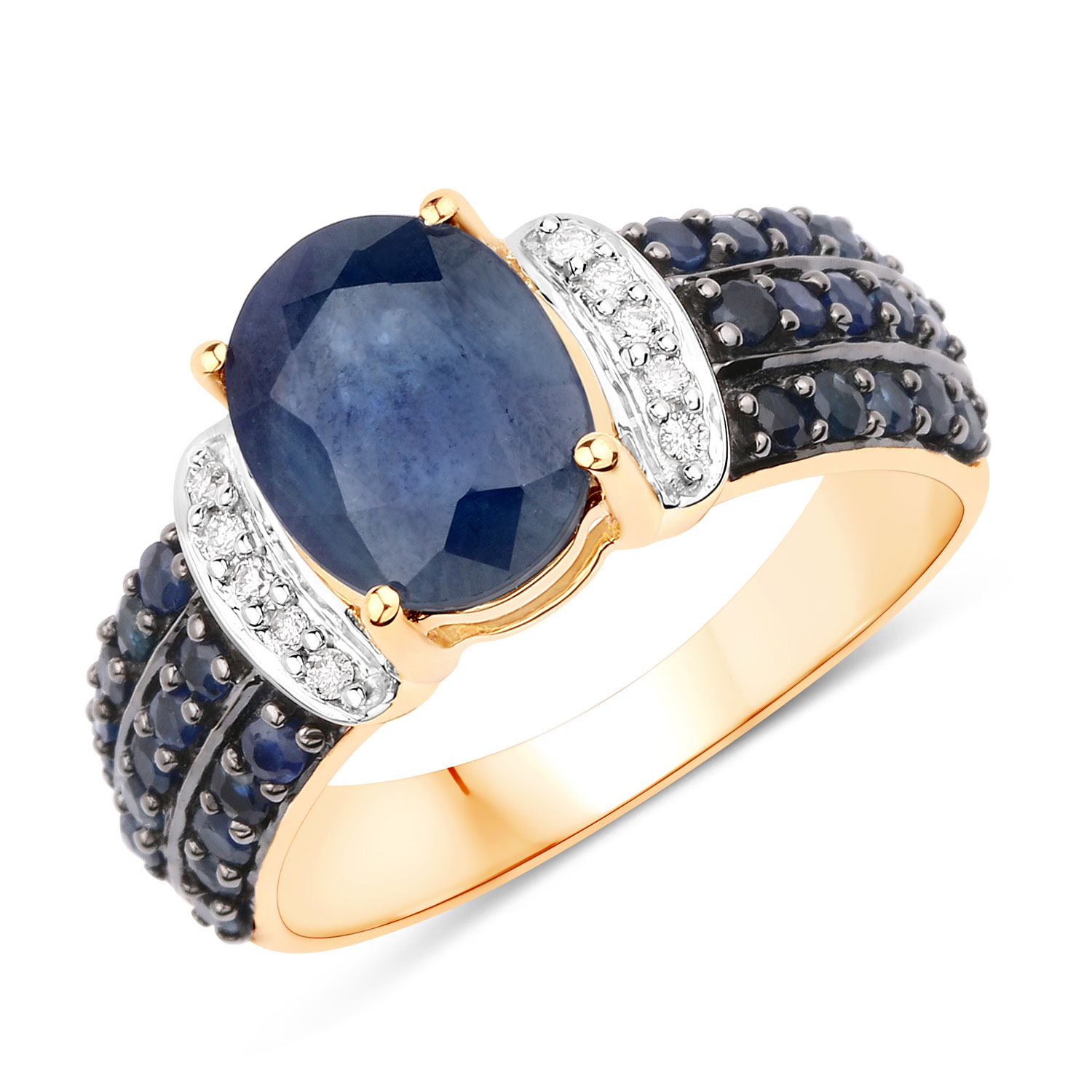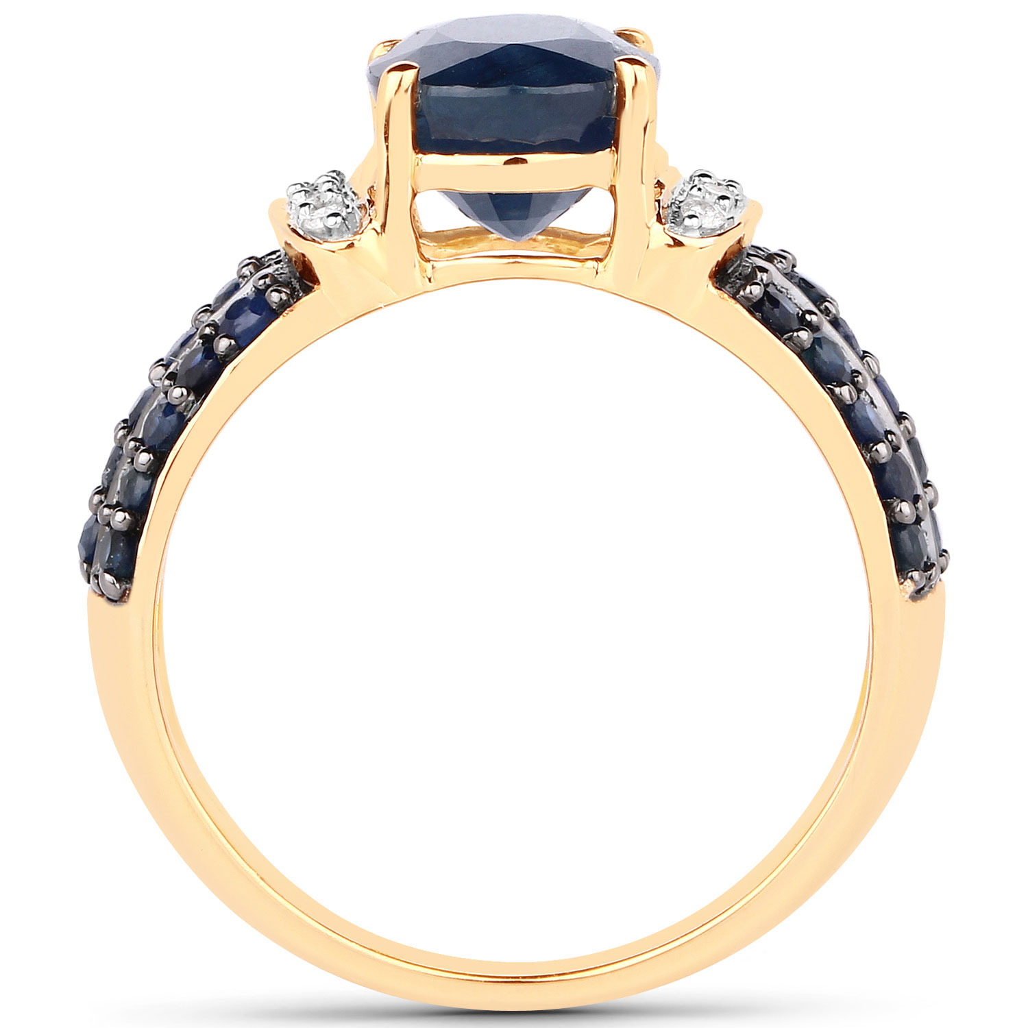 This 14 karat yellow gold ring 1.95 carat oval-cut, .90 carats total weight round, faceted, dark blue sapphires