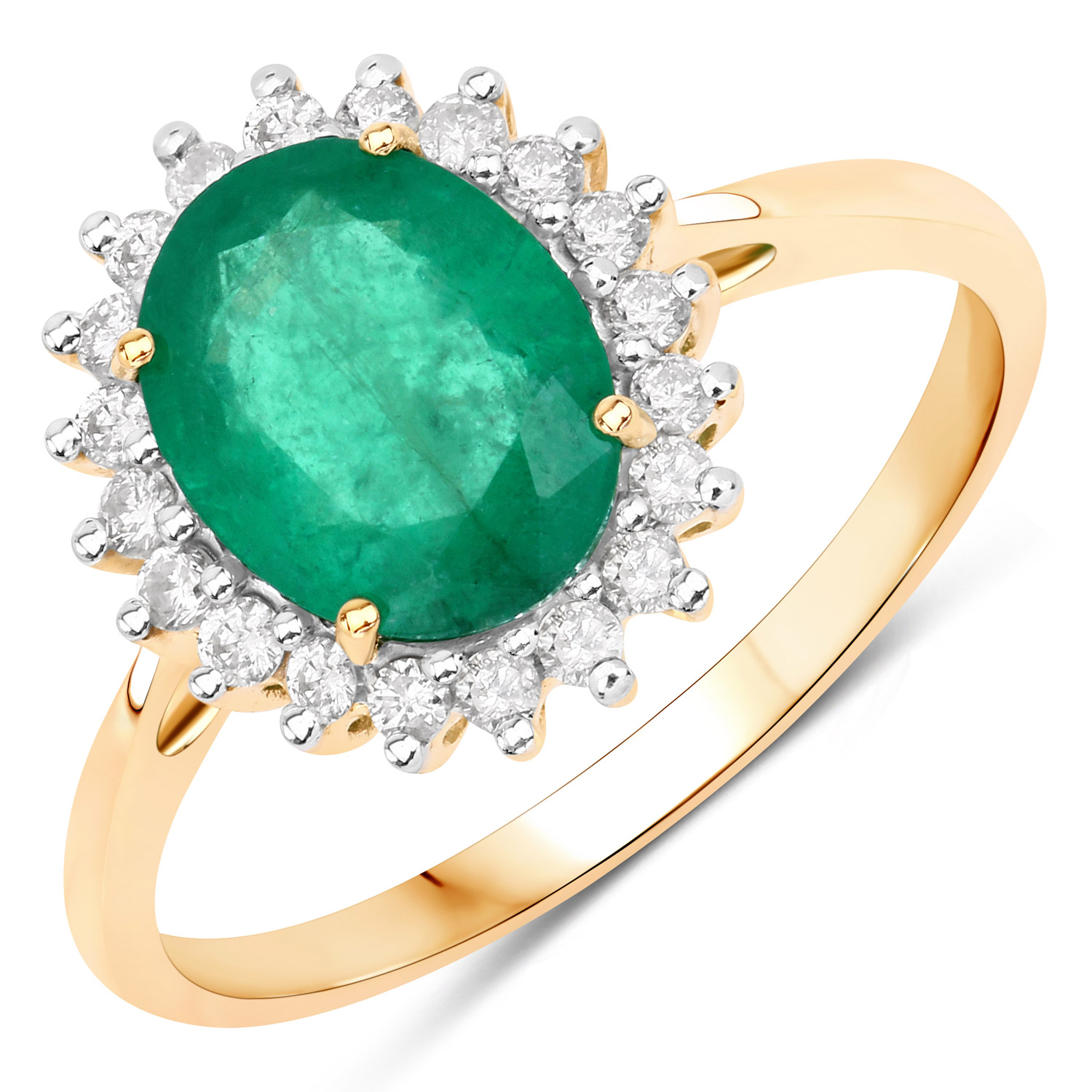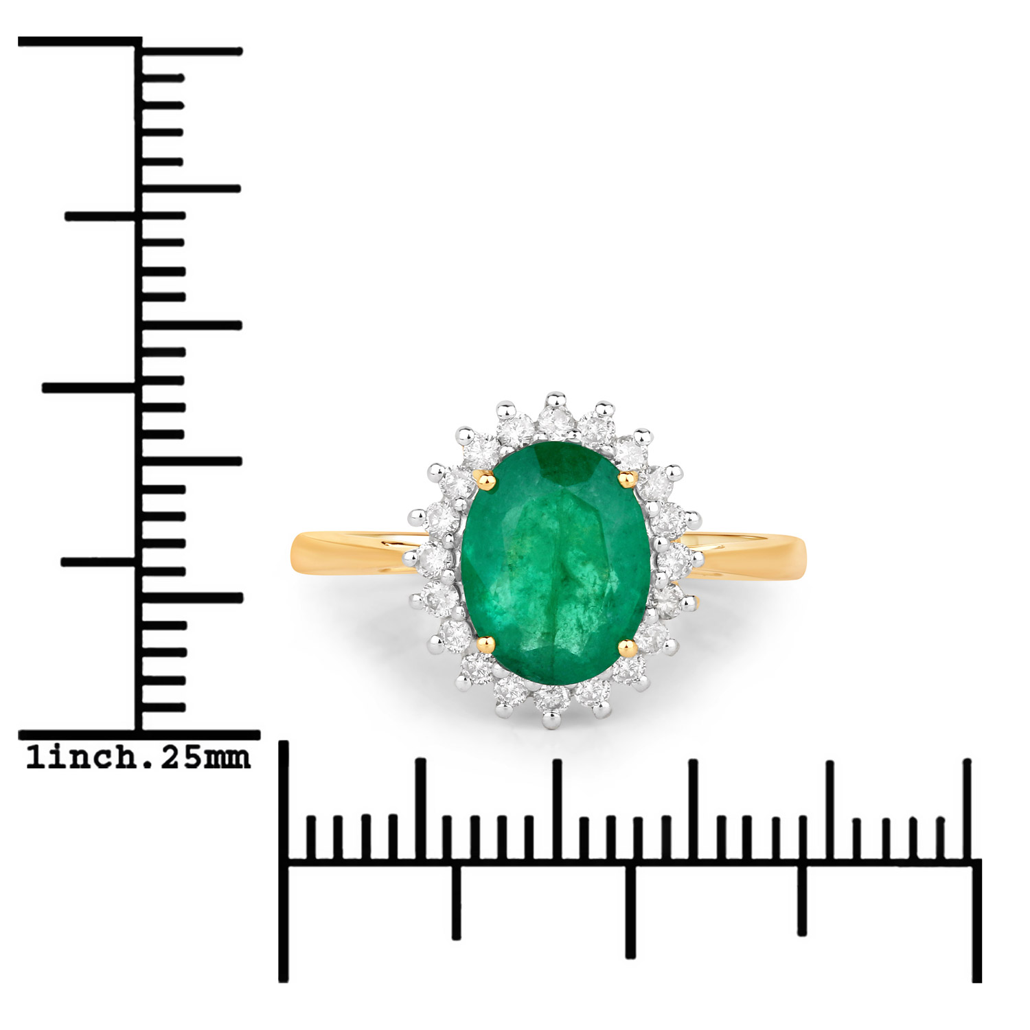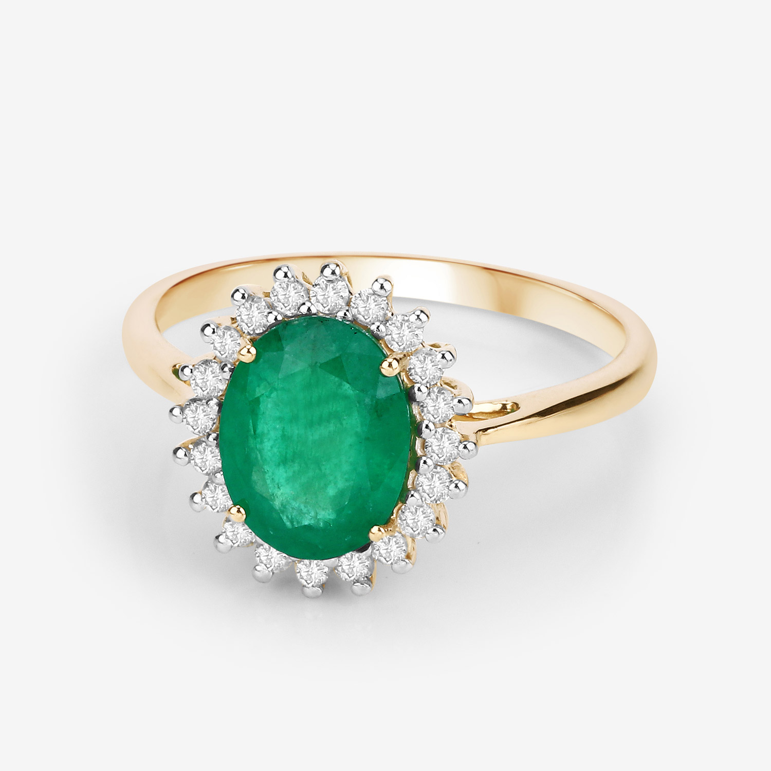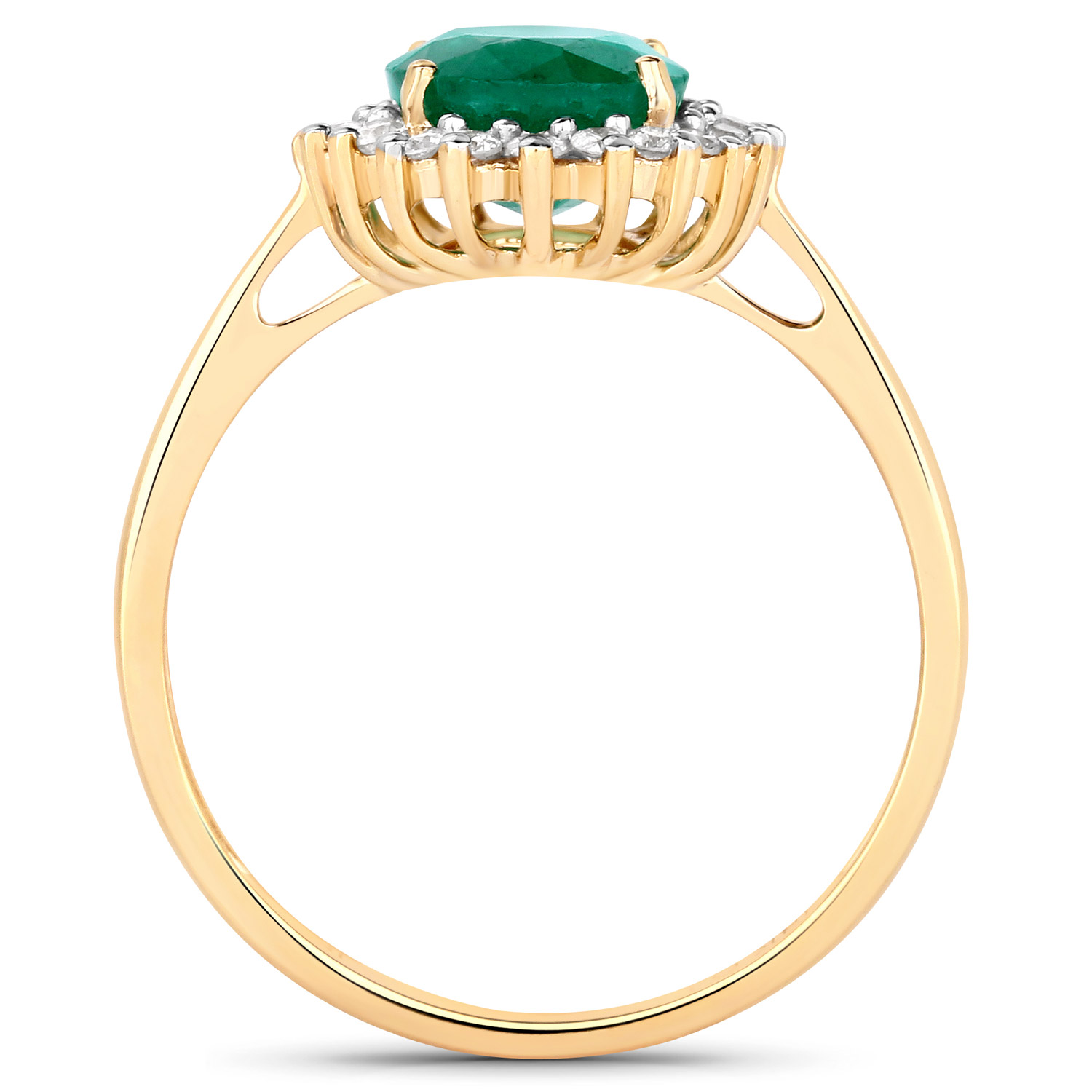 karat yellow gold 1.65 carat oval-cut, Zambian emerald is prong-set with .22 carats of round, brilliant-cut, H-I color, I1 clarity diamonds in the halo. The slightly raised shoulders taper to an approximate 1.75mm shank. The top of the ring spans approximately 1/2" between the knuckles. This ring is US size 7 and can be sized for an additional charge. Please contact Bidfair Fine Jewelry for sizing details. This is a brand new item, with approved from the manufacturer for sale to the public, by auction. It is in excellent condition, but may have fine scratches from shipping or transportation. Admin:Q741/16glr