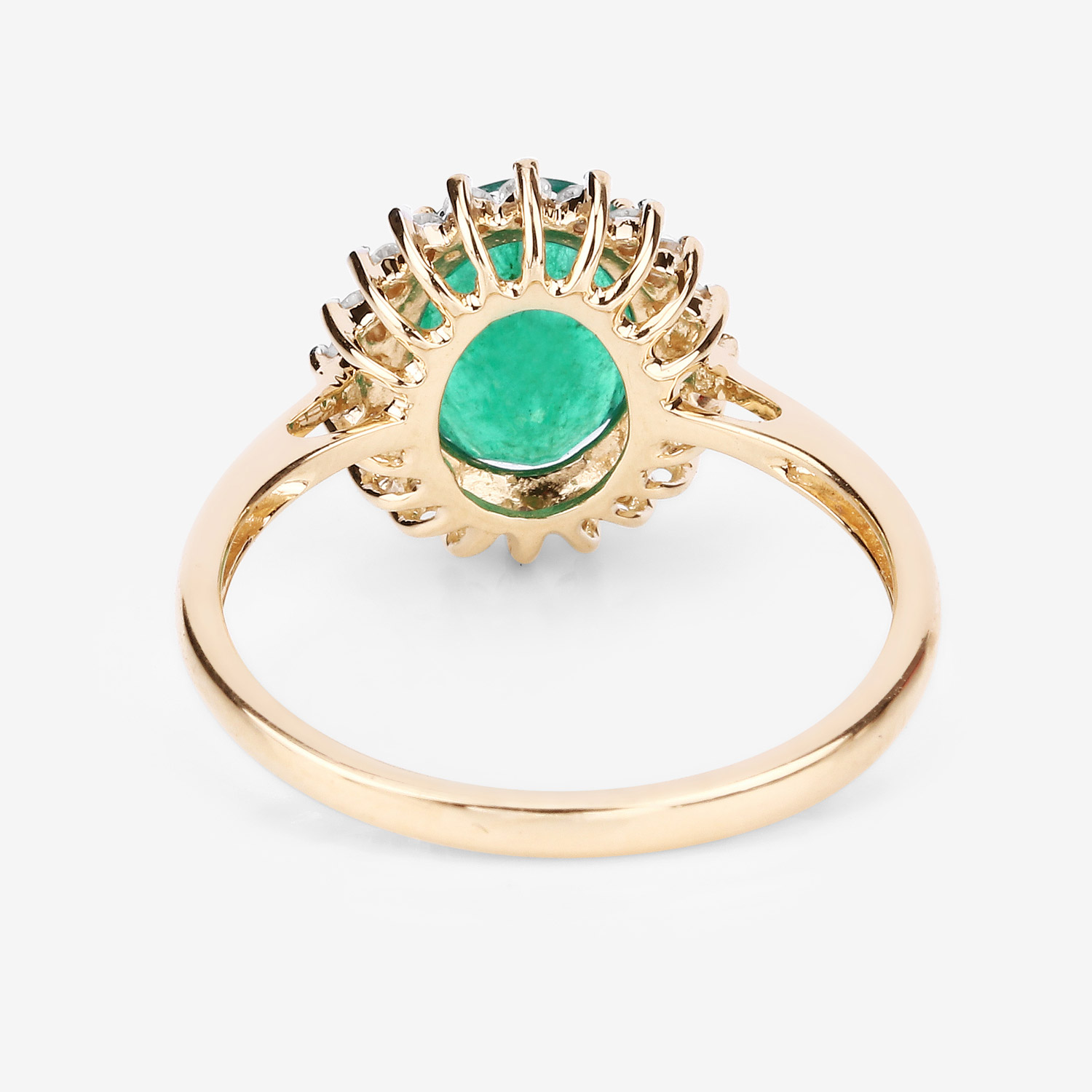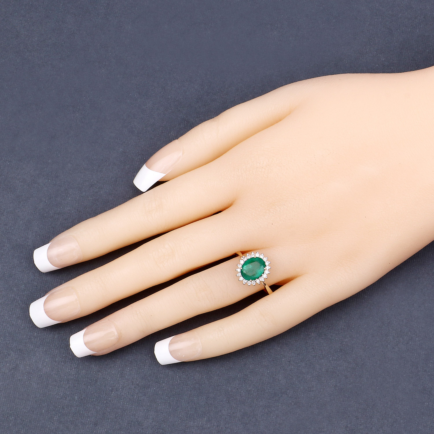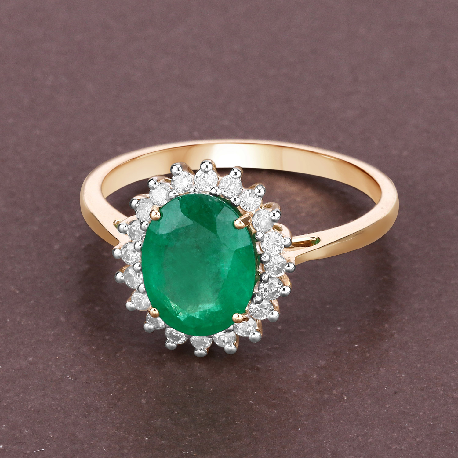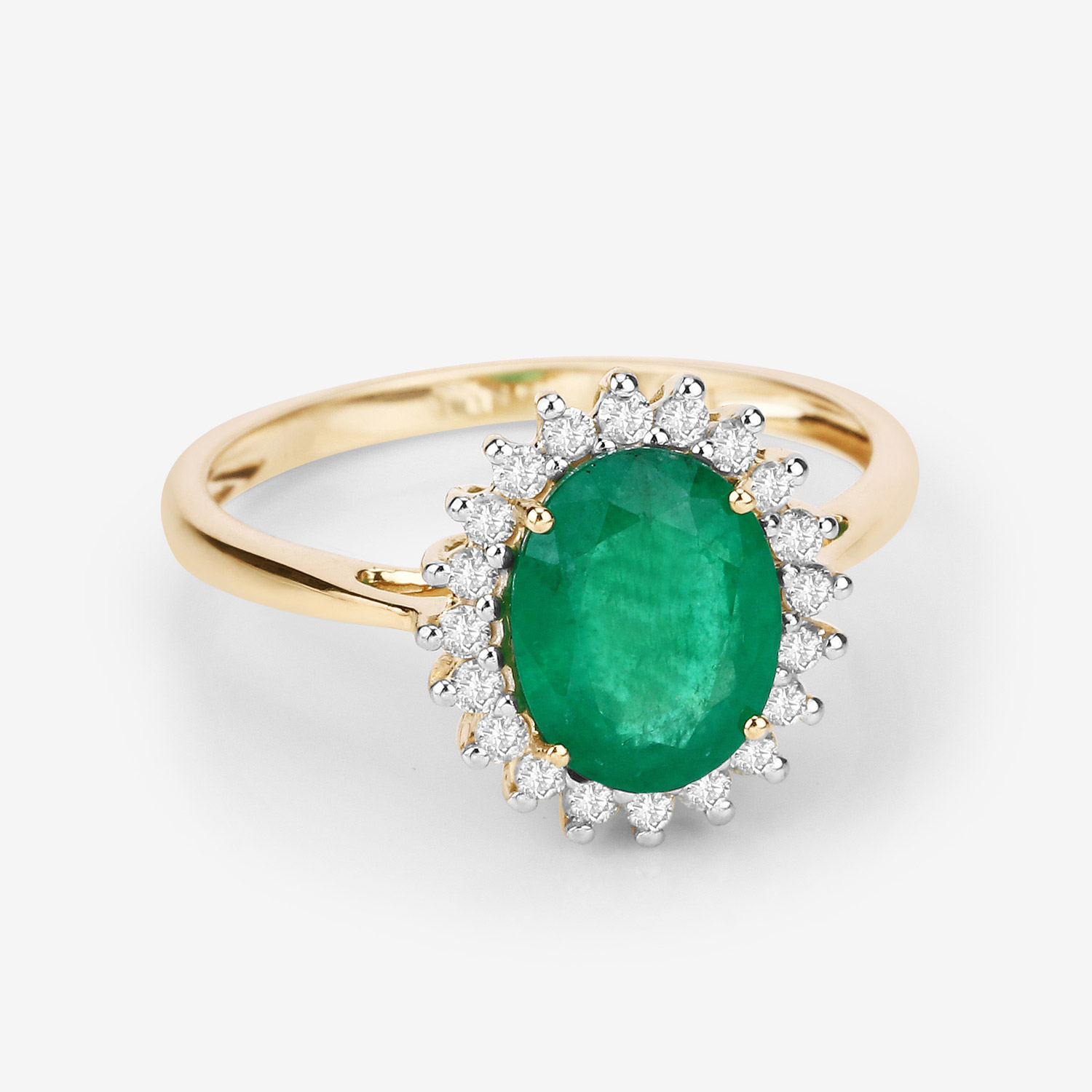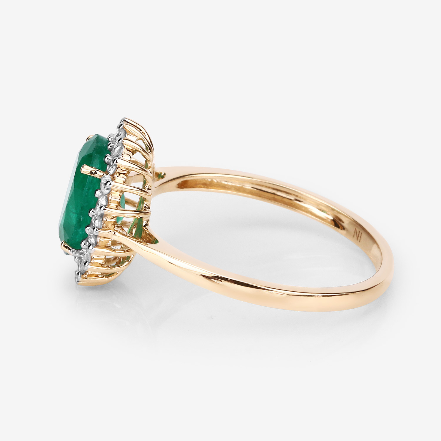 karat yellow gold 1.65 carat oval-cut, Zambian emerald is prong-set with .22 carats of round, brilliant-cut, H-I color, I1 clarity diamonds in the halo. The slightly raised shoulders taper to an approximate 1.75mm shank. The top of the ring spans approximately 1/2" between the knuckles. This ring is US size 7 and can be sized for an additional charge. Please contact Bidfair Fine Jewelry for sizing details. This is a brand new item, with approved from the manufacturer for sale to the public, by auction. It is in excellent condition, but may have fine scratches from shipping or transportation. Admin:Q741/16glr