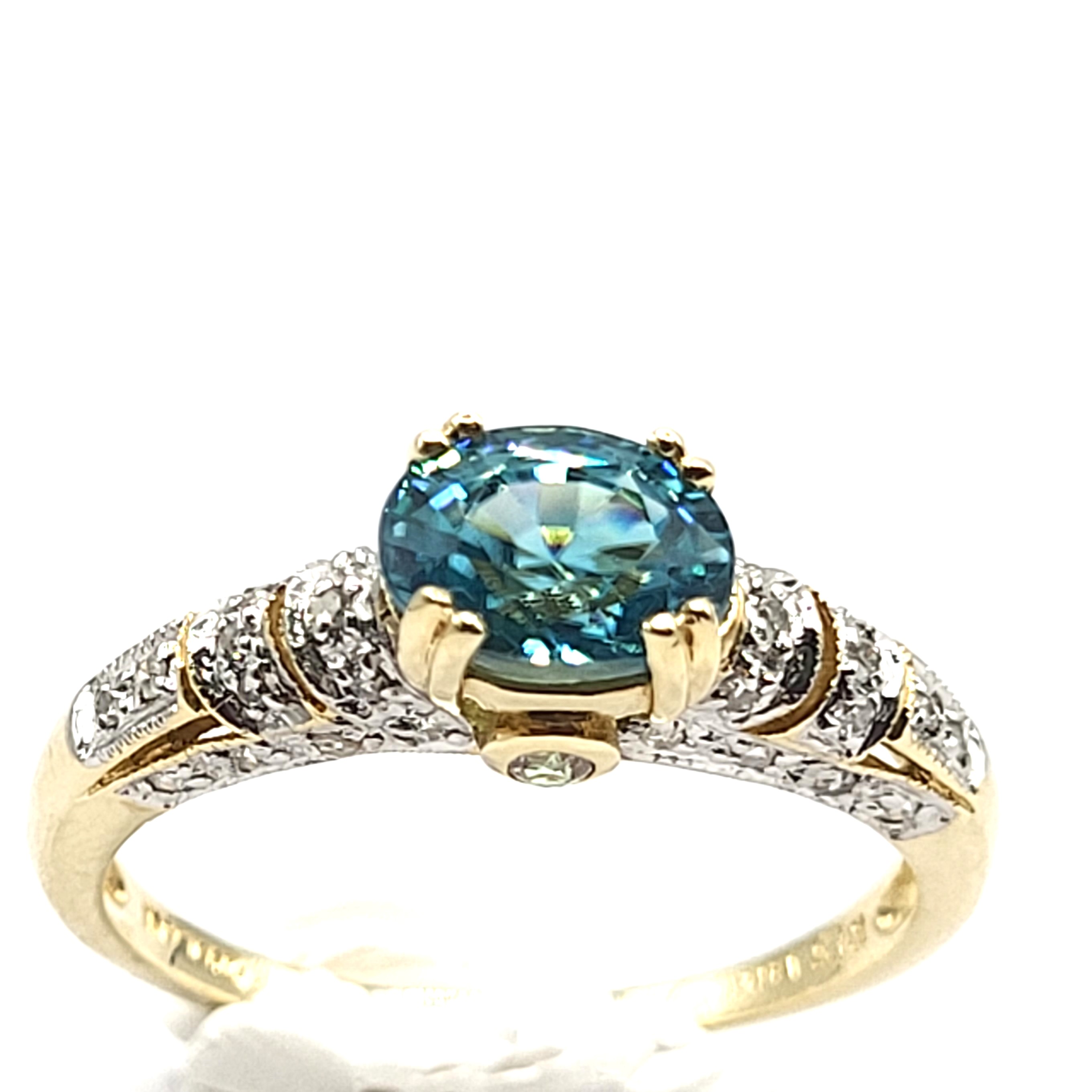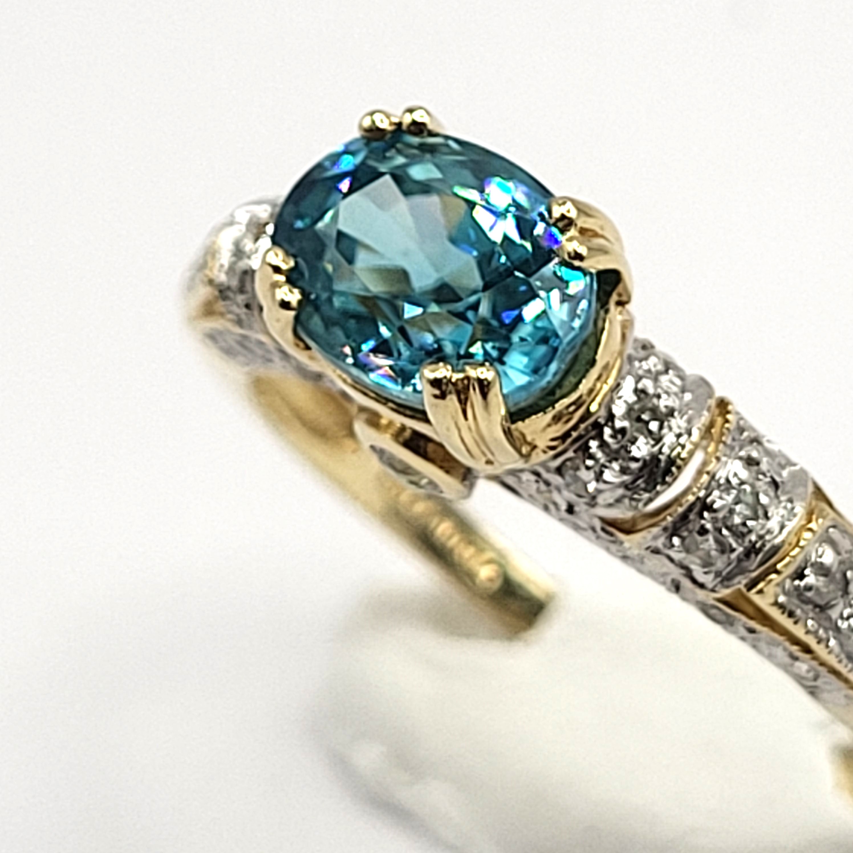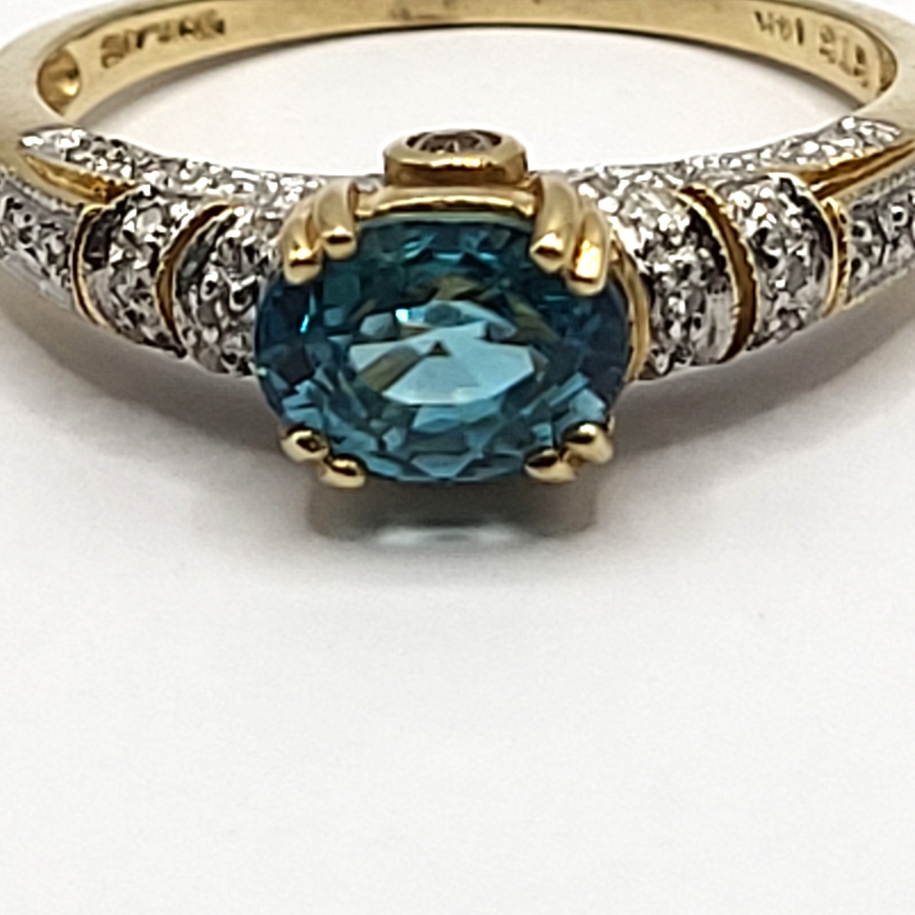 This is a 14 karat yellow gold ring that features a gorgeous oval-cut, East-West set with double prongs, genuine blue zircon, approximately 2.00 carats. There are .25 carats total weight of round, brilliant-cut diamonds in the bridge and along the shoulders. This ring is an approximate US size 10 and can be sized for an additional charge. Please contact Bidfair Fine Jewelry for sizing details. Admin: 33110/10lhb