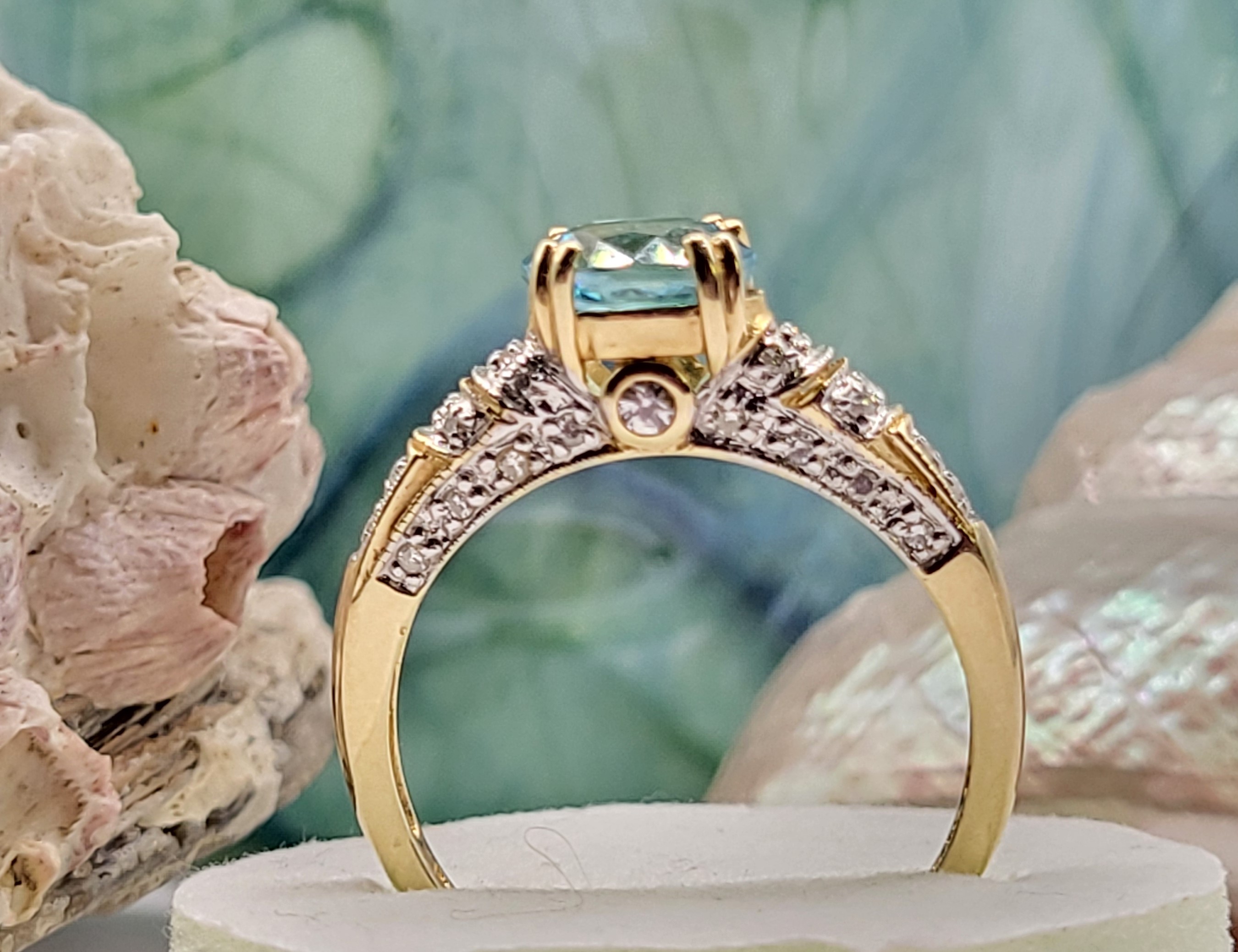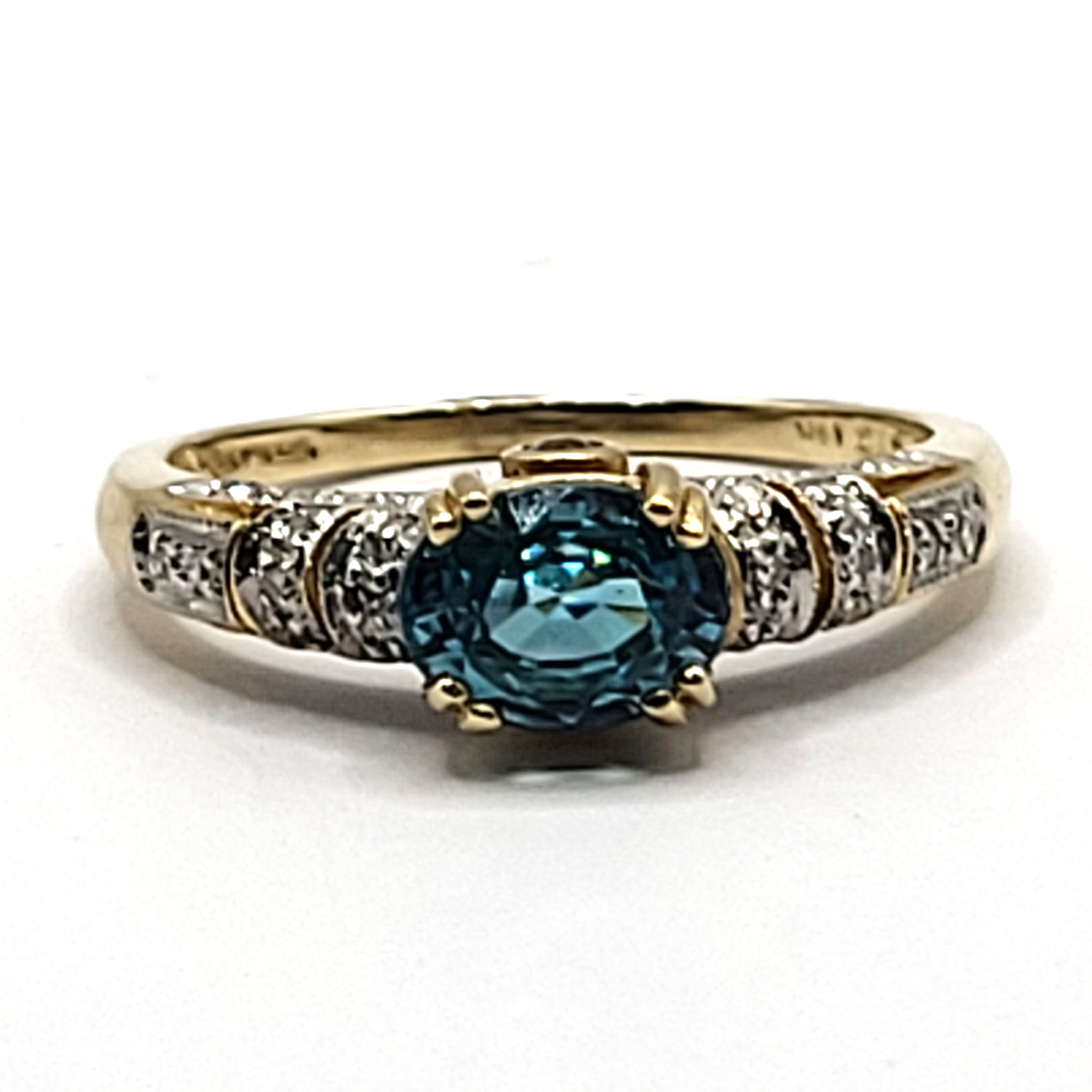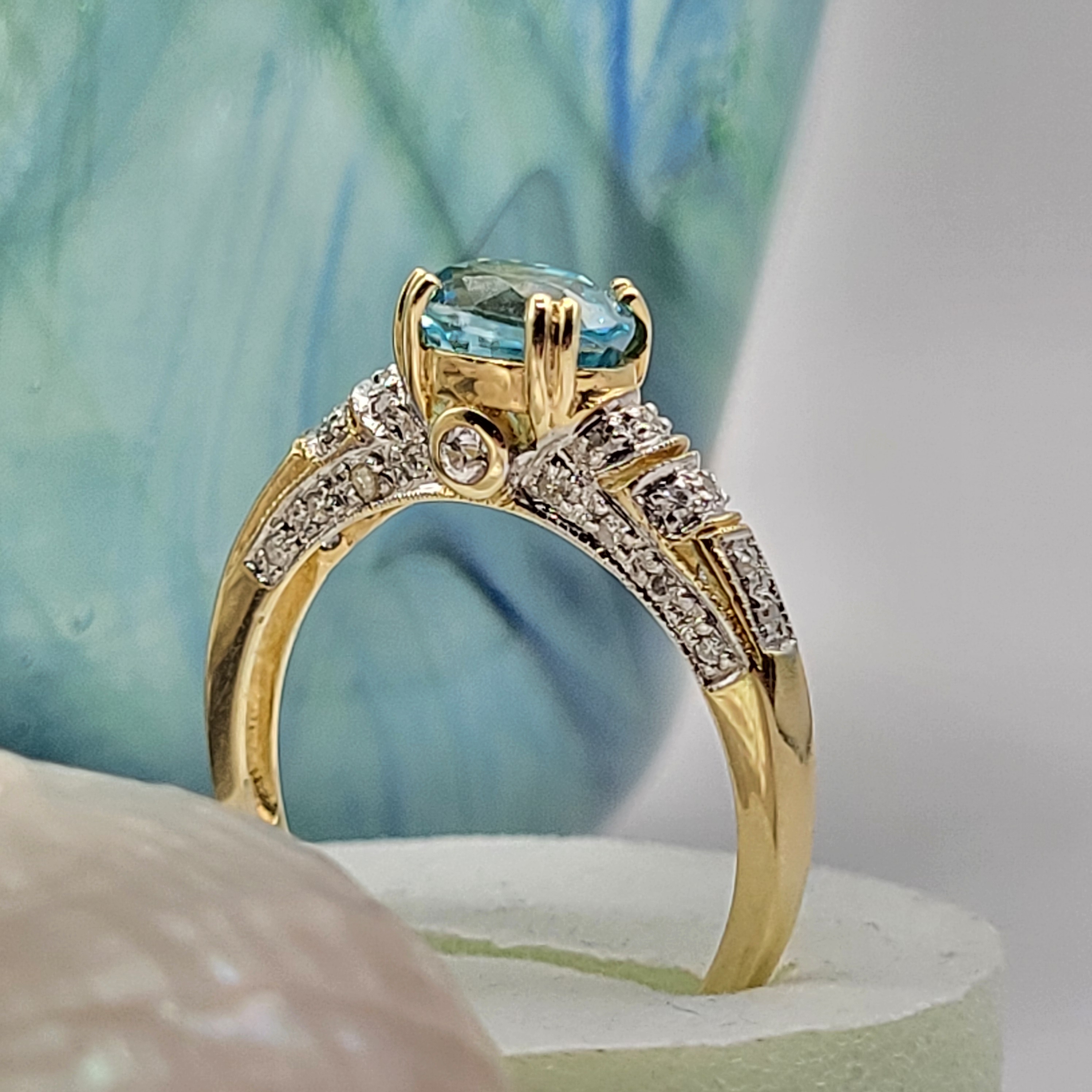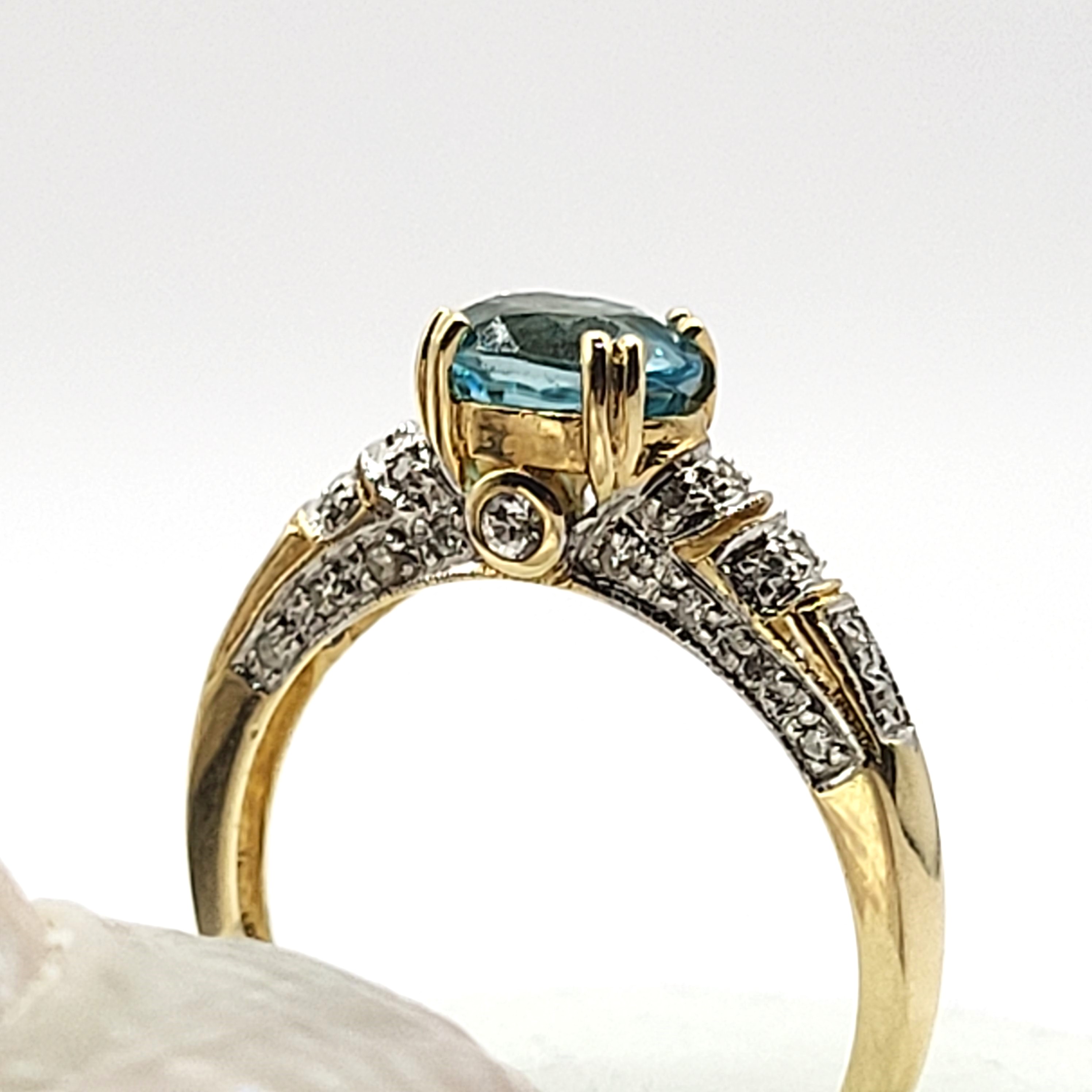 This is a 14 karat yellow gold ring that features a gorgeous oval-cut, East-West set with double prongs, genuine blue zircon, approximately 2.00 carats. There are .25 carats total weight of round, brilliant-cut diamonds in the bridge and along the shoulders. This ring is an approximate US size 10 and can be sized for an additional charge. Please contact Bidfair Fine Jewelry for sizing details. Admin: 33110/10lhb