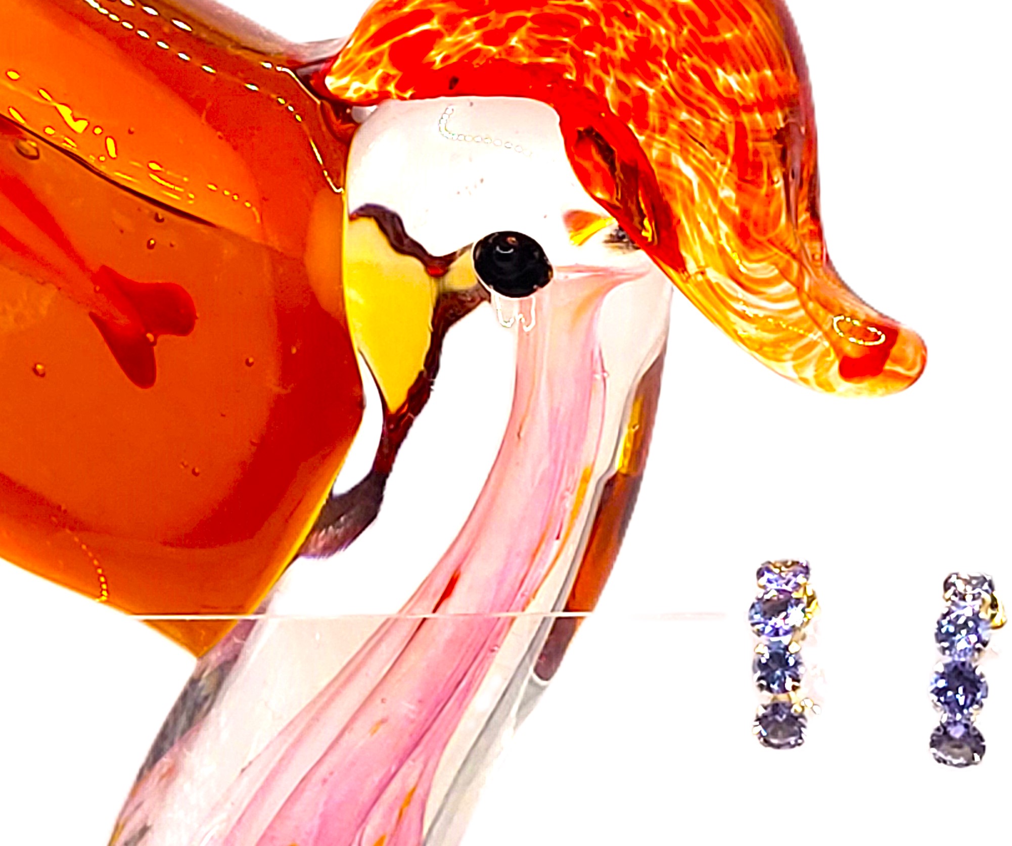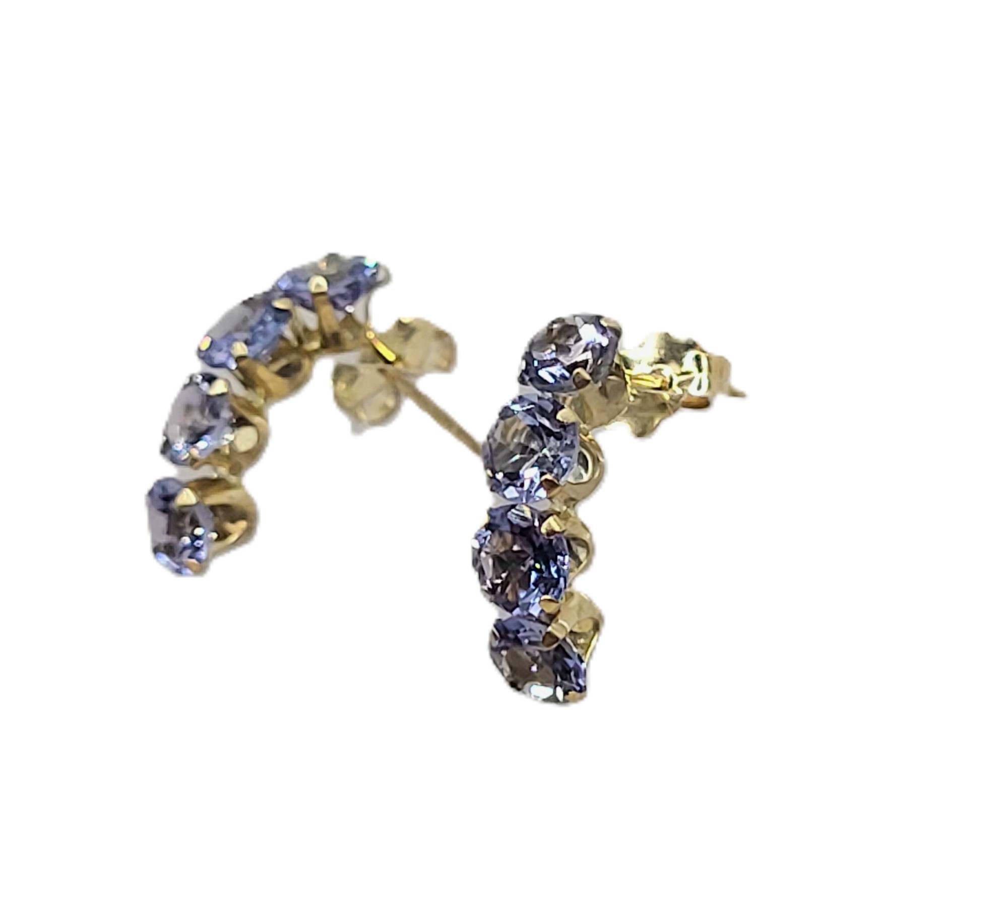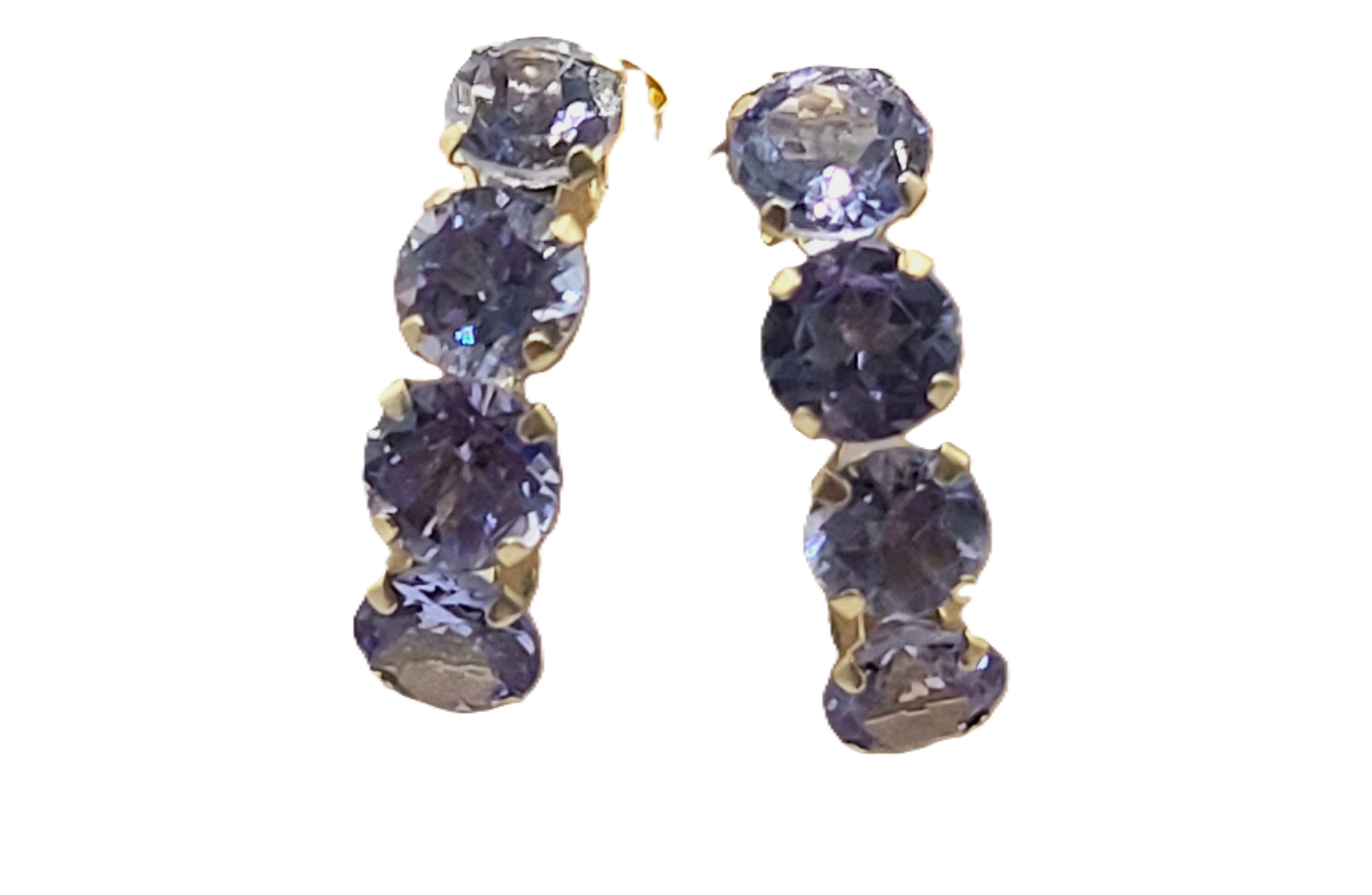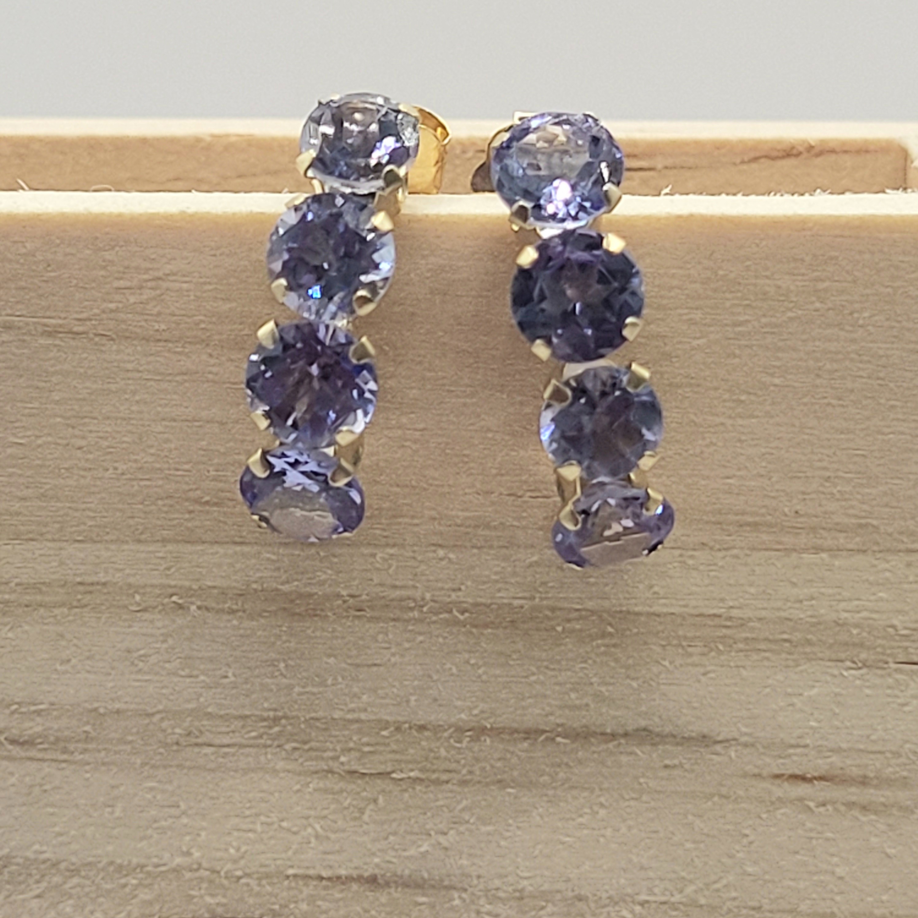 These 14 karat yellow gold earrings feature 2.00 carats total weight of round, faceted, prong-set, genuine tanzanite that are the perfect color for either winter or summer! They are approximately 5/8" long and 3/16" wide and attach to the earlobe with posts and friction backs. Admin:G11241/29brt