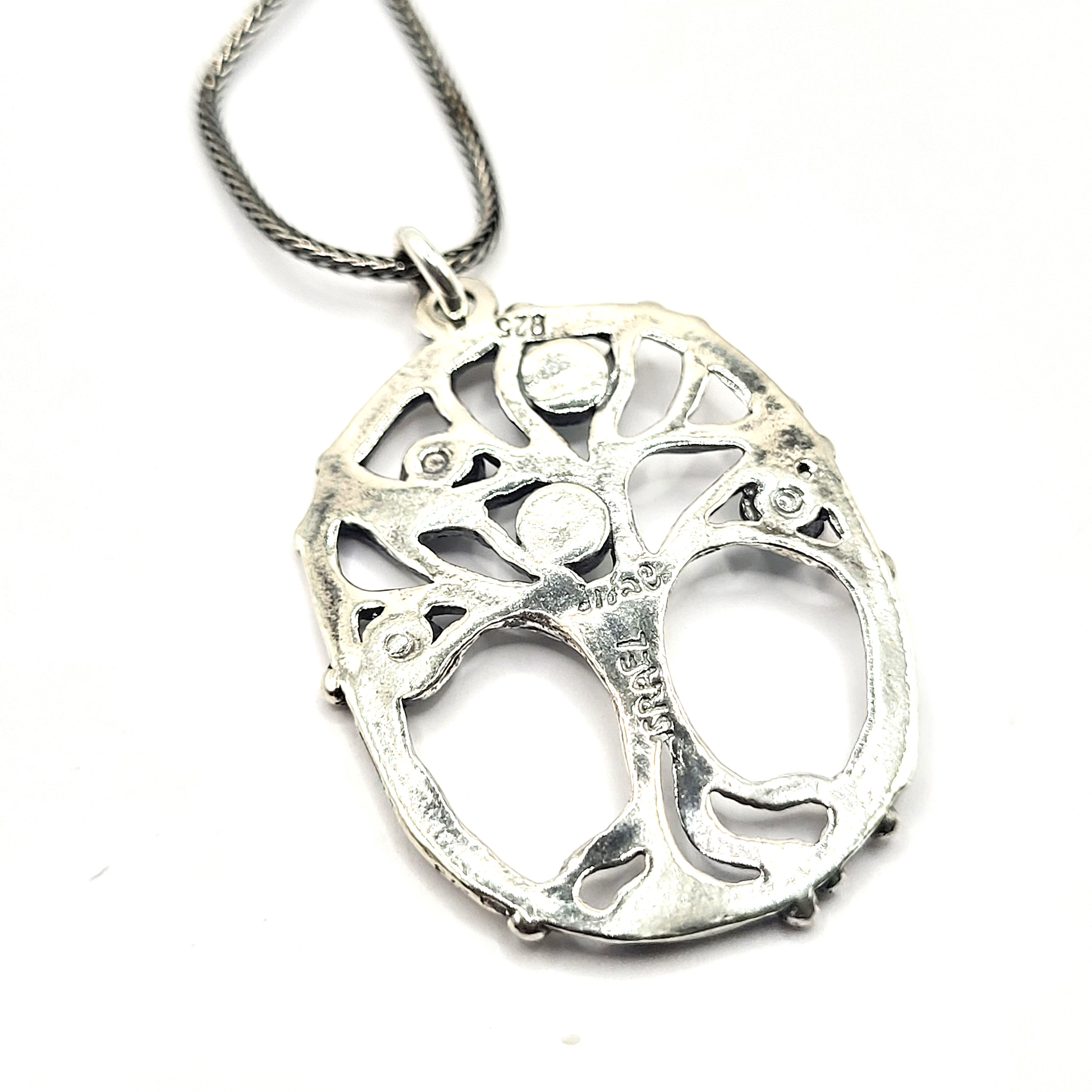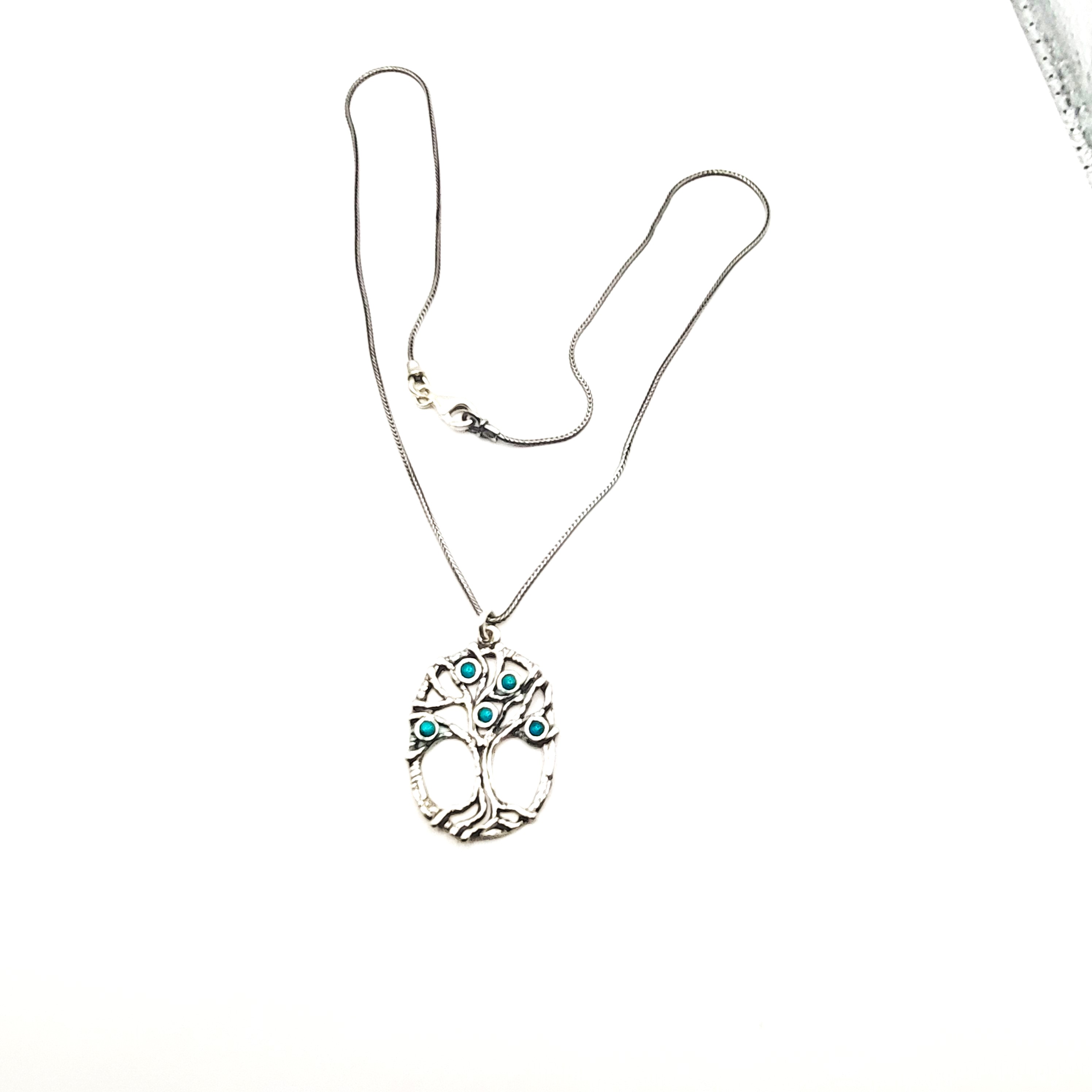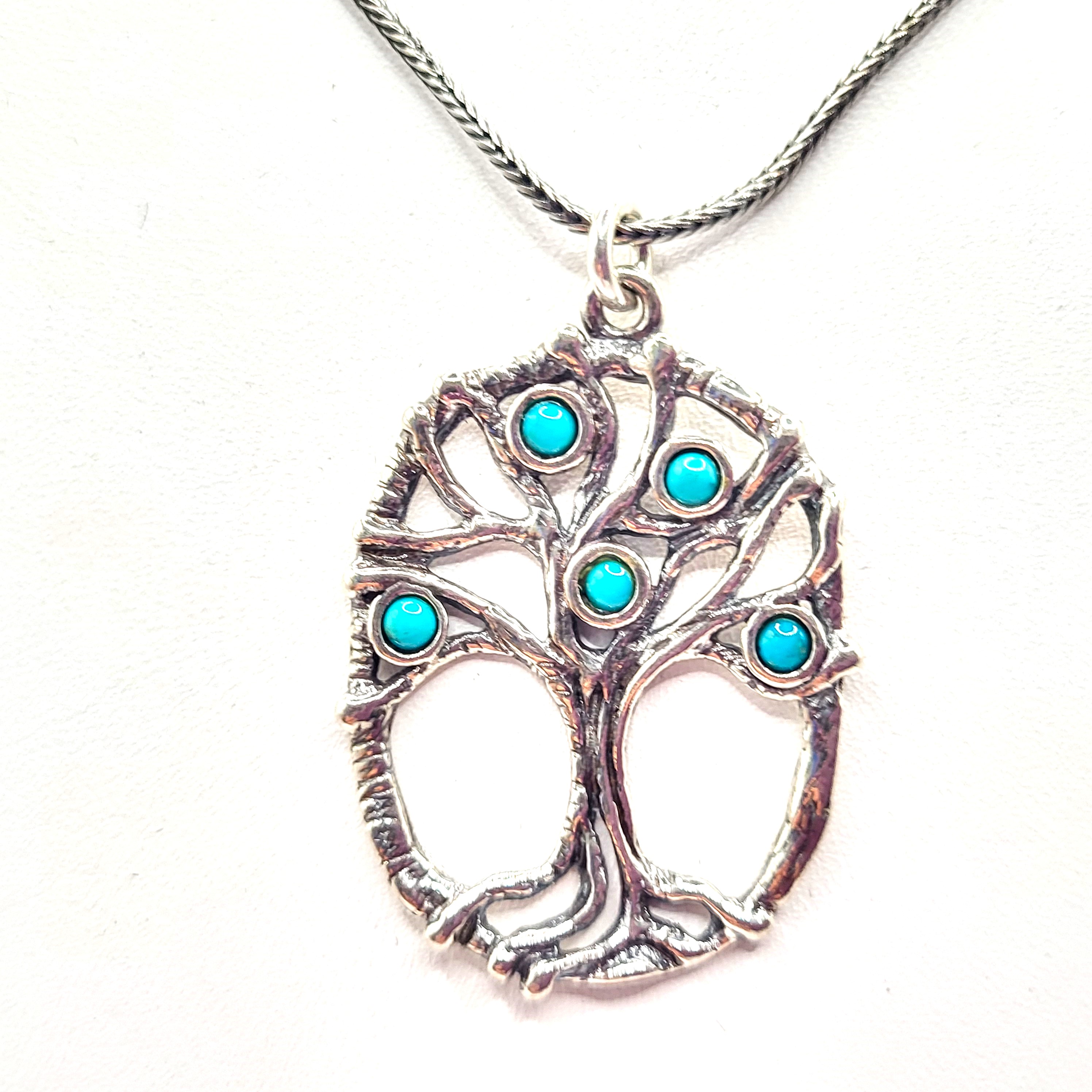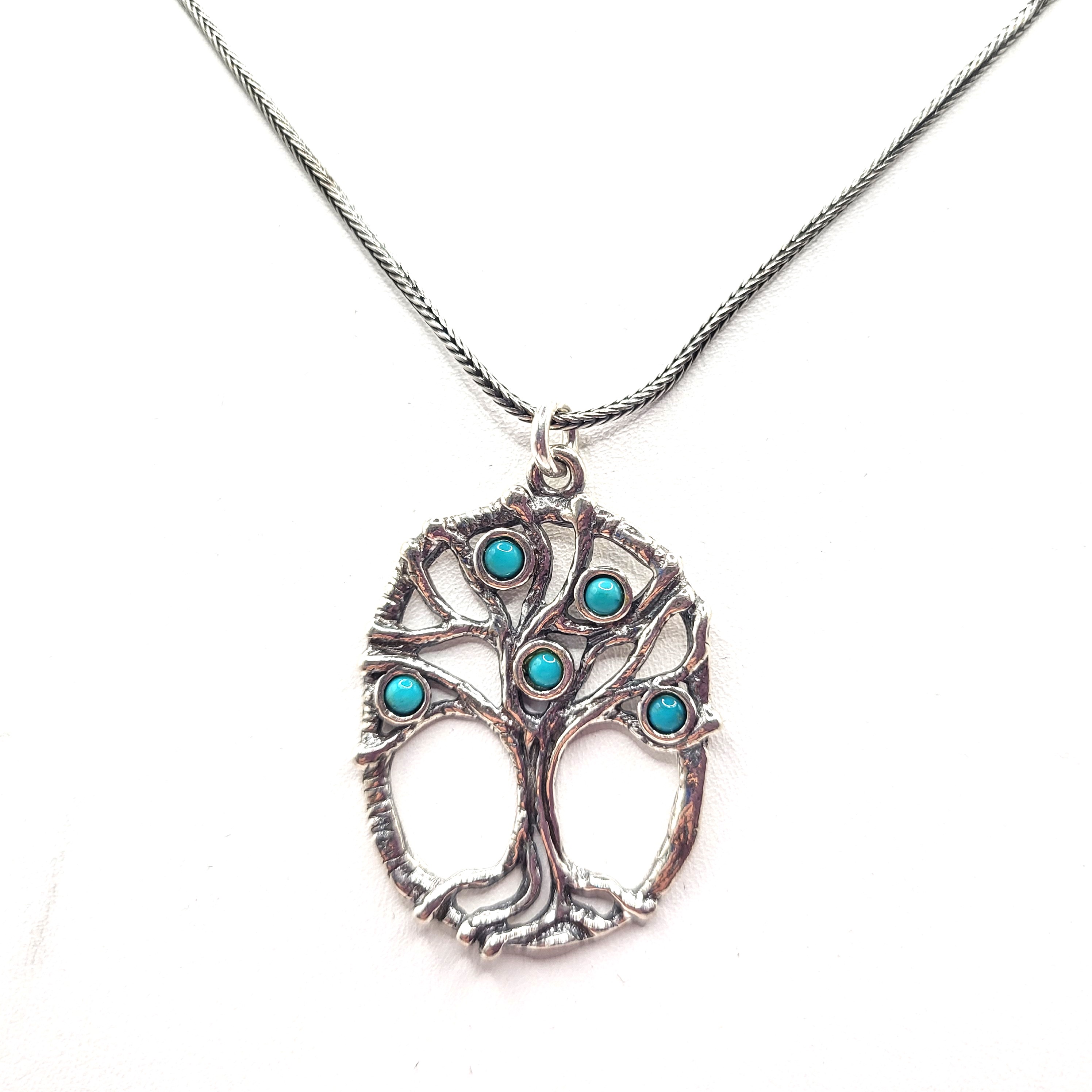 This sterling silver (.925) necklace, signed Didae, ISRAEL and .925 on back and features turquoise blue Murano glass beads in the Tree of Life. The tree is displayed inside an oval frame and hangs from an 18" sterling silver wheat chain with a lobster clasp. The pendant is approximately 1 3/8" x 1". Admin: