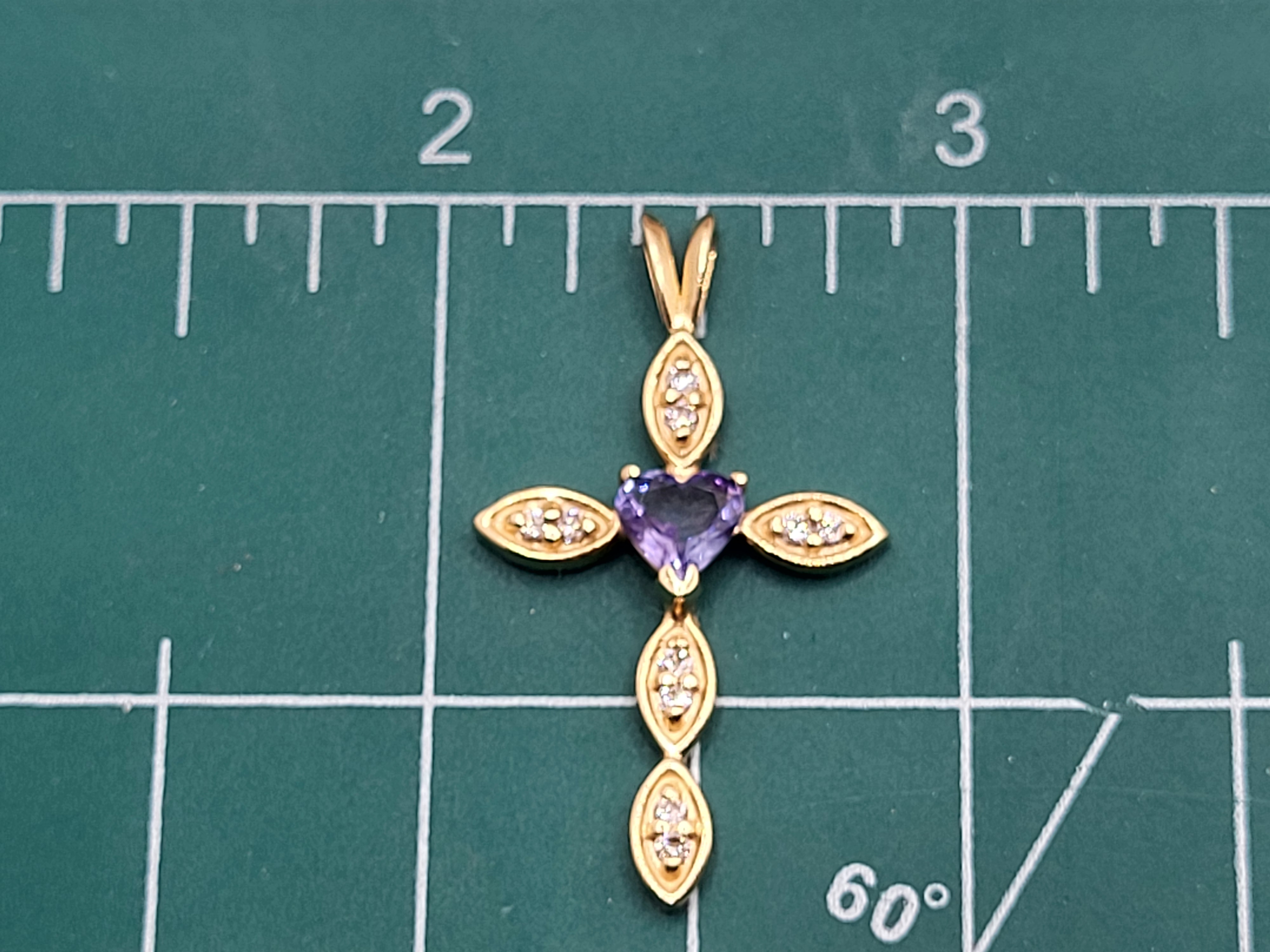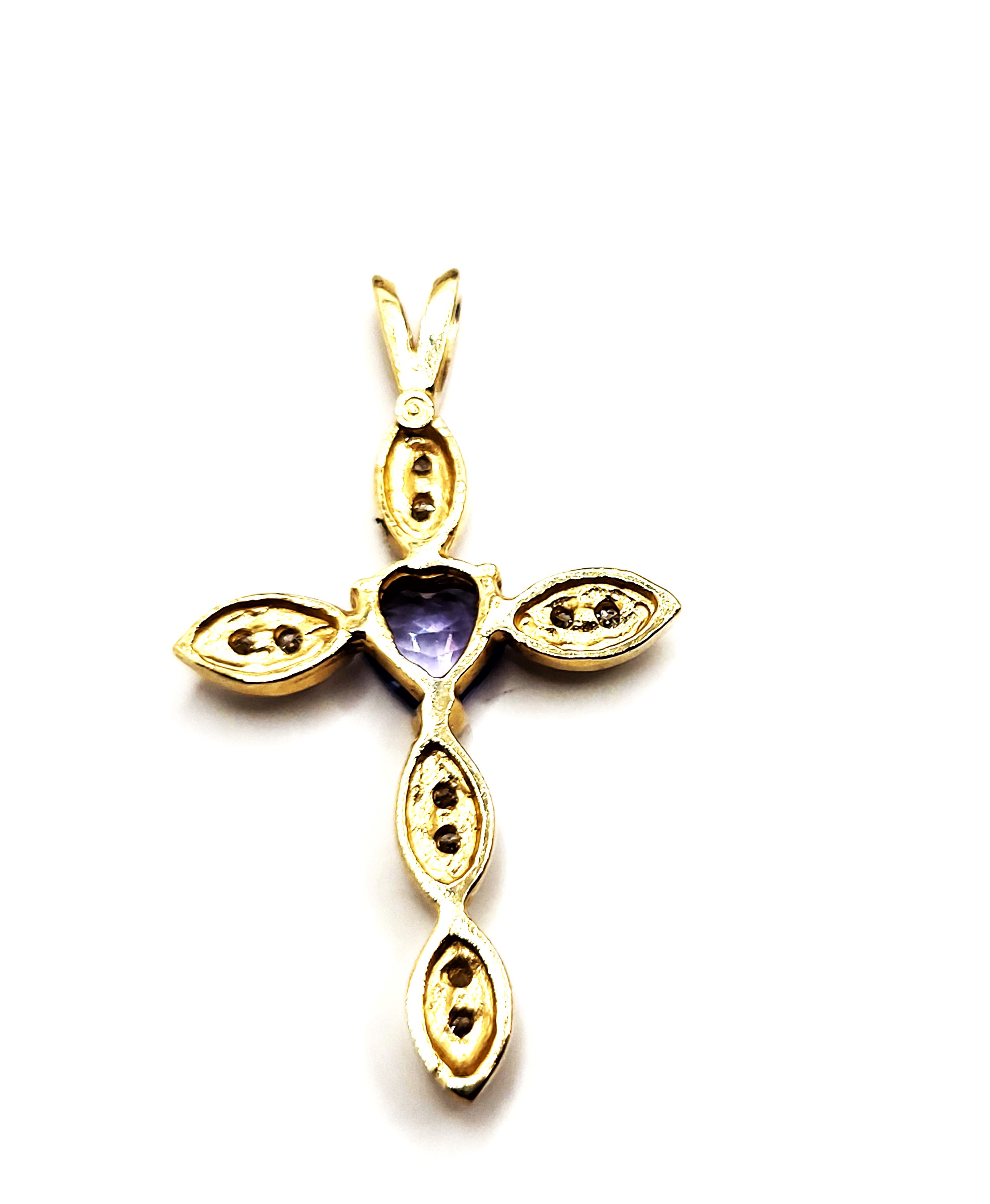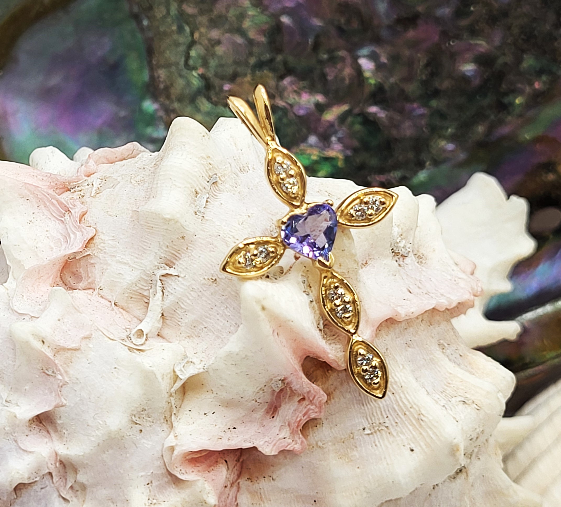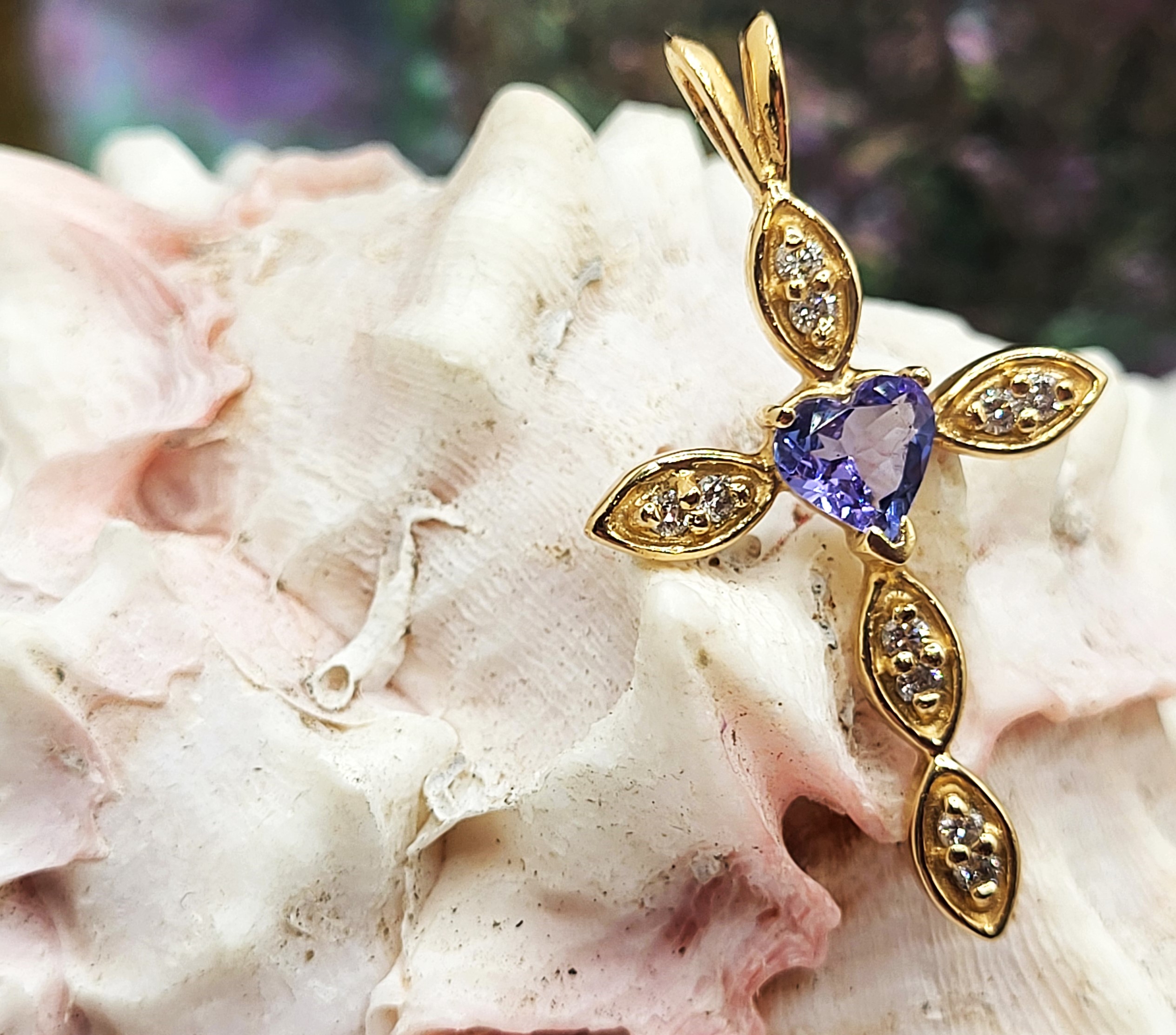 This is a 14 karat yellow gold cross pendant with an approximate .55 carat heart-cut, prong-set, genuine tanzanite and approximately .20 carat total weight of round, brilliant-cut, H, SI2-I1 clarity diamonds on the rail and arms. The cross is approximately 1.25" tall and 7/8" wide and the rabbit ear bail can accommodate an approximate 1.25mm thick chain. Admin: G11241/14ilt