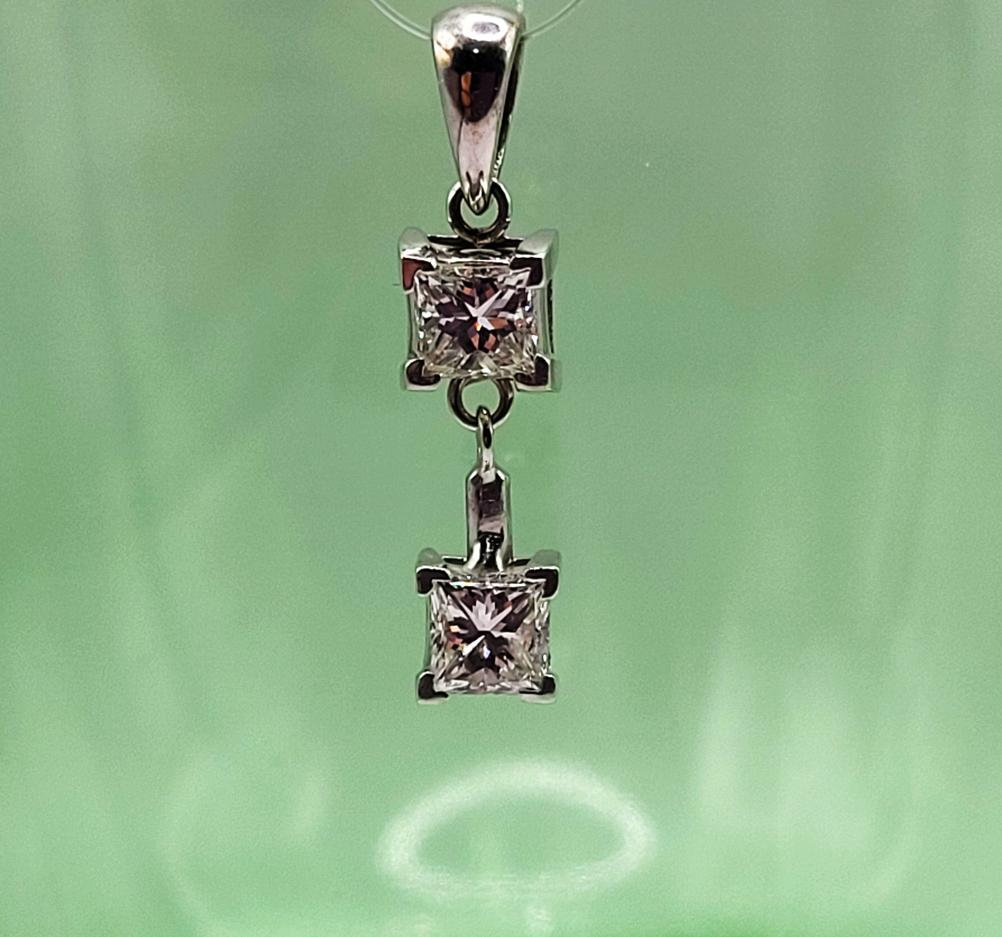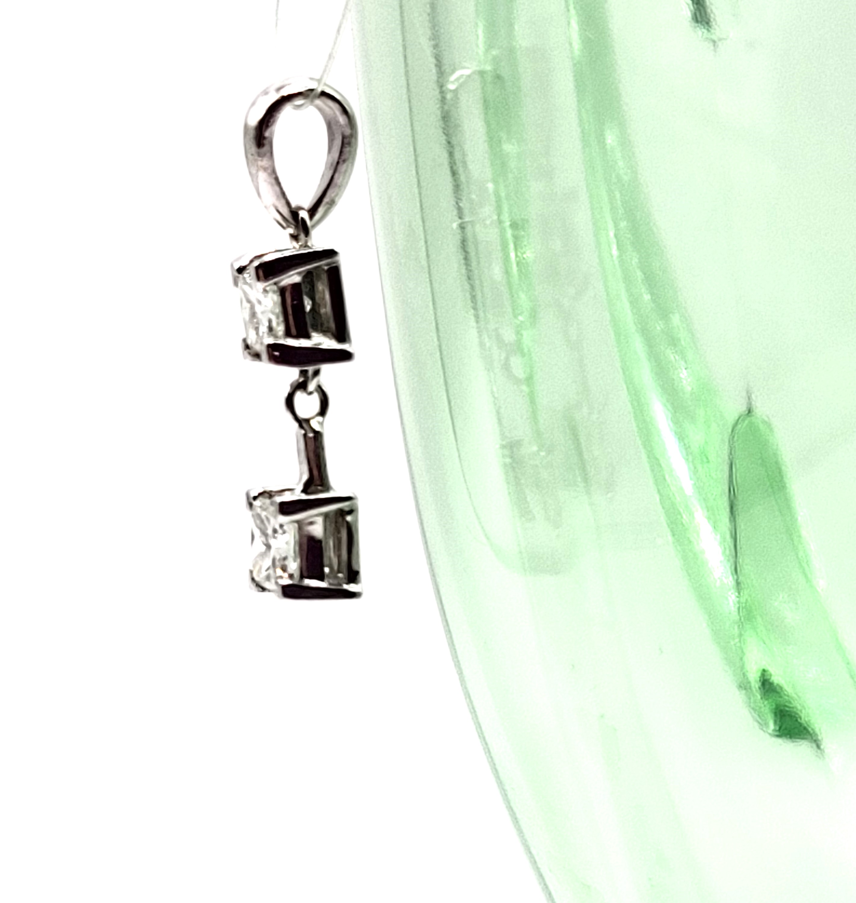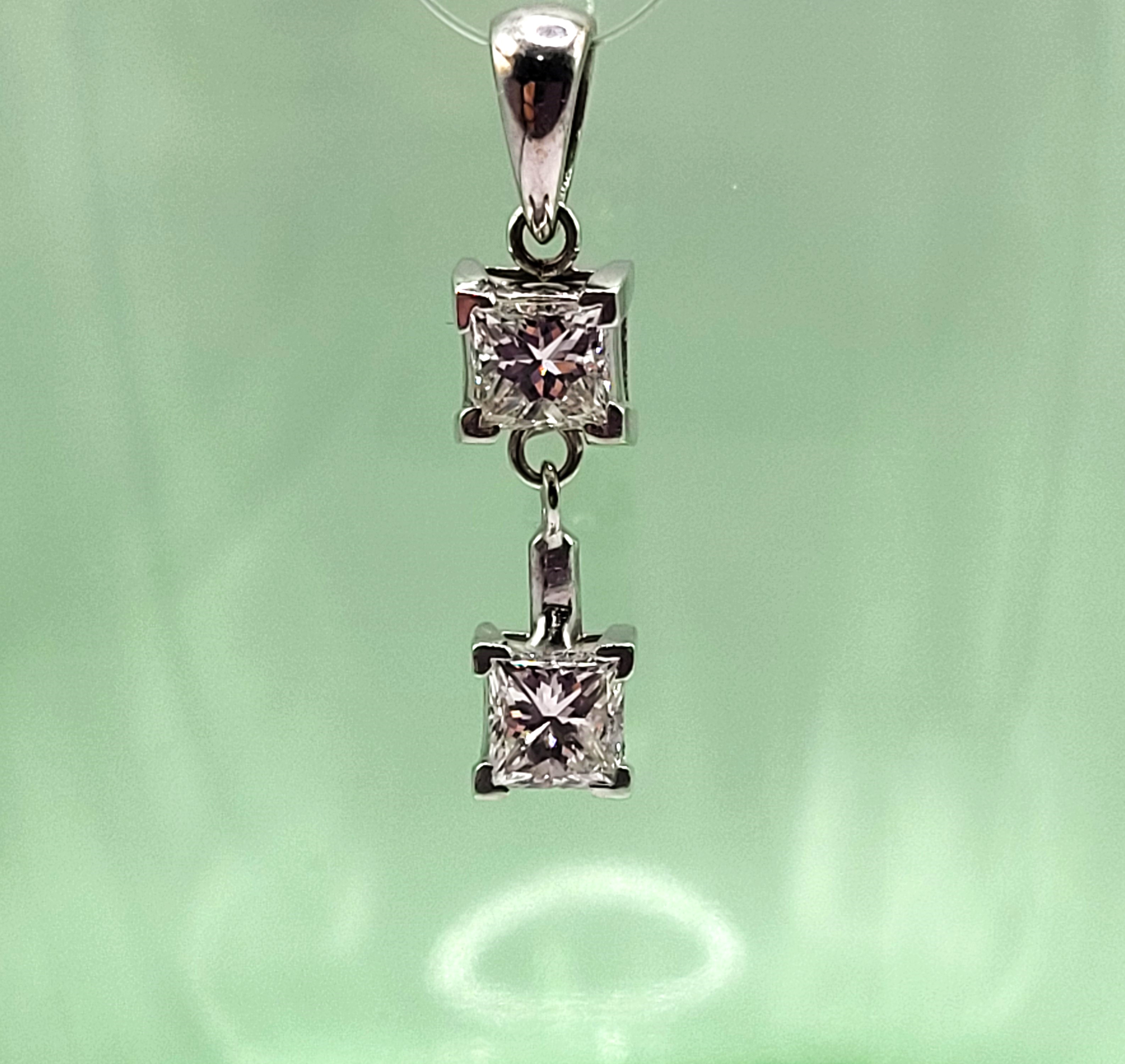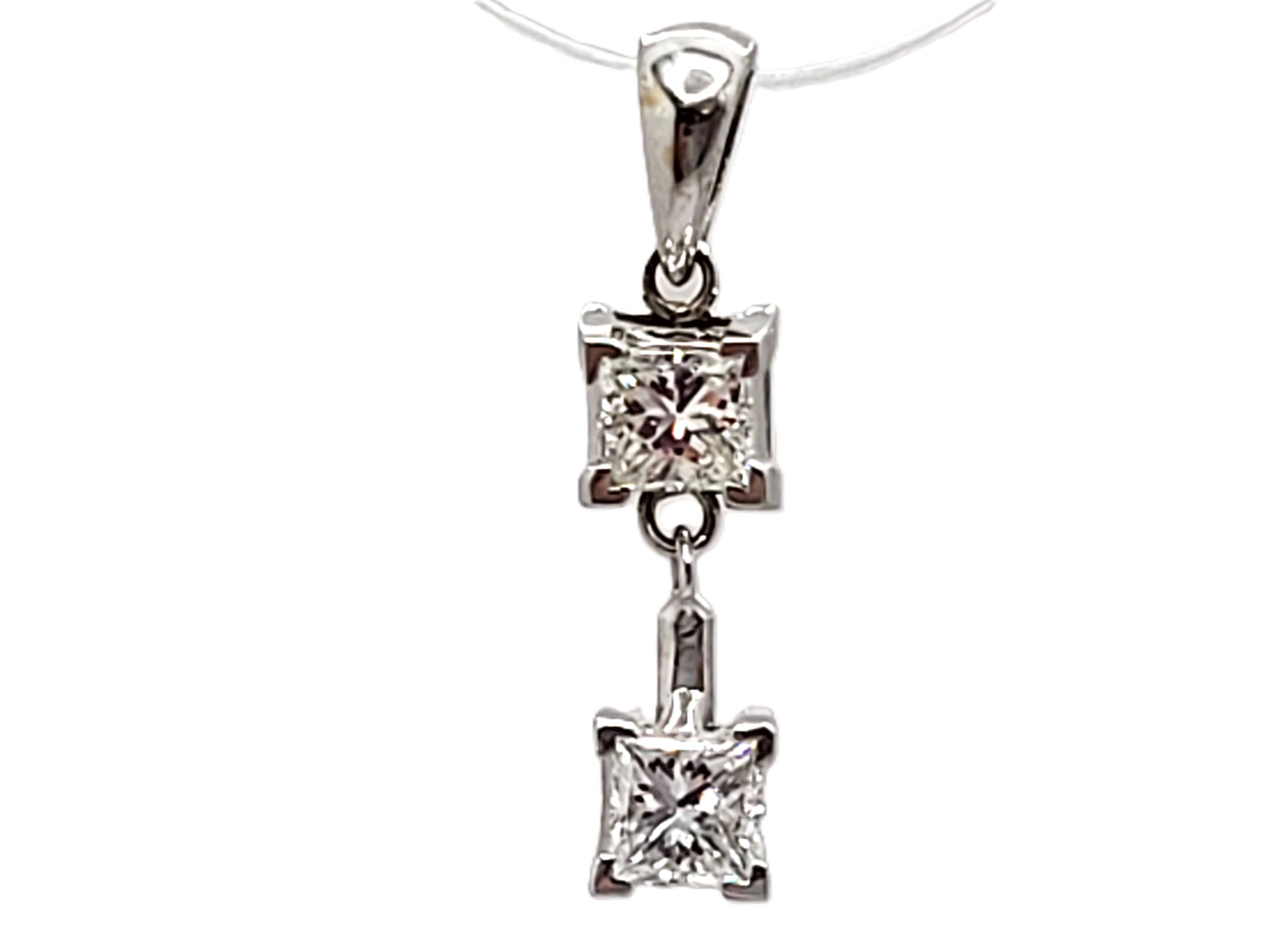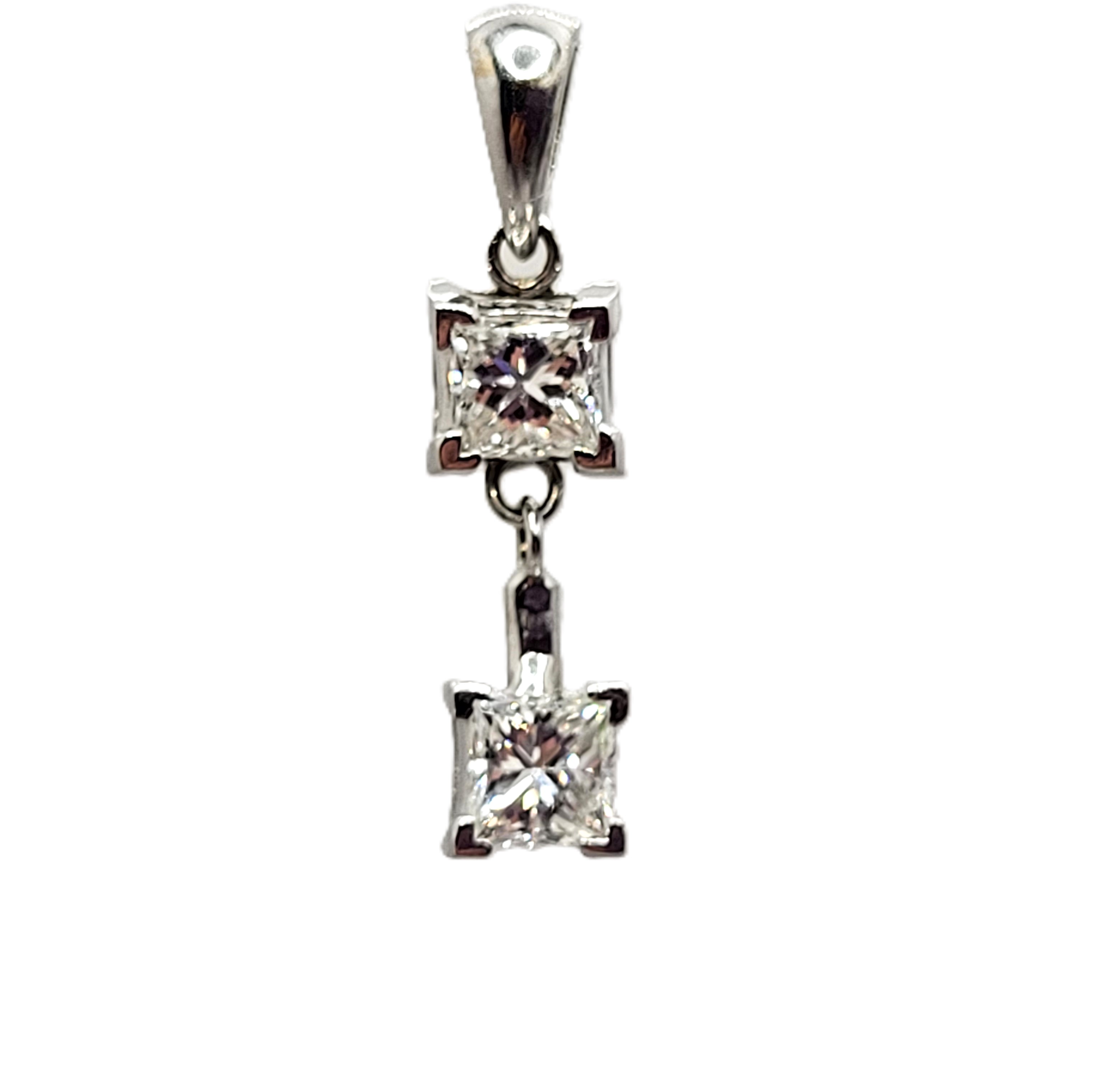 This pendant features two diamonds that are set in 14 karat white gold and attached as hinged links to create and more moveable dangle. The diamonds are approximately .75 carats total weight princess-cut, (one is approximately .37 carat and the other .38 carat), and approximately H-I color, and both are approximately SI1. The pendant is approximately 7/8" long with a solid bail that can accommodate an approximate 2.75mm wide chain. Admin:F1226/75hhh