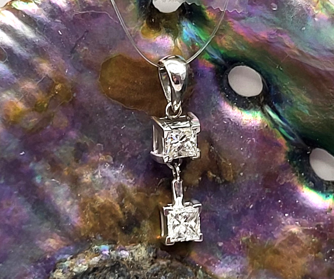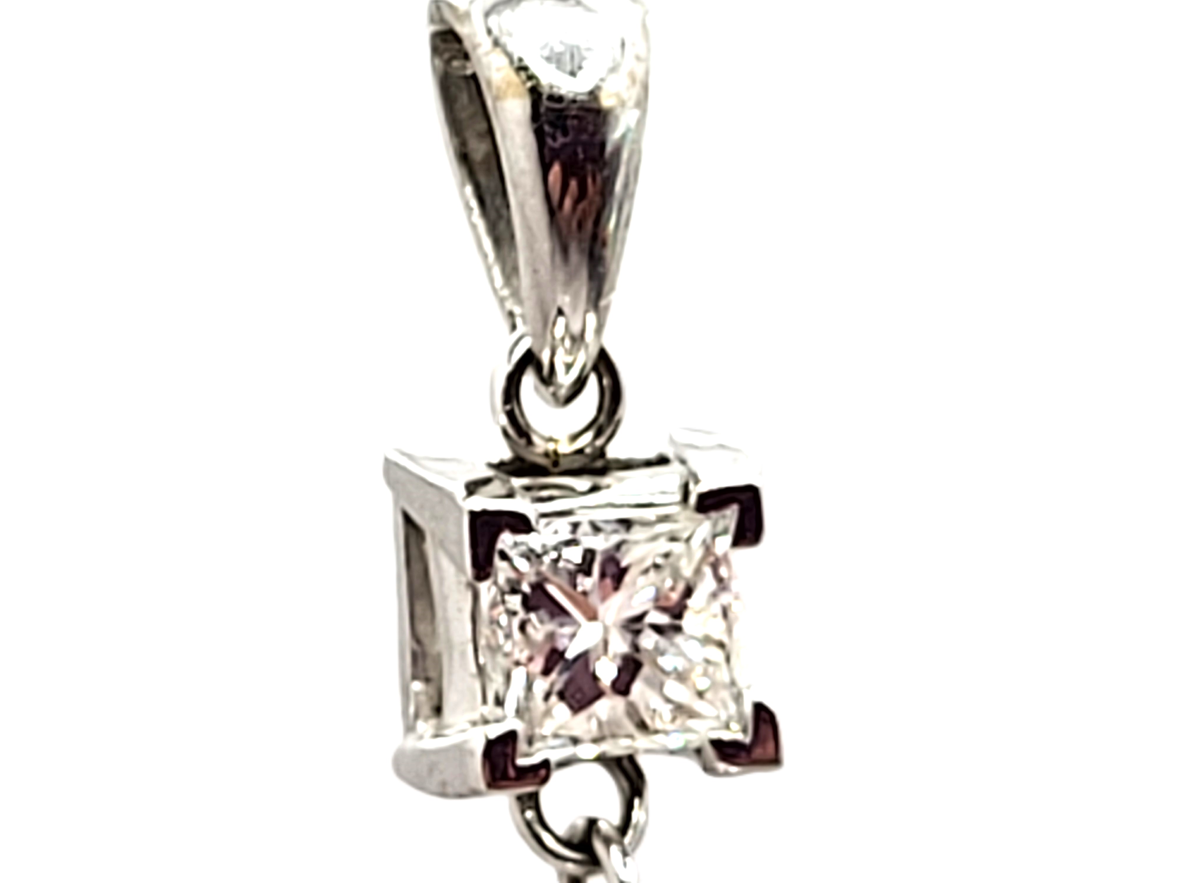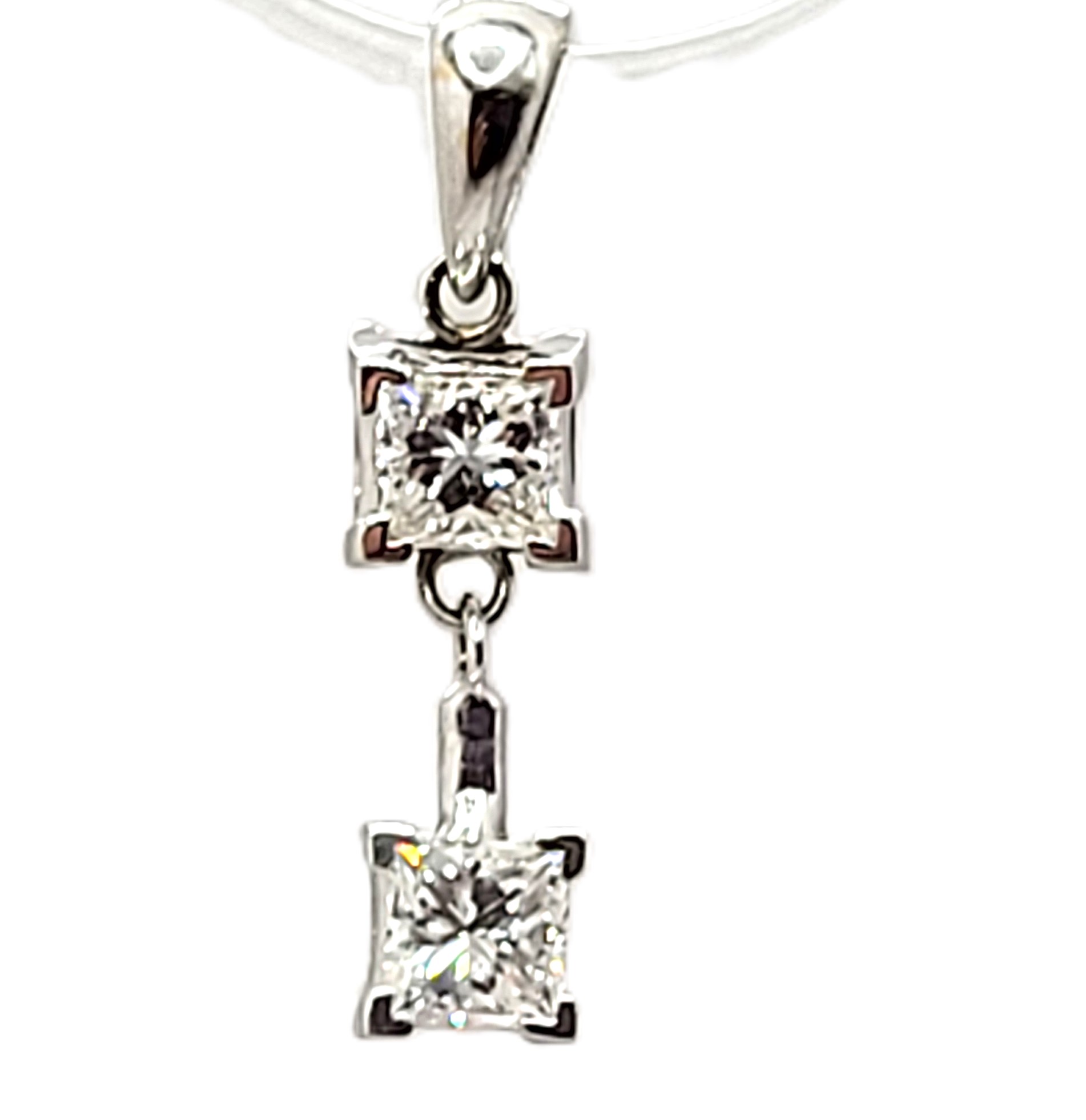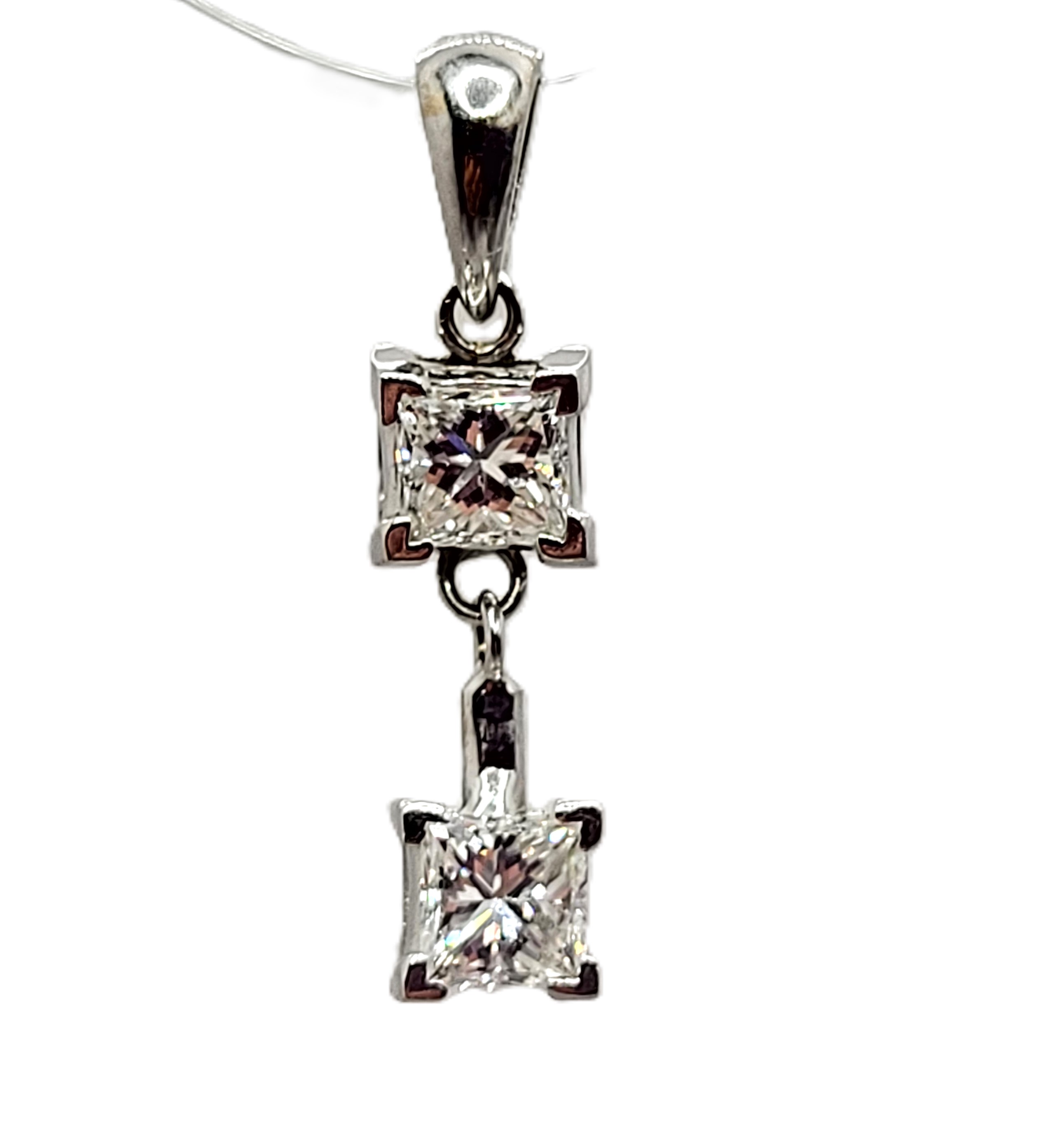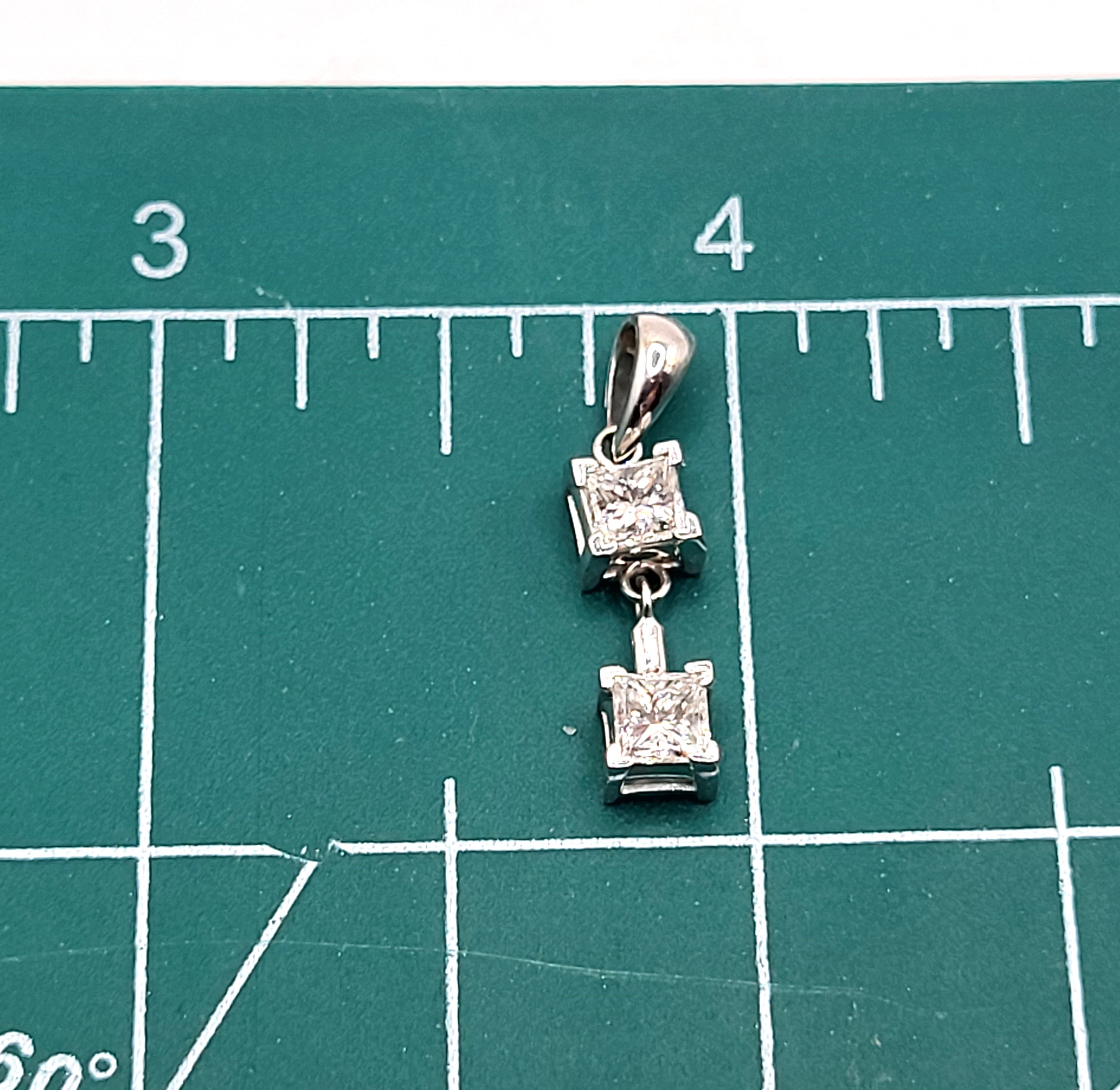 This pendant features two diamonds that are set in 14 karat white gold and attached as hinged links to create and more moveable dangle. The diamonds are approximately .75 carats total weight princess-cut, (one is approximately .37 carat and the other .38 carat), and approximately H-I color, and both are approximately SI1. The pendant is approximately 7/8" long with a solid bail that can accommodate an approximate 2.75mm wide chain. Admin:F1226/75hhh